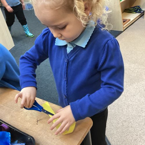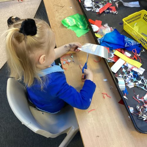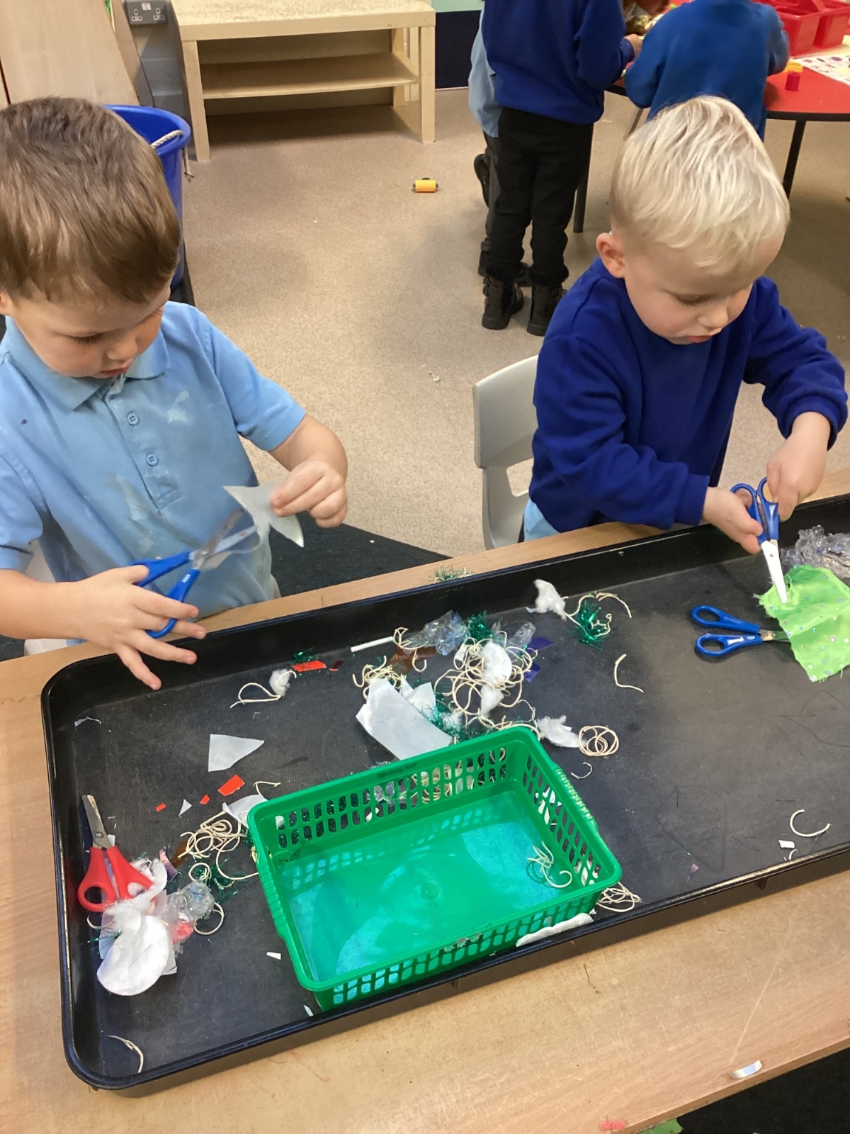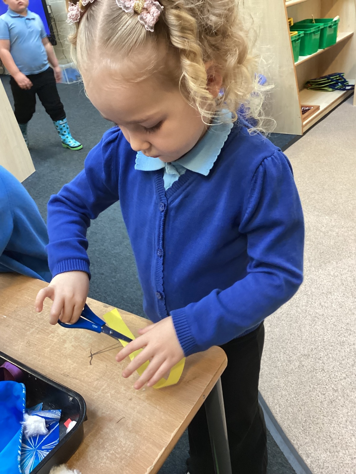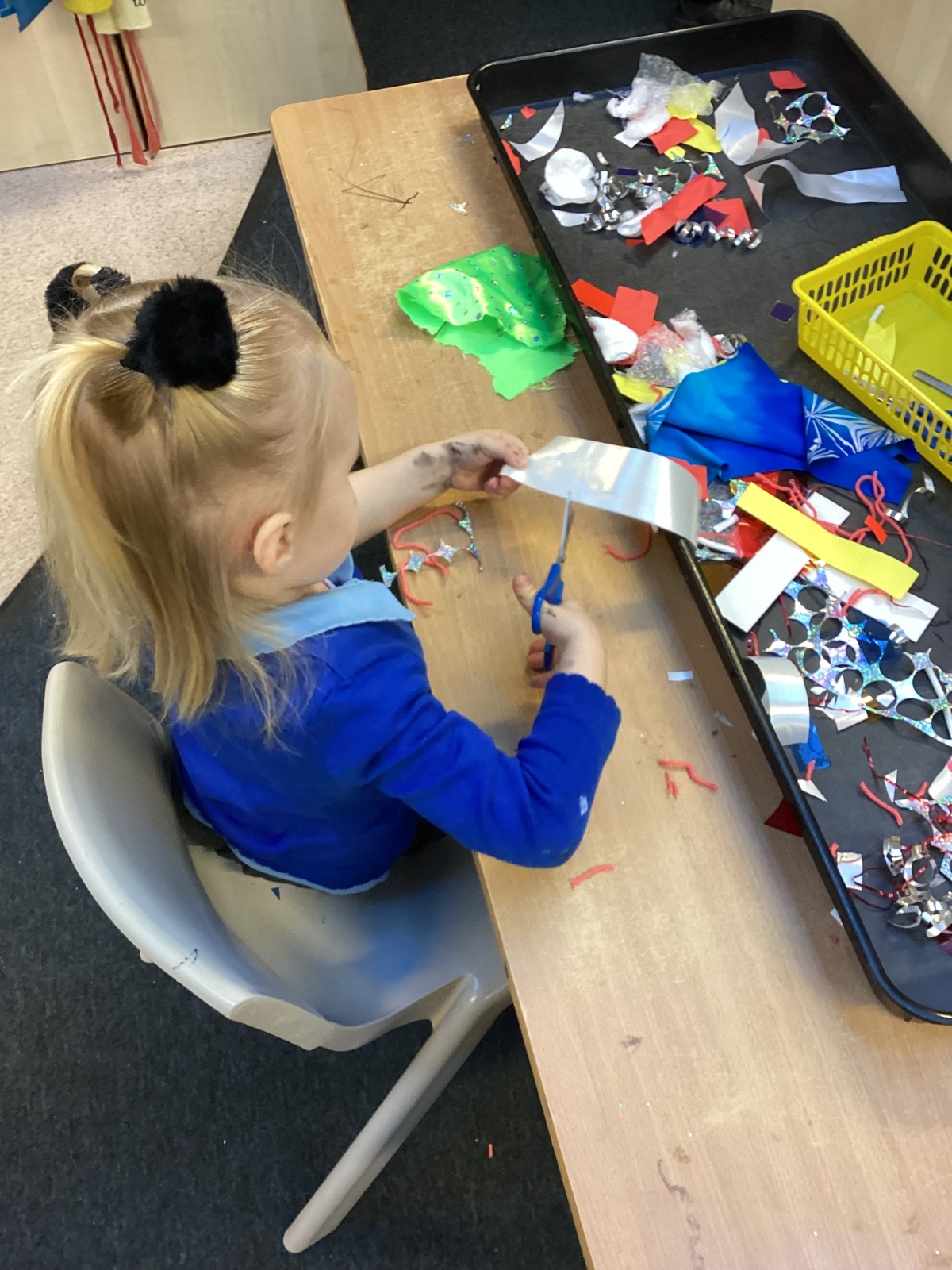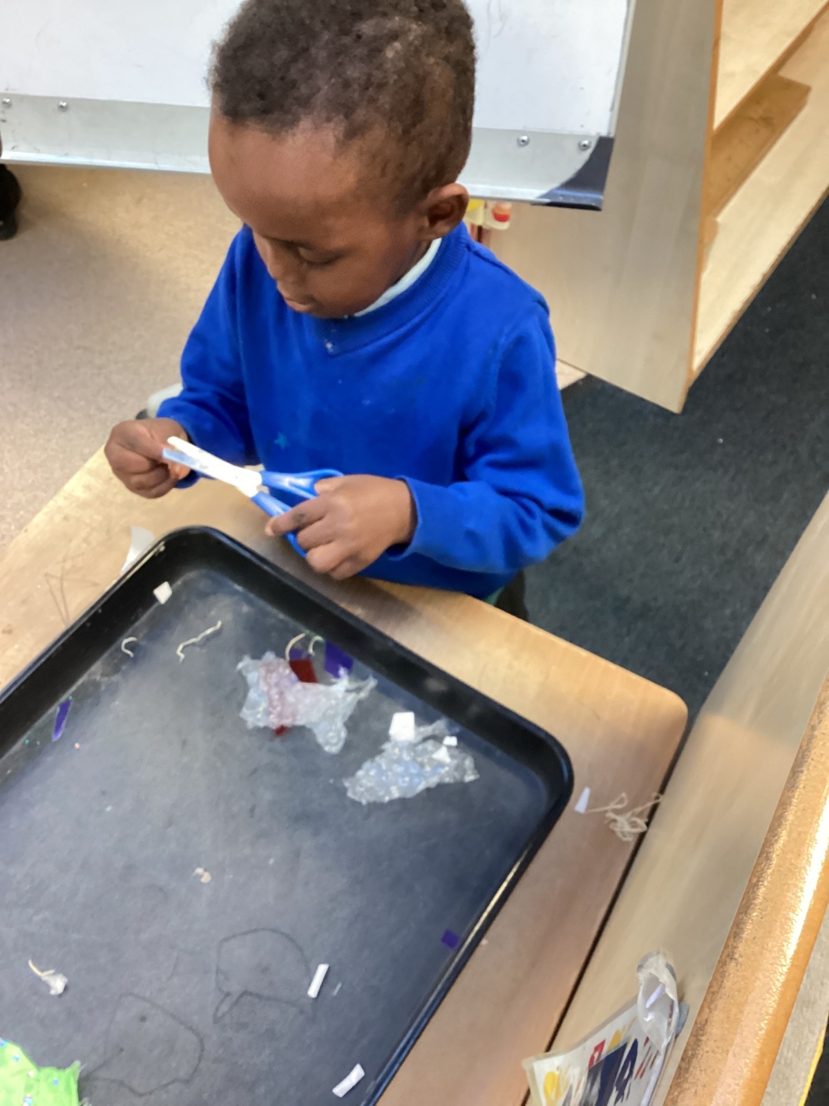 This week we have been developing our fine motor skills by exploring lots of interesting things to cut through. Some items are easy to cut through whilst others are quite difficult! We then have been using the bits that we have cut to make some beautiful creations over on the collage table.