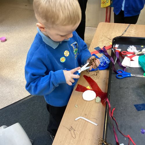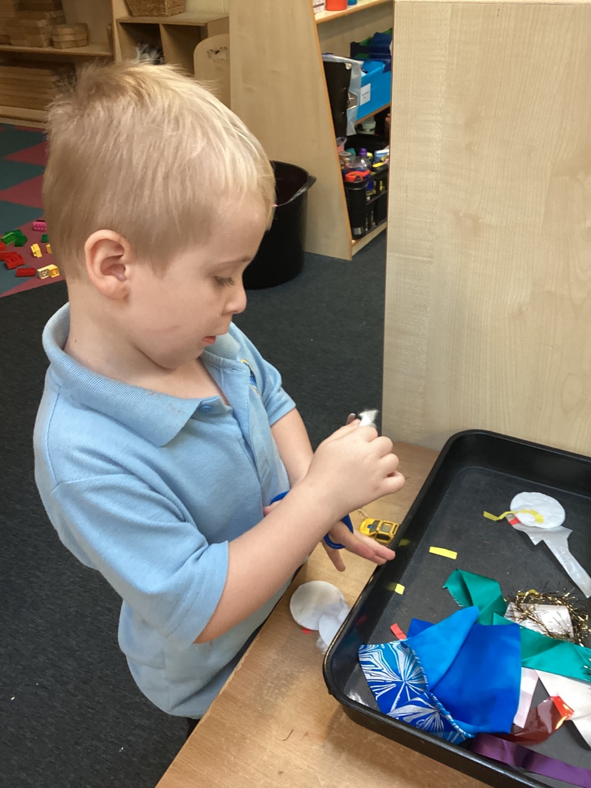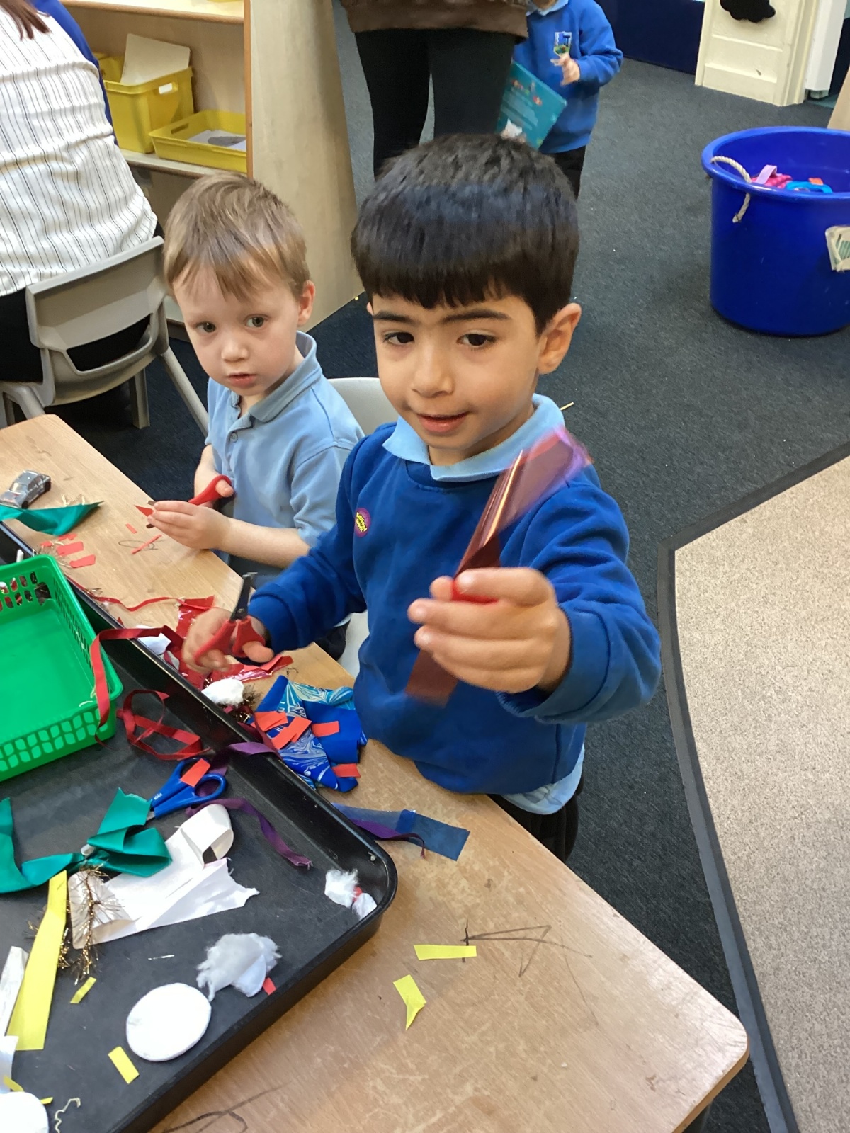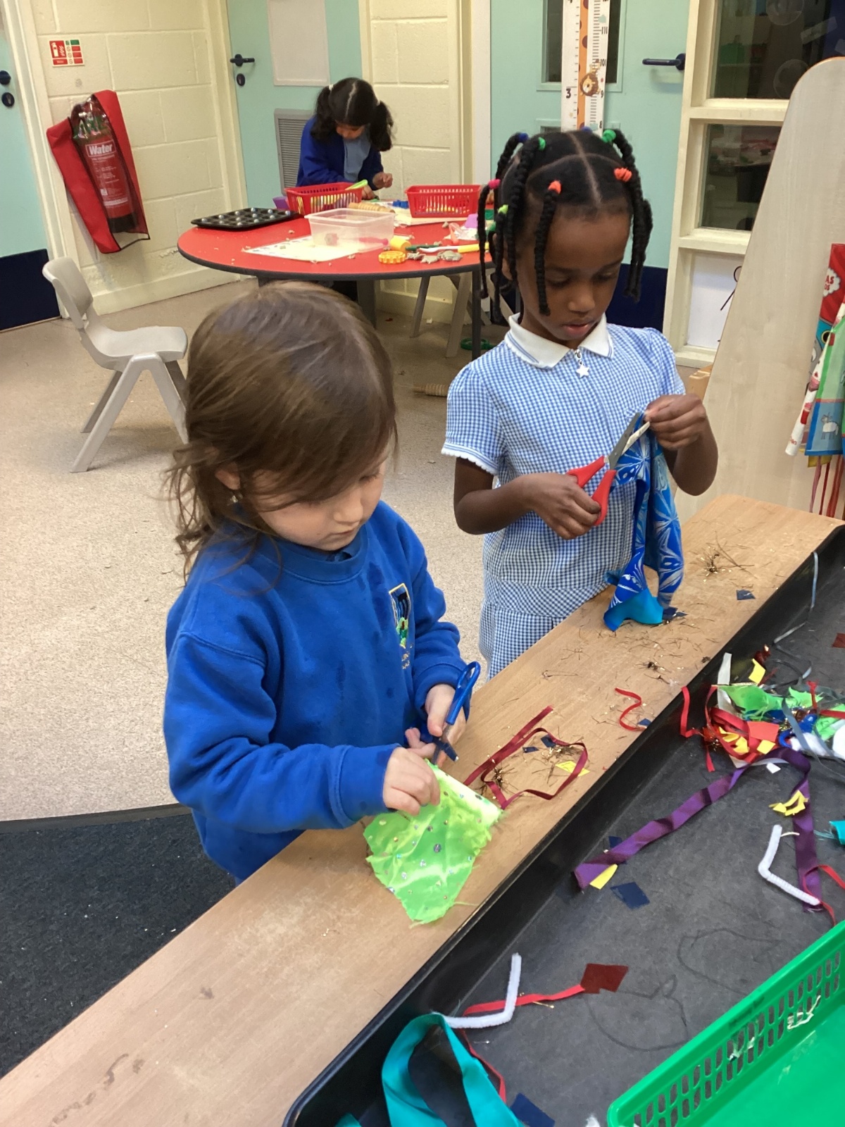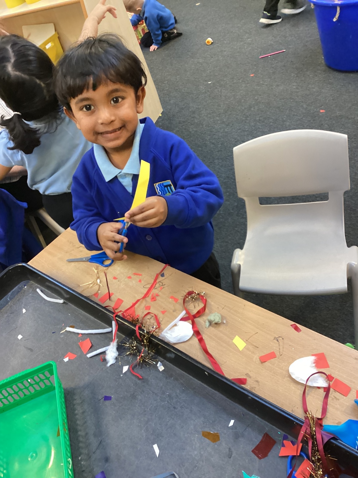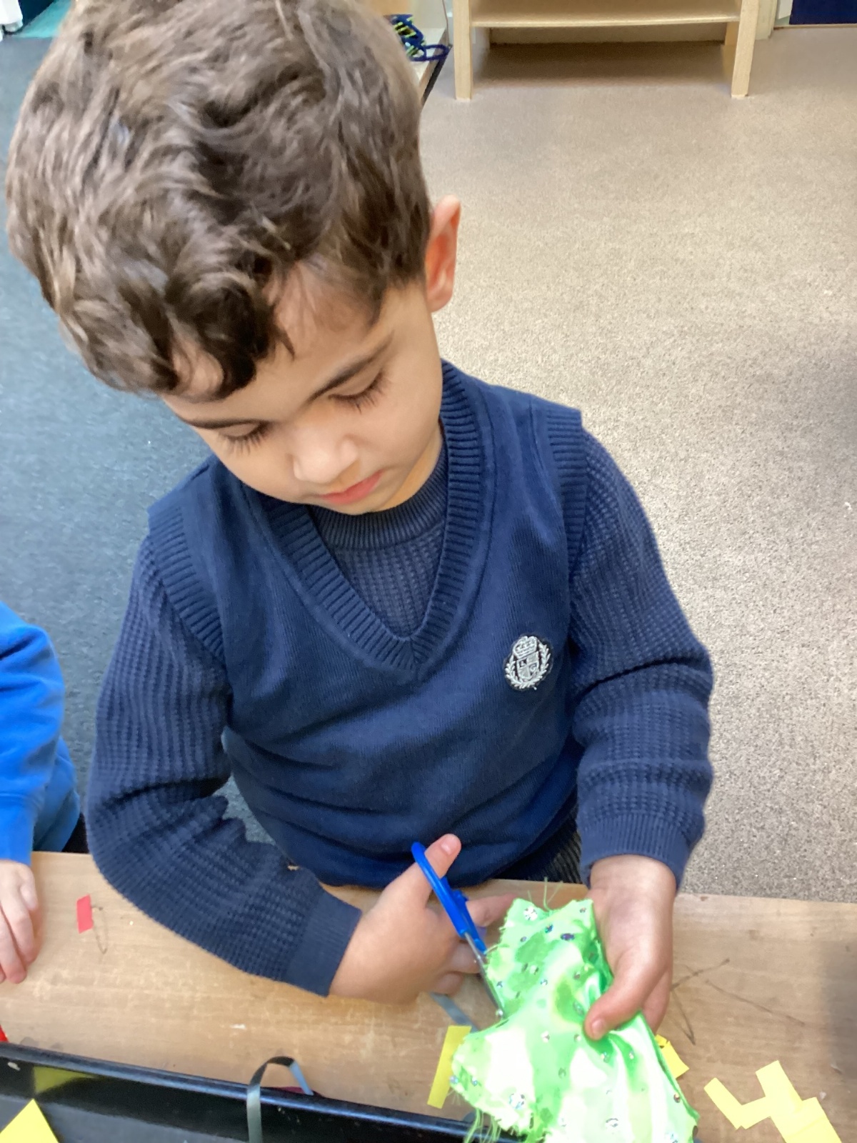 This week we have been developing our fine motor skills by exploring lots of interesting things to cut through. Some items are easy to cut through whilst others are quite difficult! We then have been using the bits that we have cut to make some beautiful creations over on the collage table.