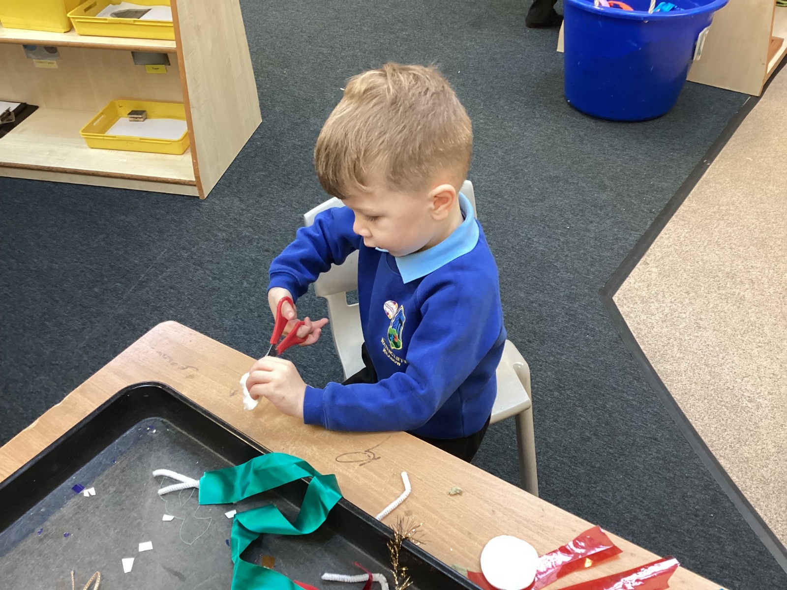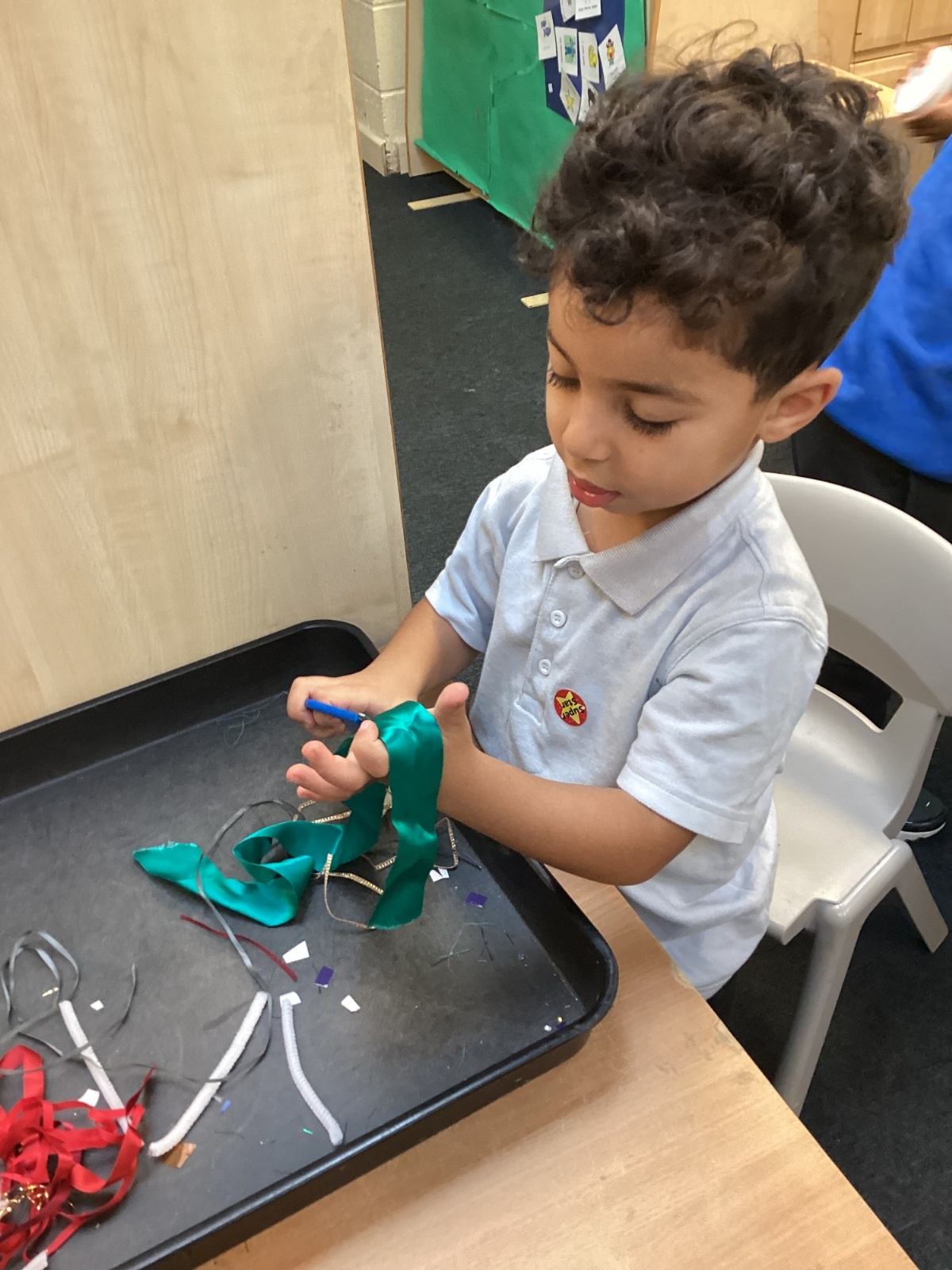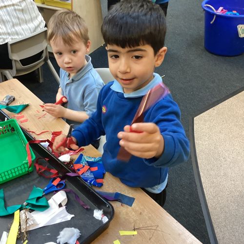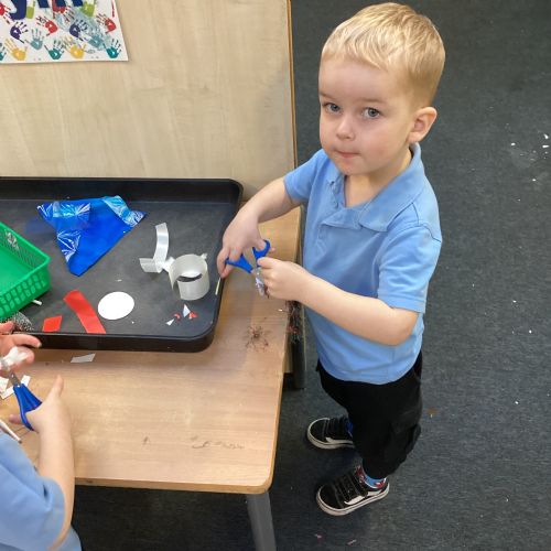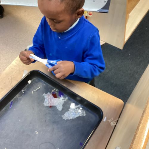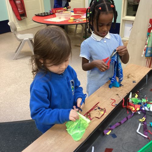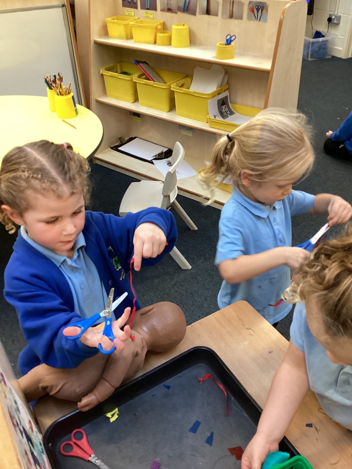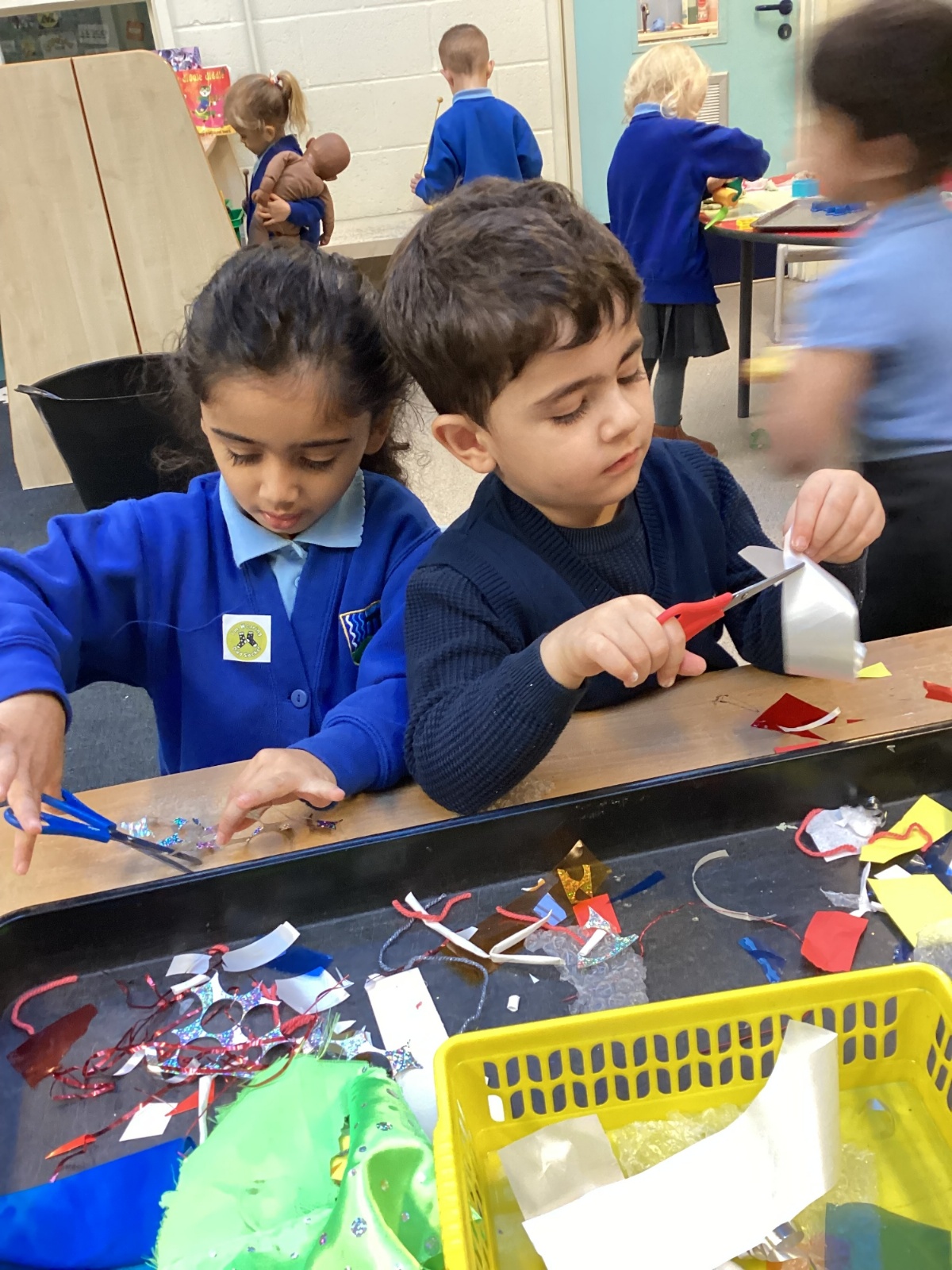 This week we have been developing our fine motor skills by exploring lots of interesting things to cut through. Some items are easy to cut through whilst others are quite difficult! We then have been using the bits that we have cut to make some beautiful creations over on the collage table.