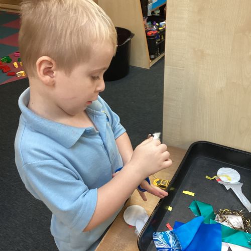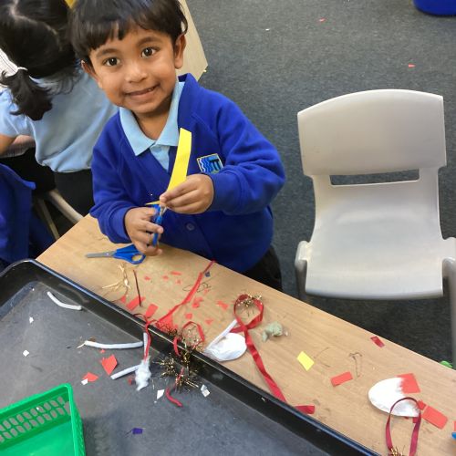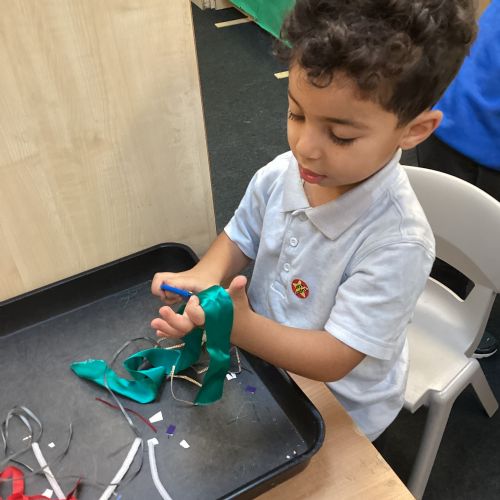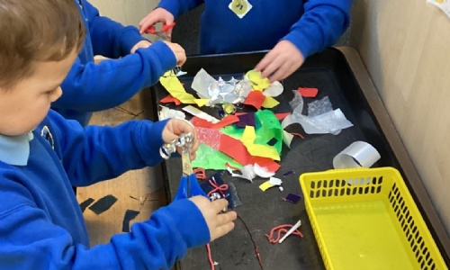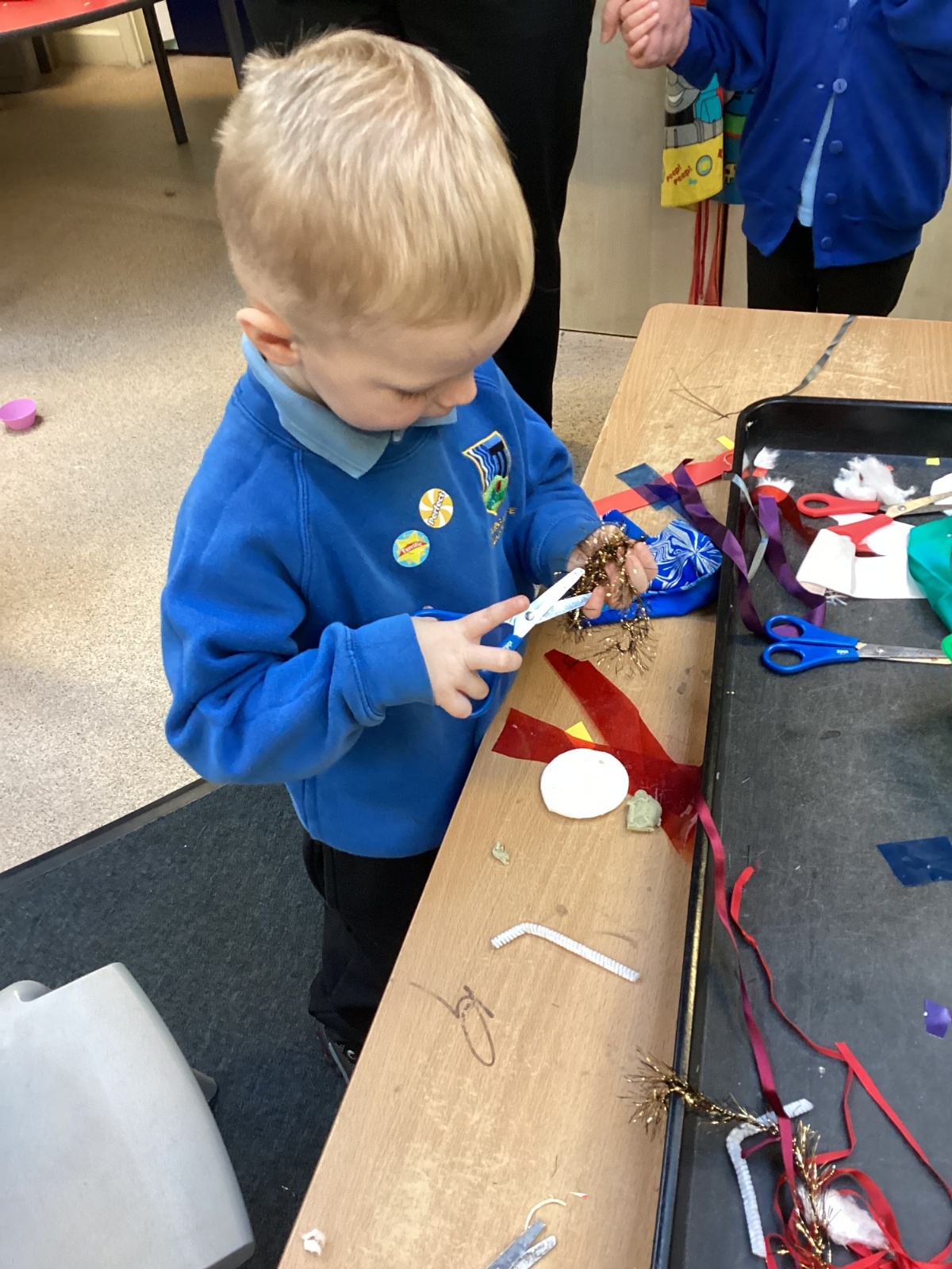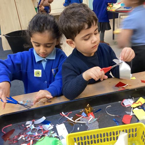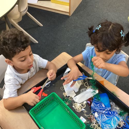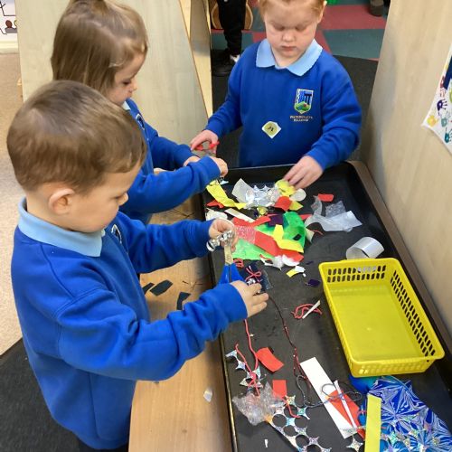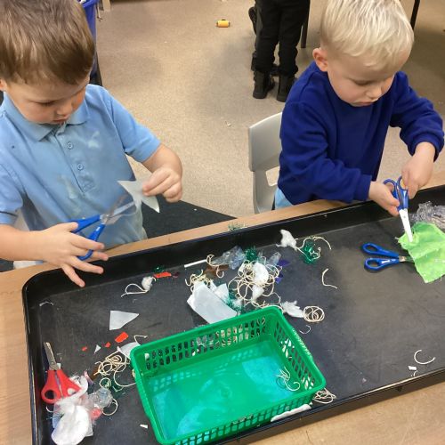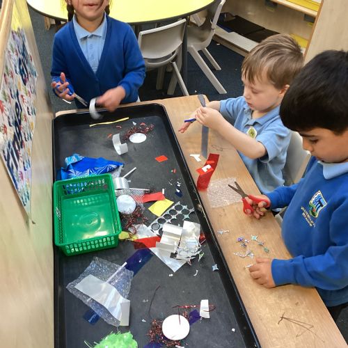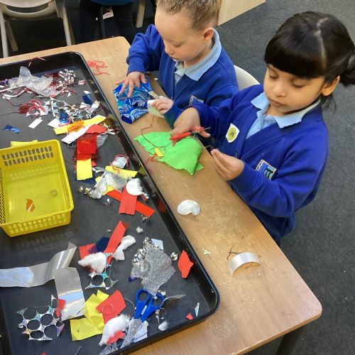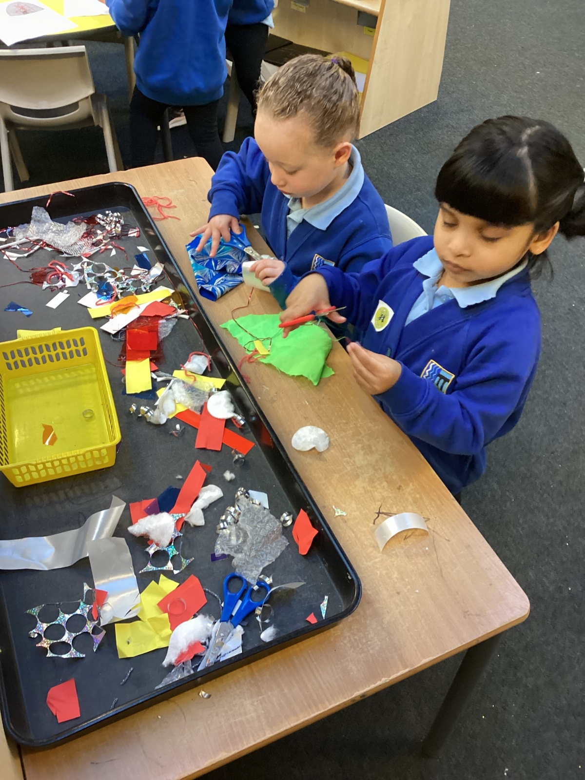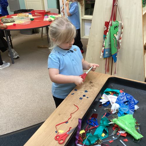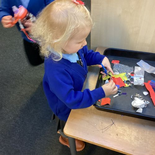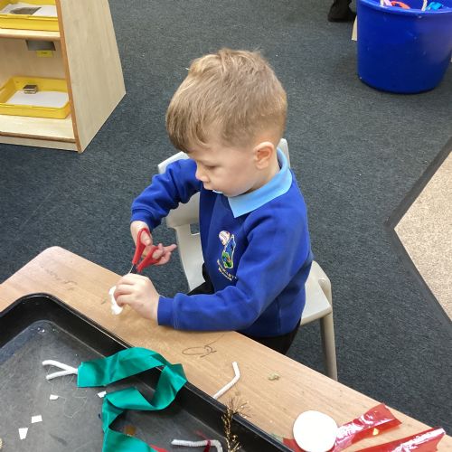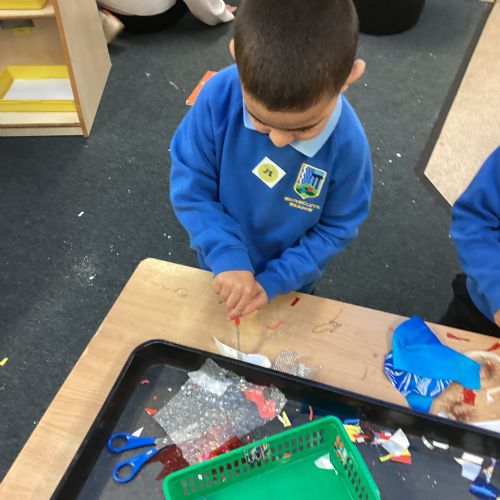 This week we have been developing our fine motor skills by exploring lots of interesting things to cut through. Some items are easy to cut through whilst others are quite difficult! We then have been using the bits that we have cut to make some beautiful creations over on the collage table.
