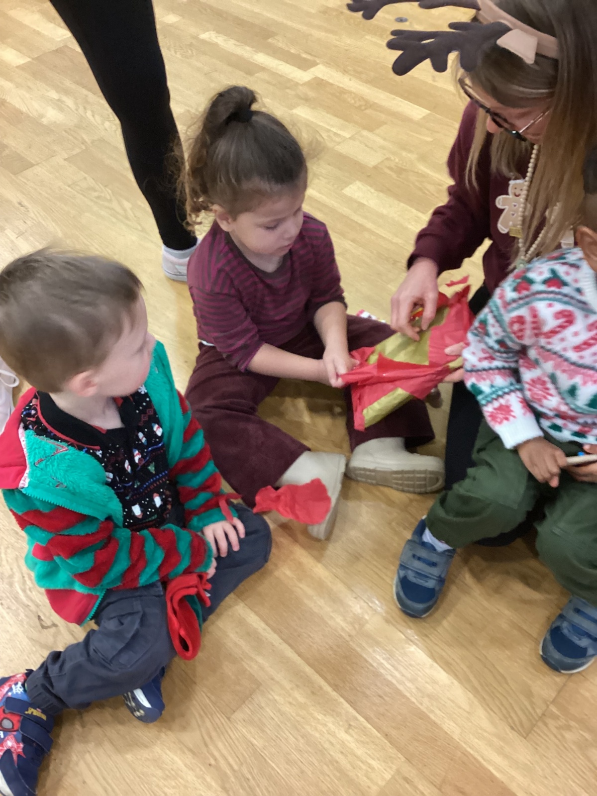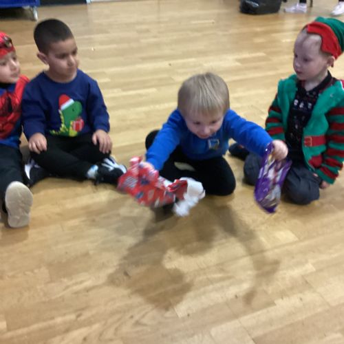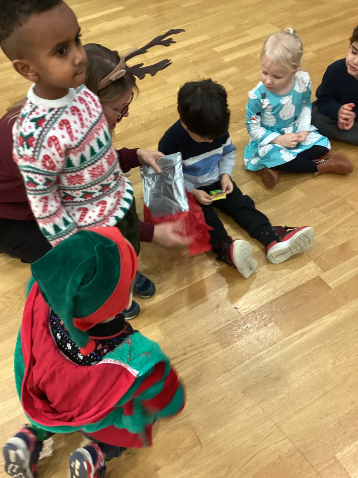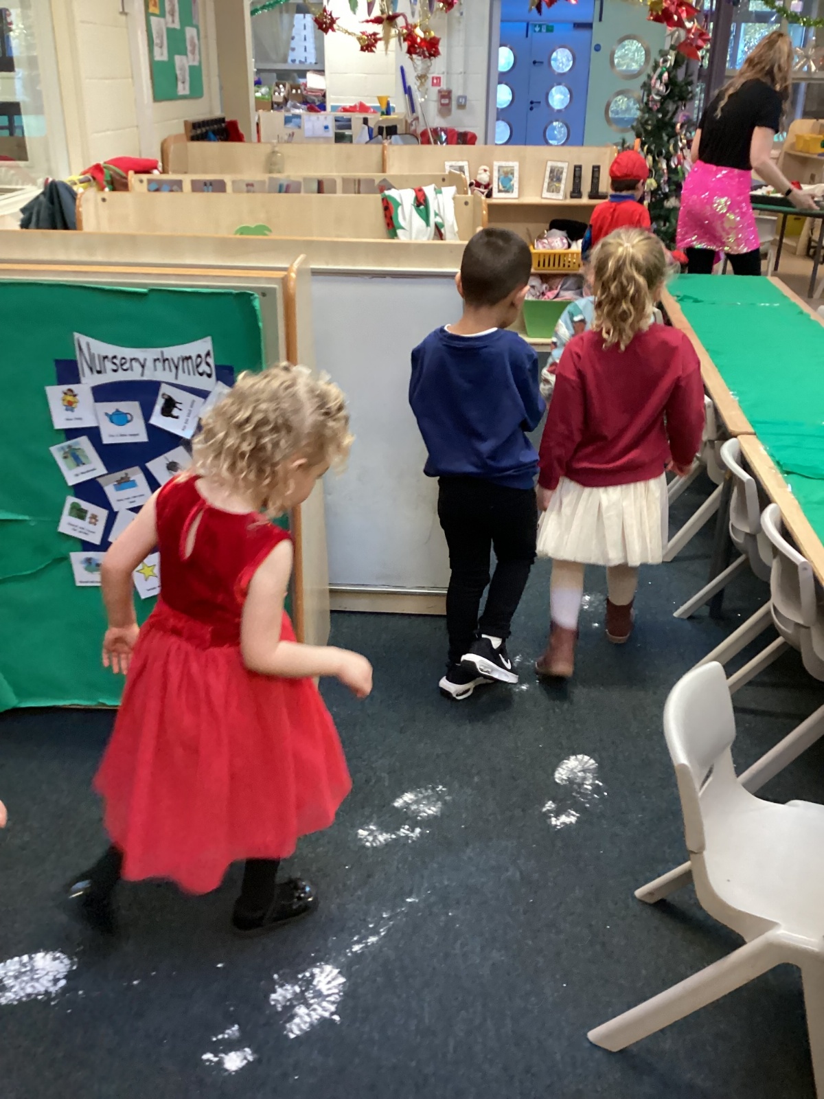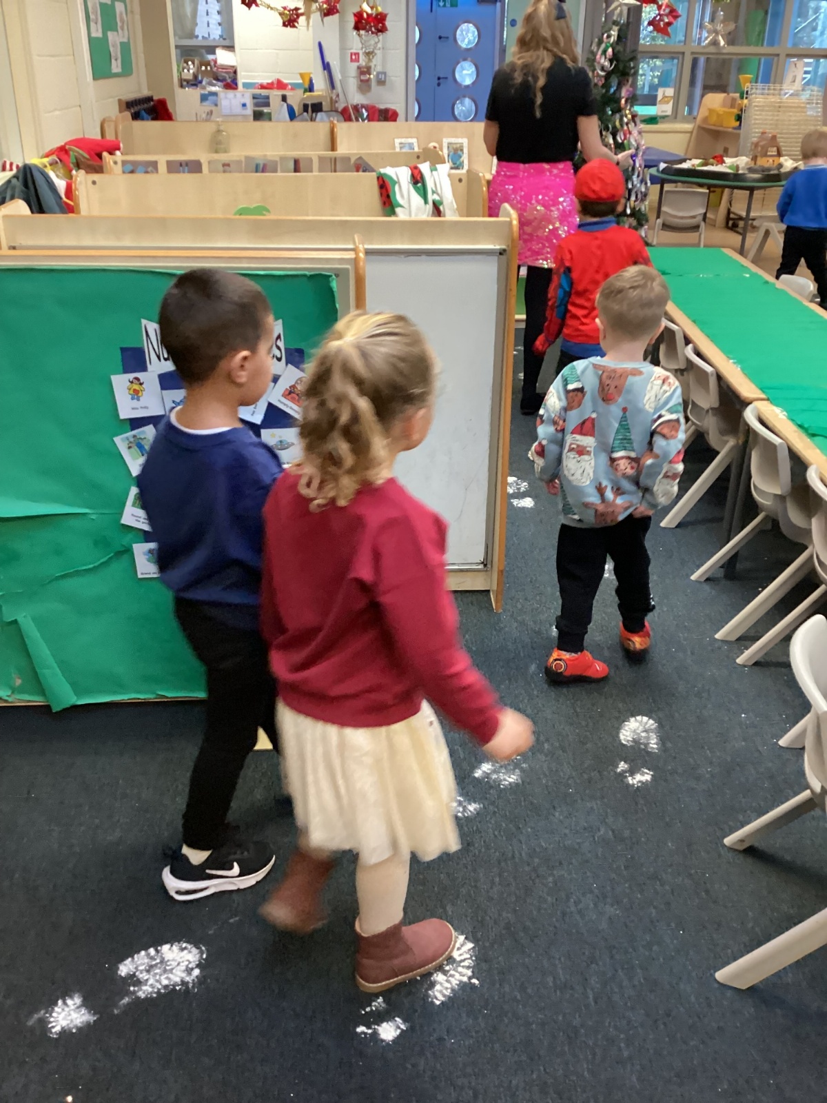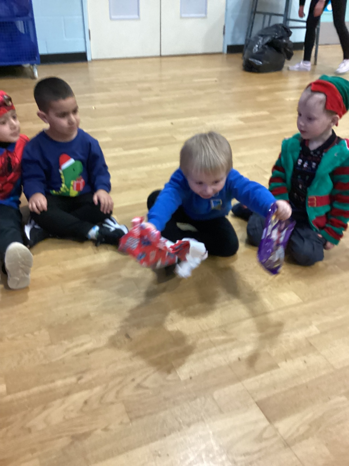 Yesterday was our Nursery Christmas Party and we had a fantastic day! We played pass the parcel, musical bumps and had a disco. We ate some party food all together. The best thing was a surprise visit from Father Christmas who brought us all a present while we were in the hall having fun! He made a bit of a mess in nursery with his snowy footprints, but the teachers didn't mind! What a fun time we had!