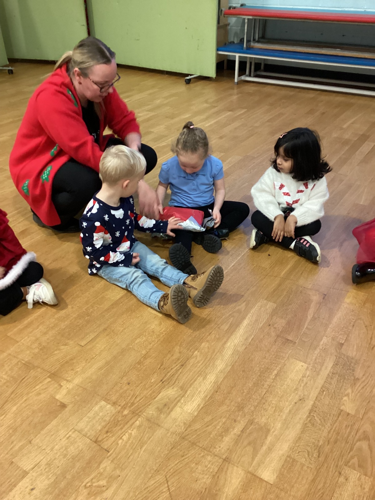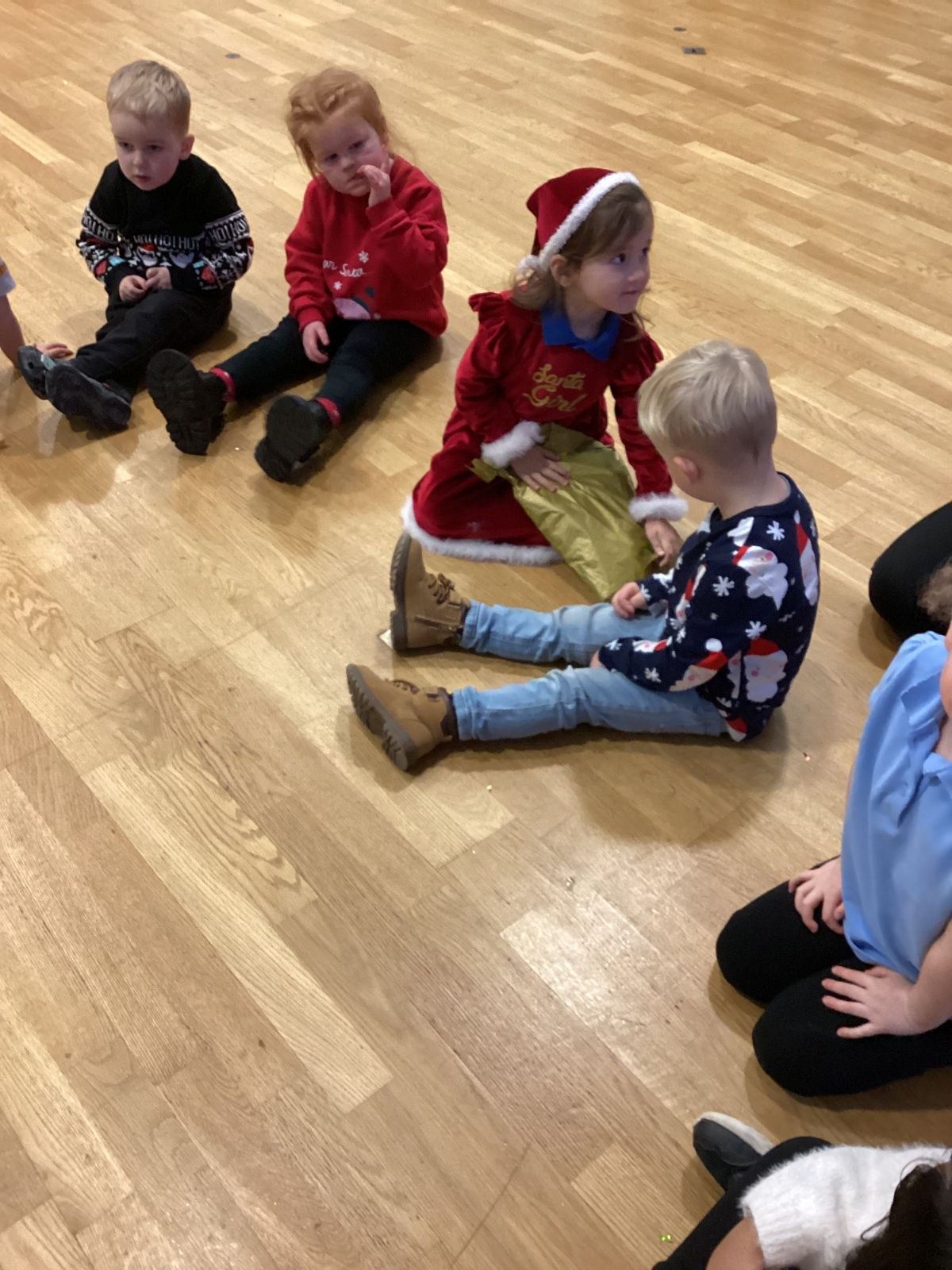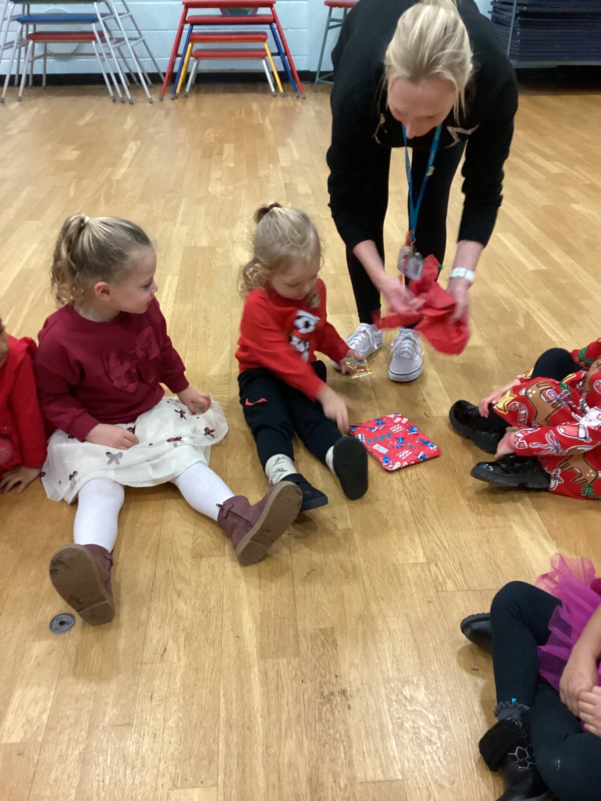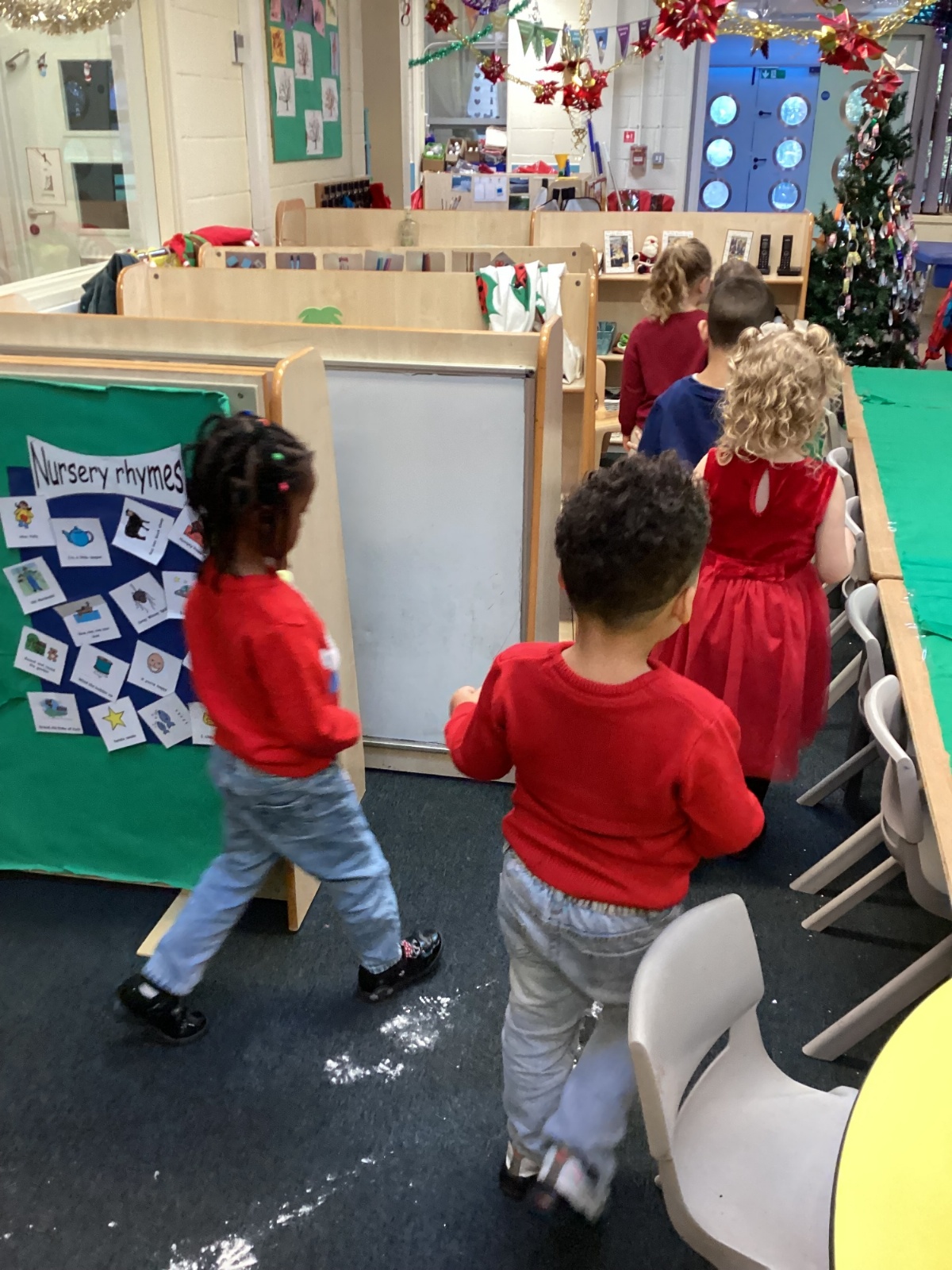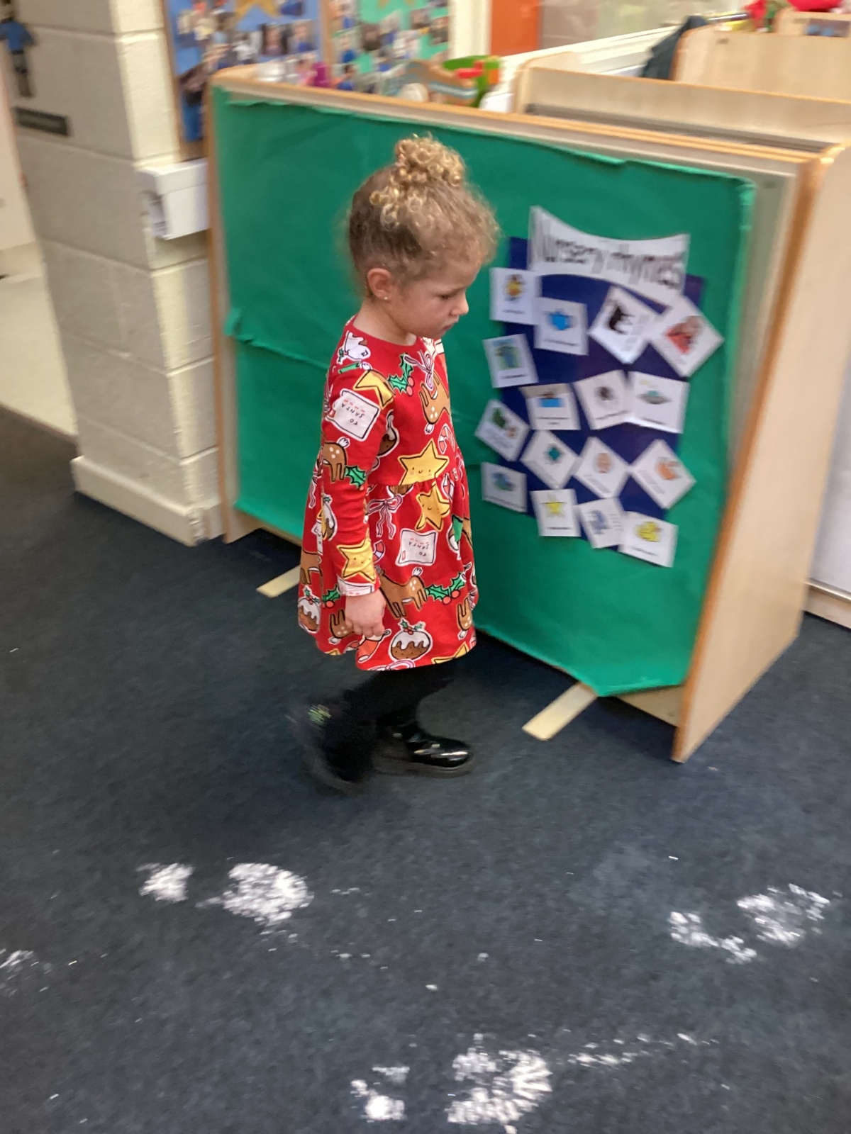 Yesterday was our Nursery Christmas Party and we had a fantastic day! We played pass the parcel, musical bumps and had a disco. We ate some party food all together. The best thing was a surprise visit from Father Christmas who brought us all a present while we were in the hall having fun! He made a bit of a mess in nursery with his snowy footprints, but the teachers didn't mind! What a fun time we had!