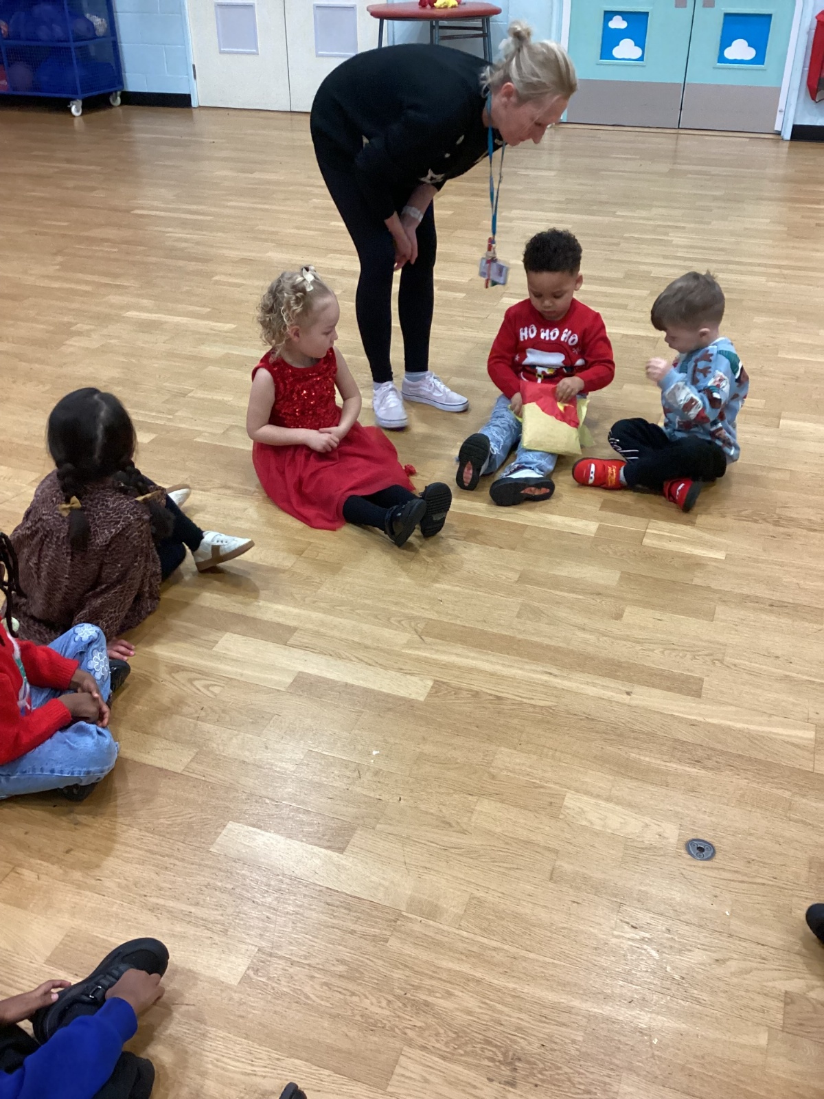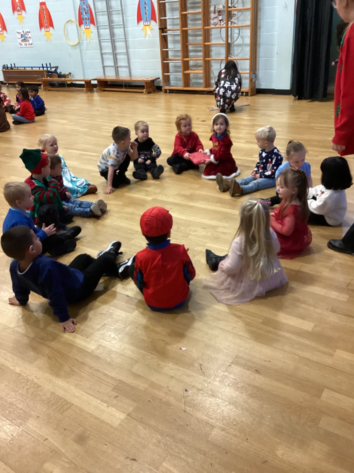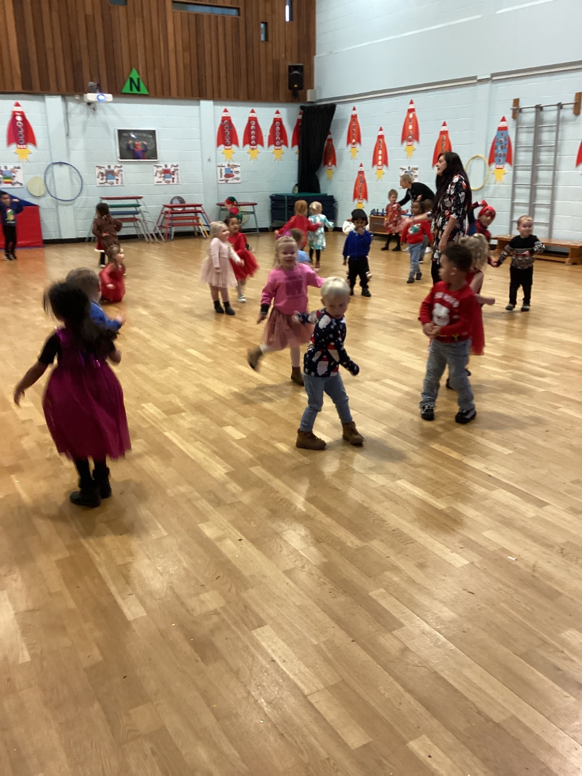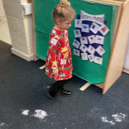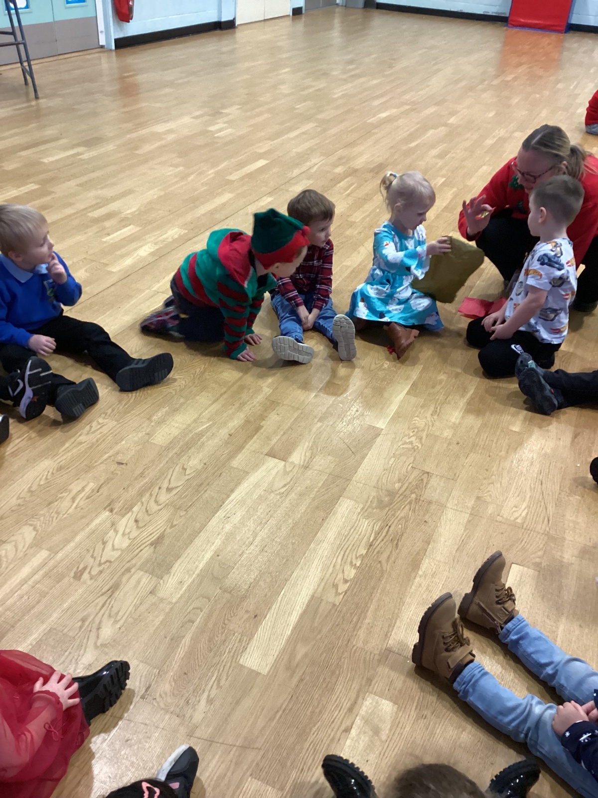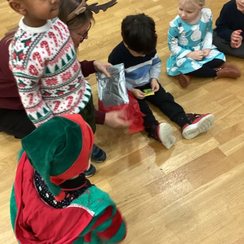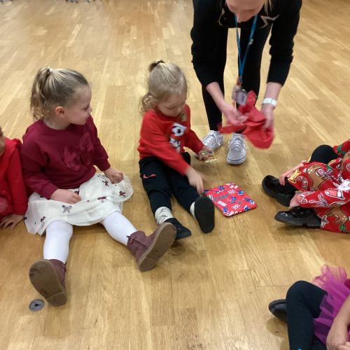 Yesterday was our Nursery Christmas Party and we had a fantastic day! We played pass the parcel, musical bumps and had a disco. We ate some party food all together. The best thing was a surprise visit from Father Christmas who brought us all a present while we were in the hall having fun! He made a bit of a mess in nursery with his snowy footprints, but the teachers didn't mind! What a fun time we had!