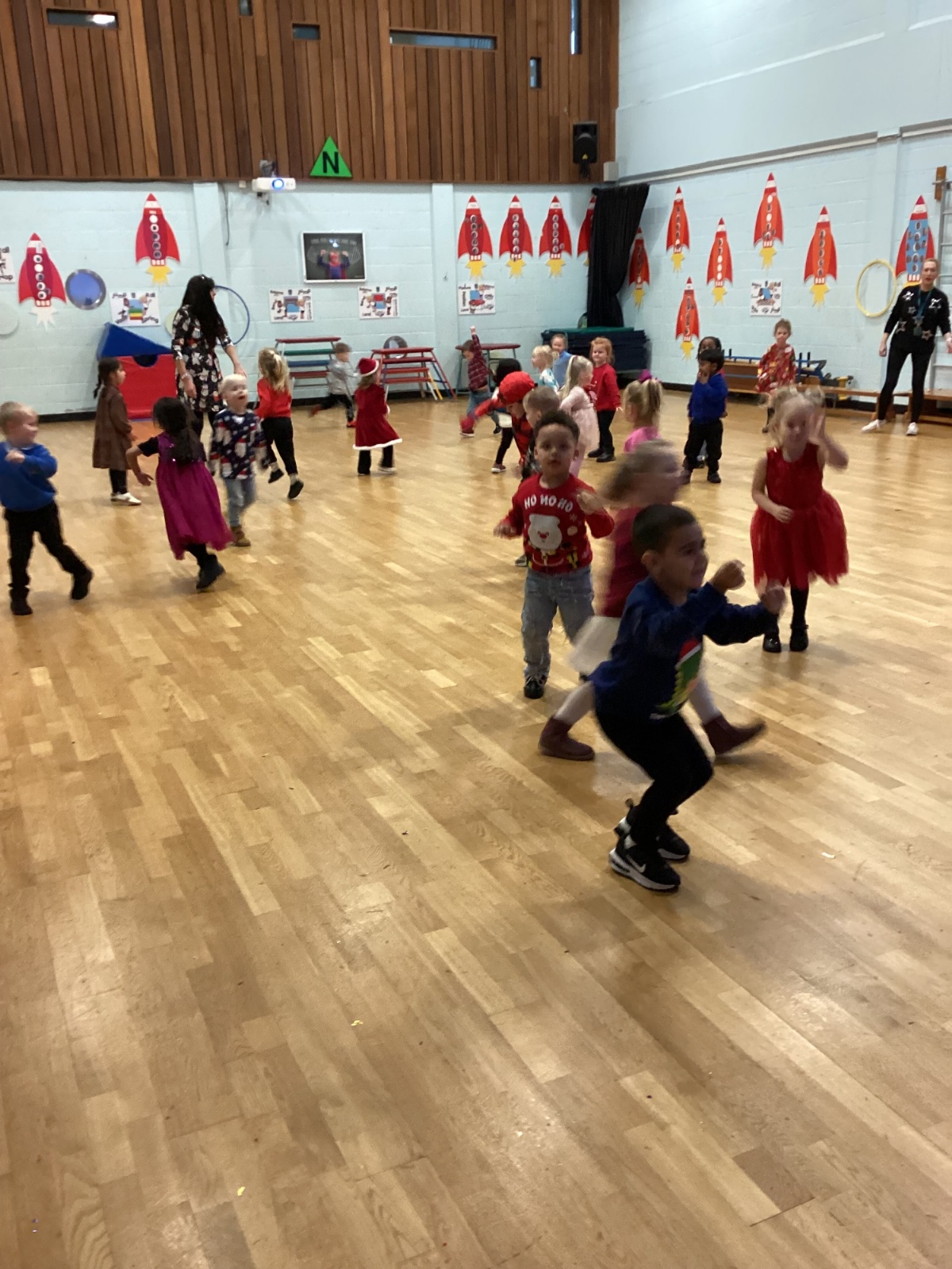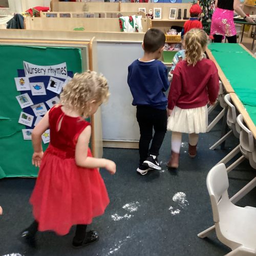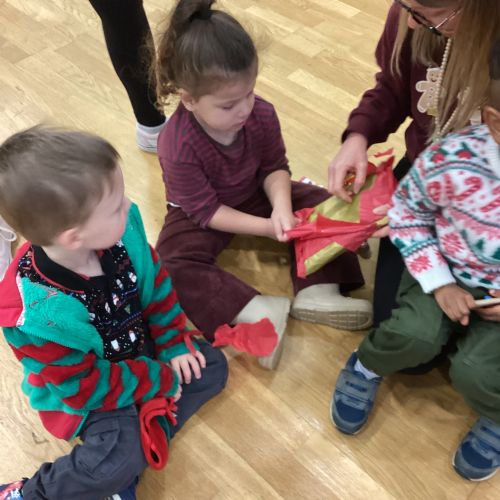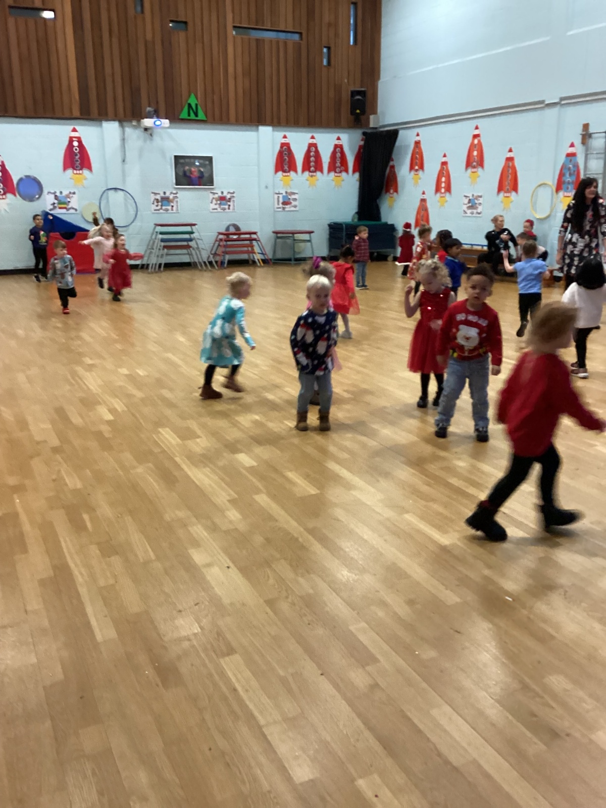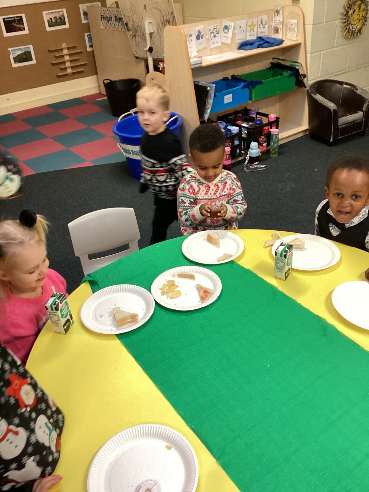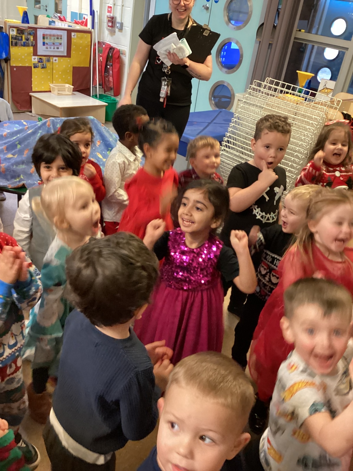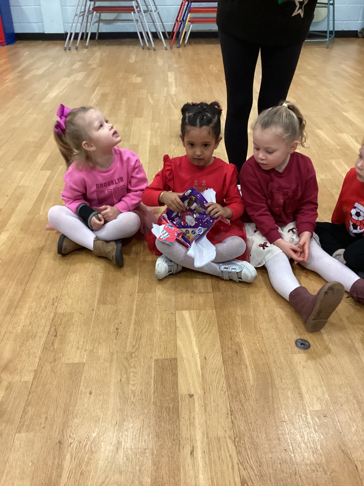 Yesterday was our Nursery Christmas Party and we had a fantastic day! We played pass the parcel, musical bumps and had a disco. We ate some party food all together. The best thing was a surprise visit from Father Christmas who brought us all a present while we were in the hall having fun! He made a bit of a mess in nursery with his snowy footprints, but the teachers didn't mind! What a fun time we had!