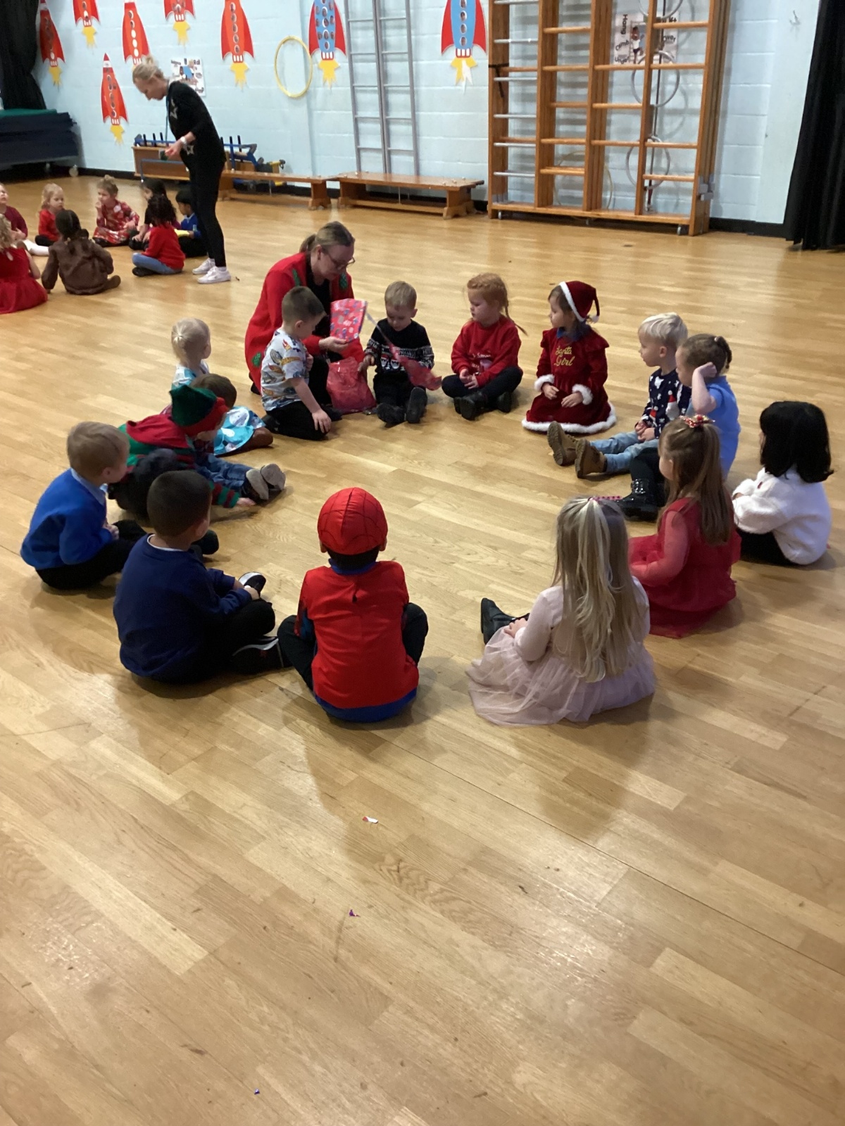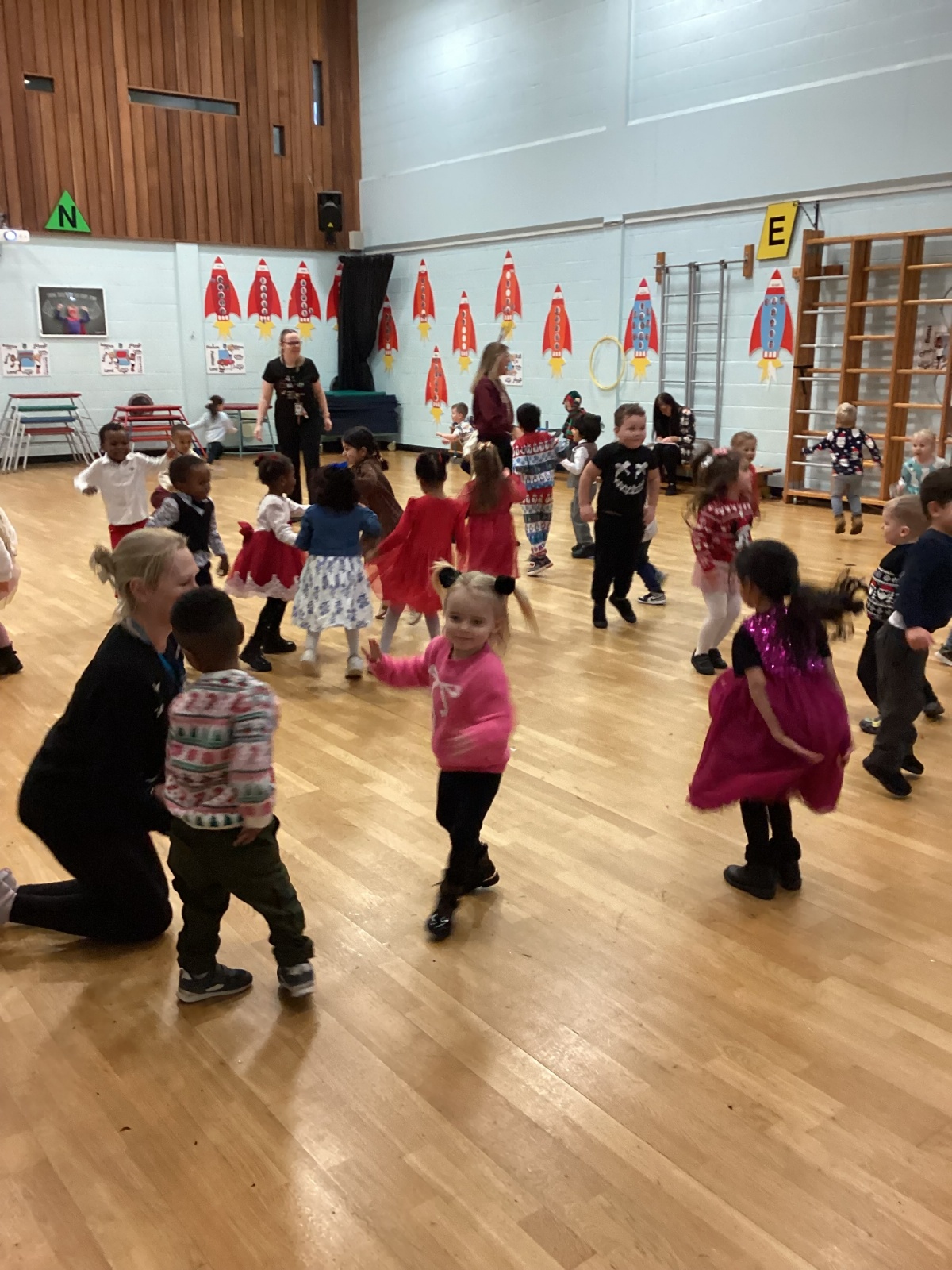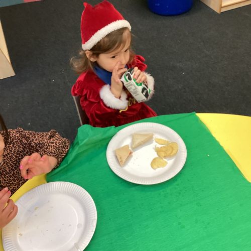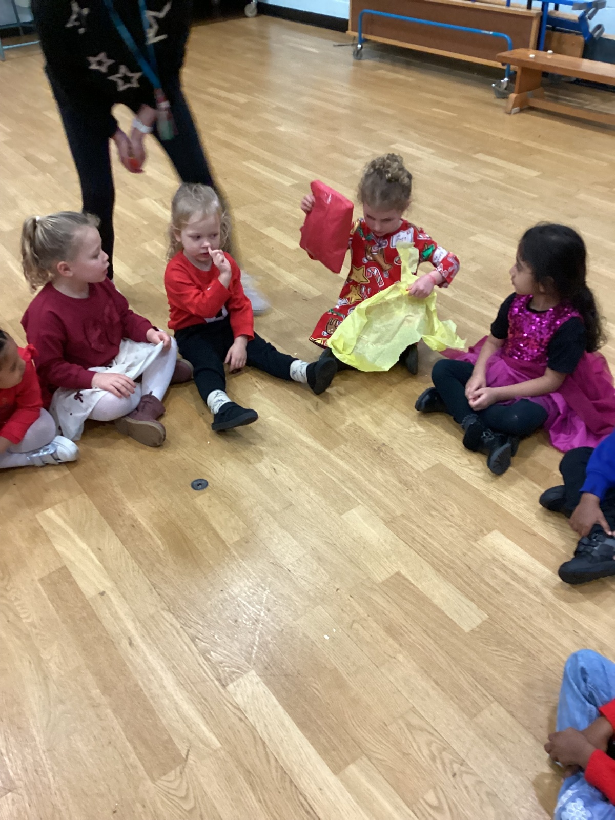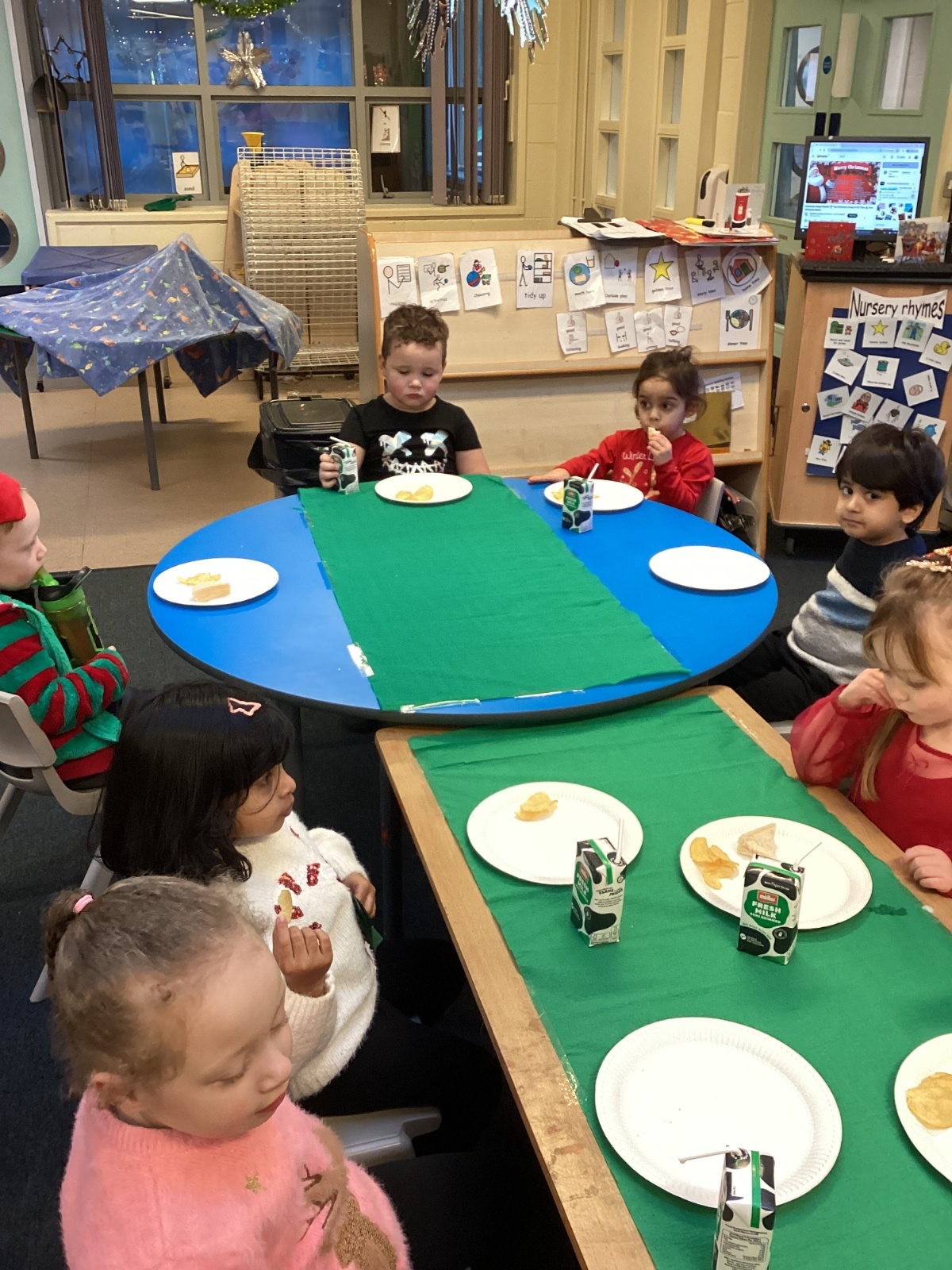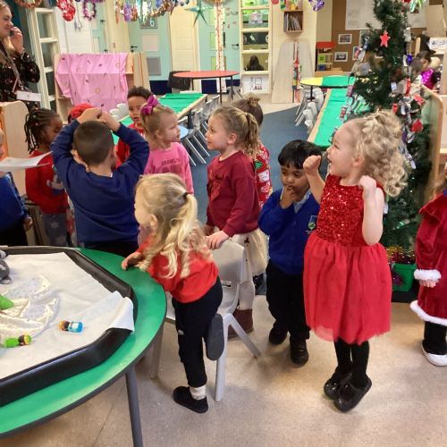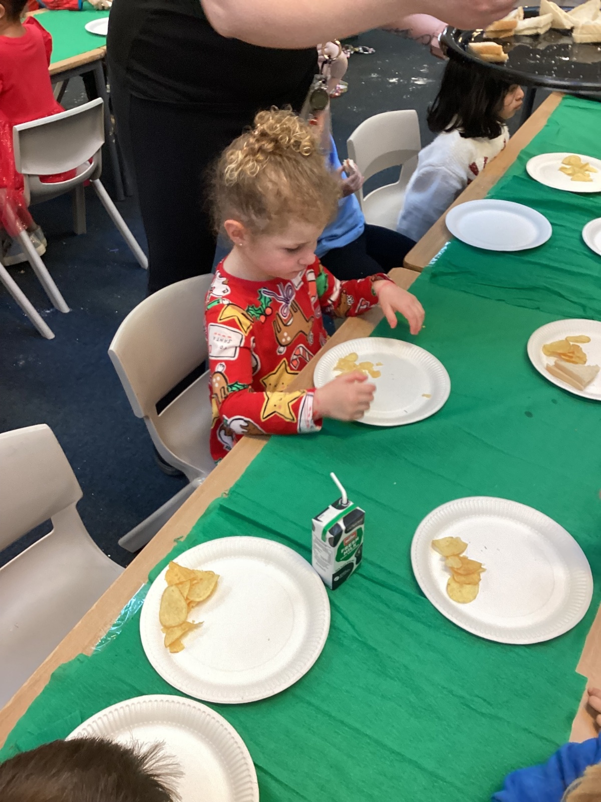 Yesterday was our Nursery Christmas Party and we had a fantastic day! We played pass the parcel, musical bumps and had a disco. We ate some party food all together. The best thing was a surprise visit from Father Christmas who brought us all a present while we were in the hall having fun! He made a bit of a mess in nursery with his snowy footprints, but the teachers didn't mind! What a fun time we had!