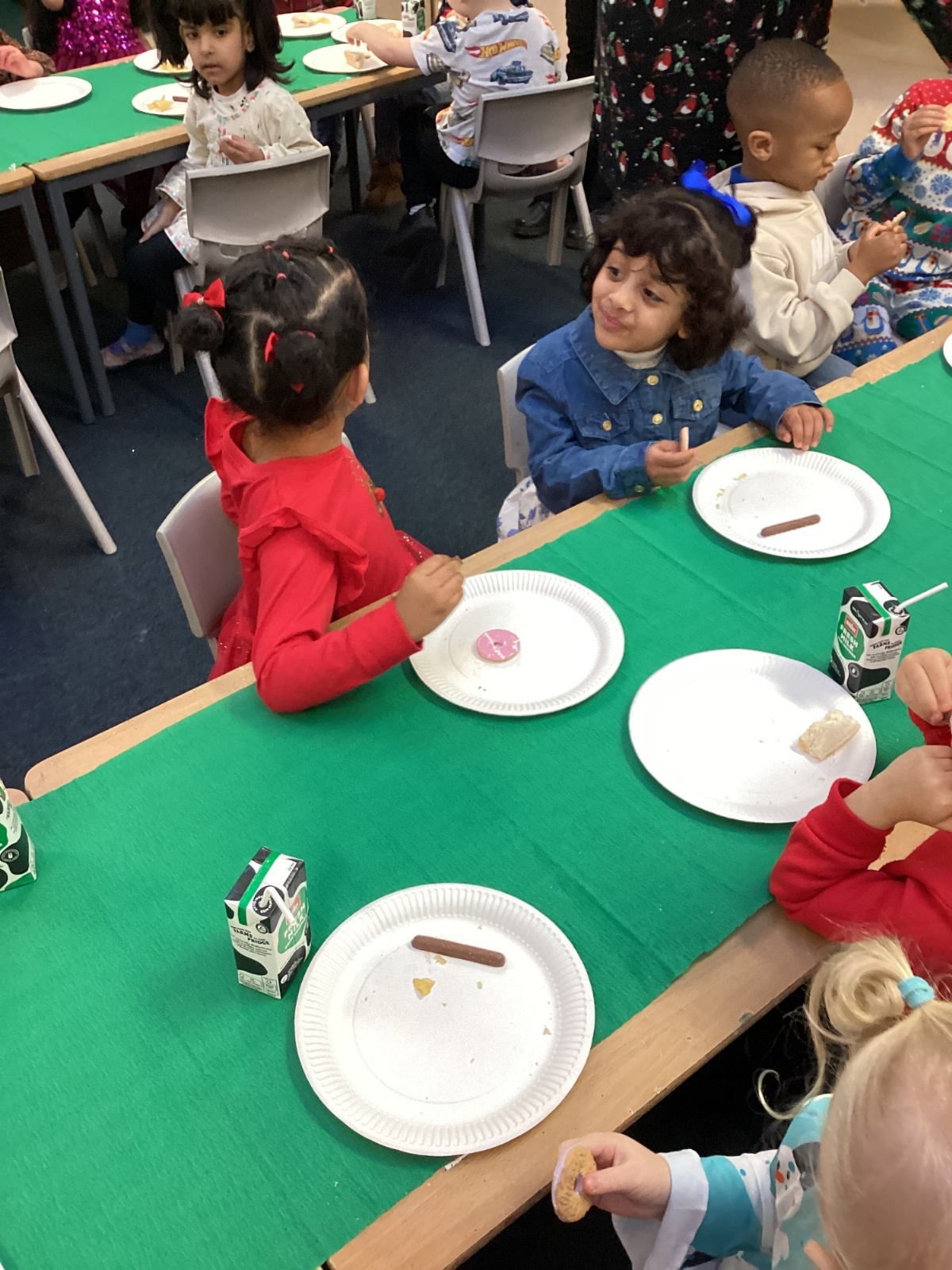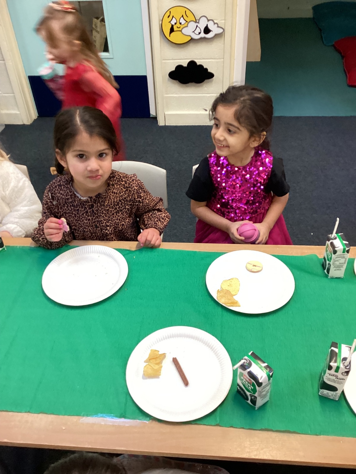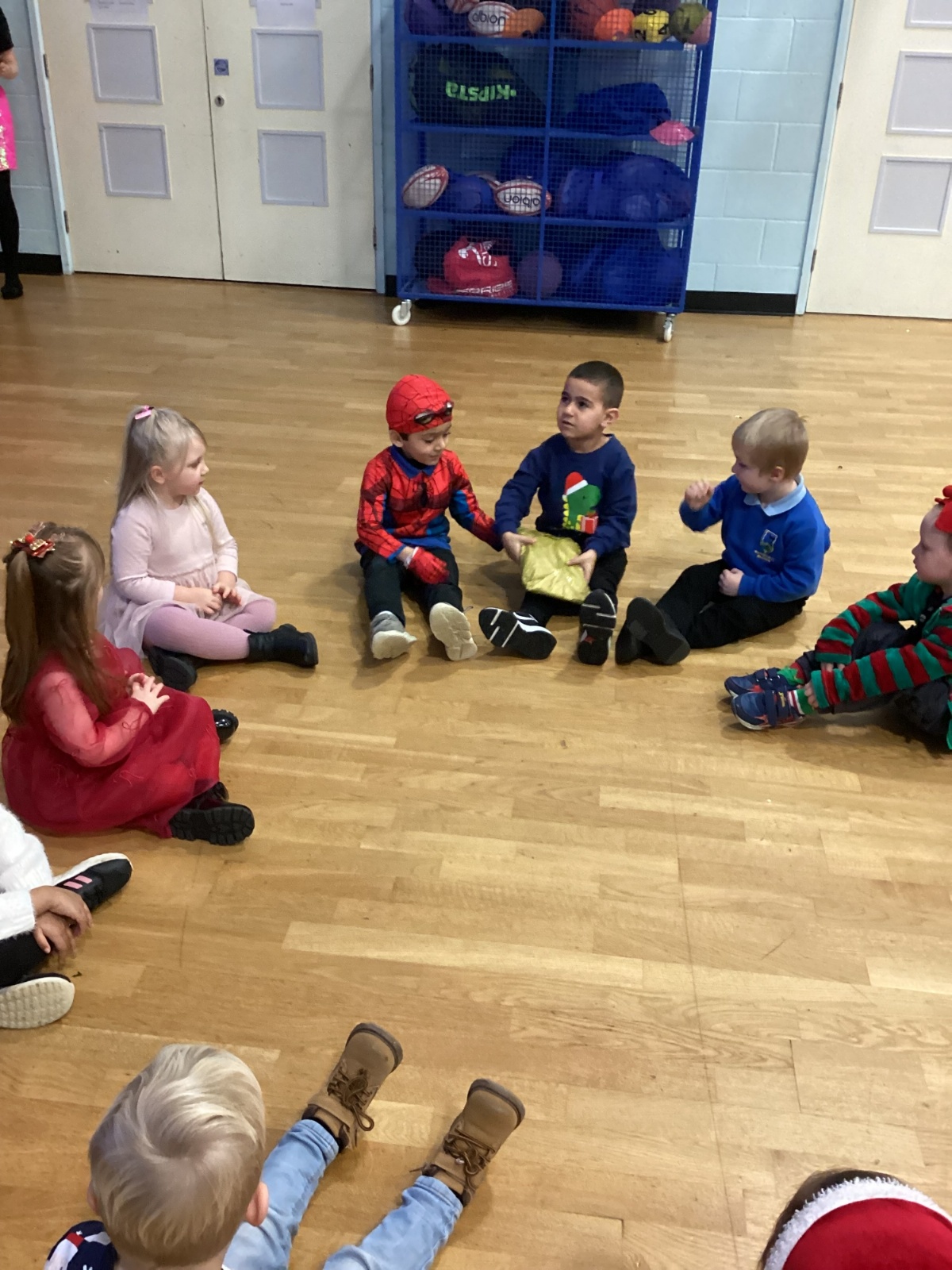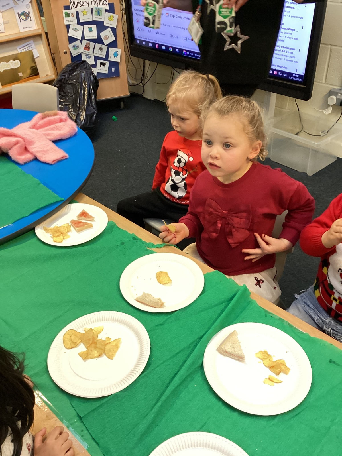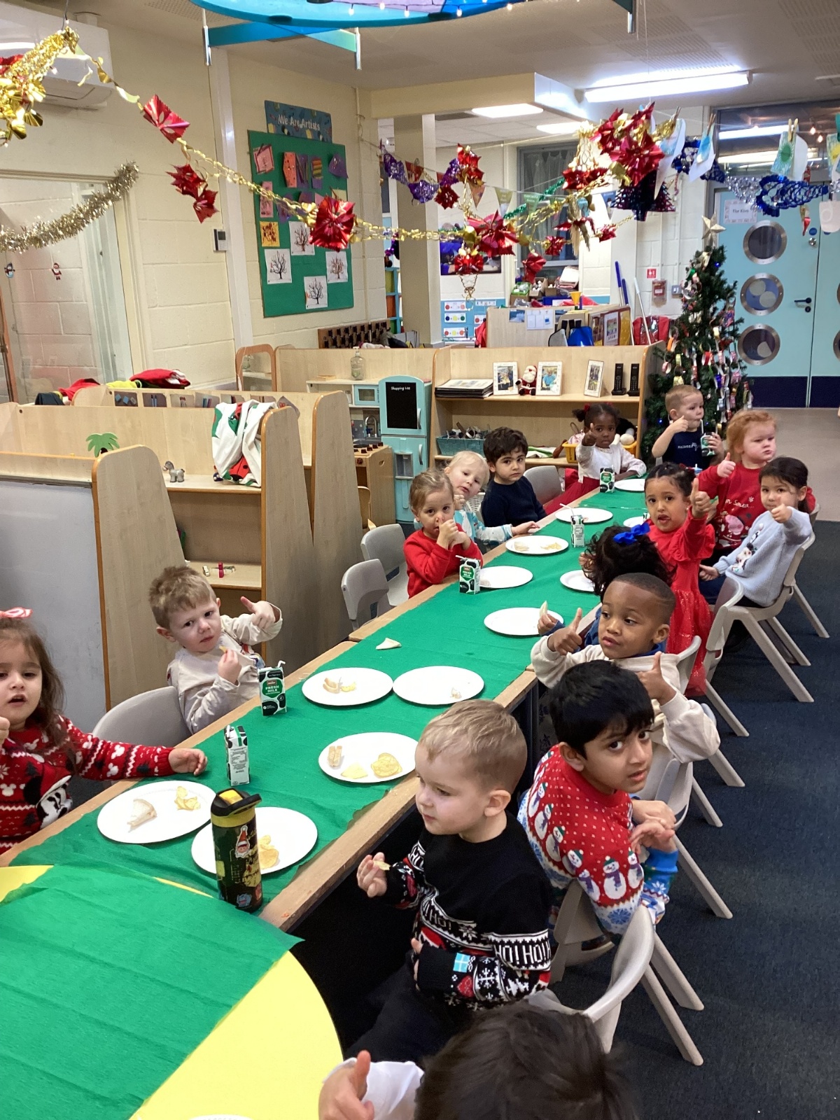 Yesterday was our Nursery Christmas Party and we had a fantastic day! We played pass the parcel, musical bumps and had a disco. We ate some party food all together. The best thing was a surprise visit from Father Christmas who brought us all a present while we were in the hall having fun! He made a bit of a mess in nursery with his snowy footprints, but the teachers didn't mind! What a fun time we had!