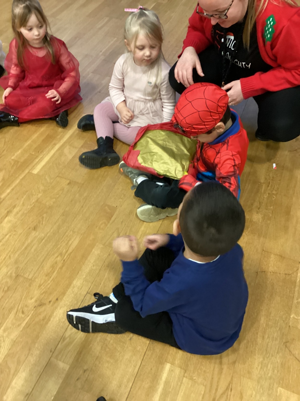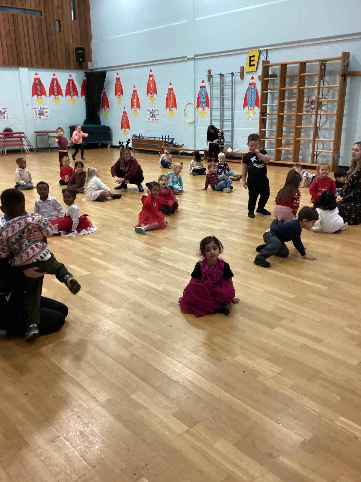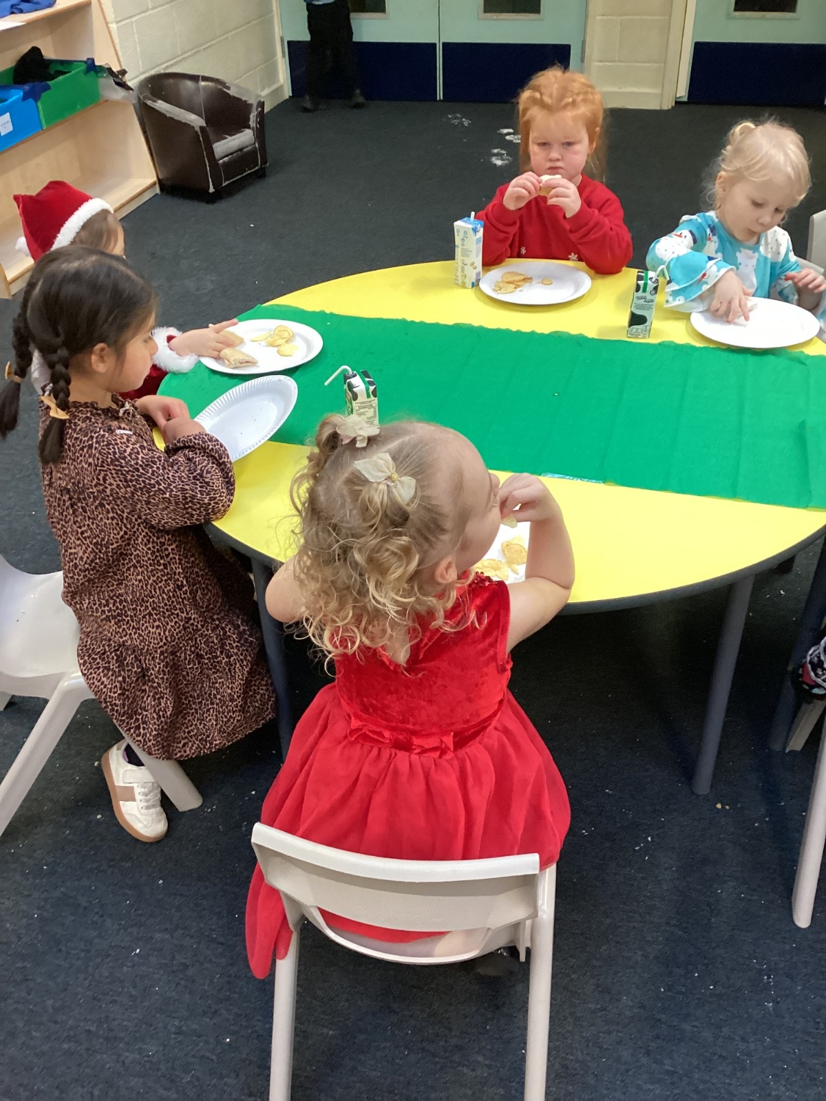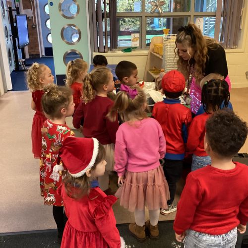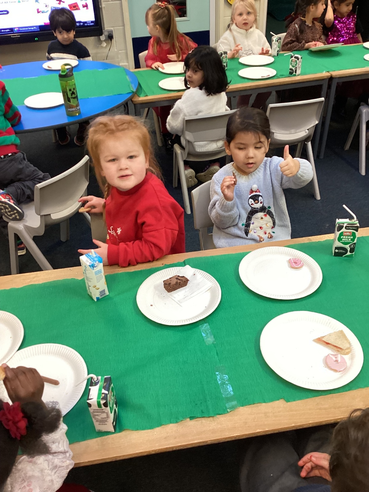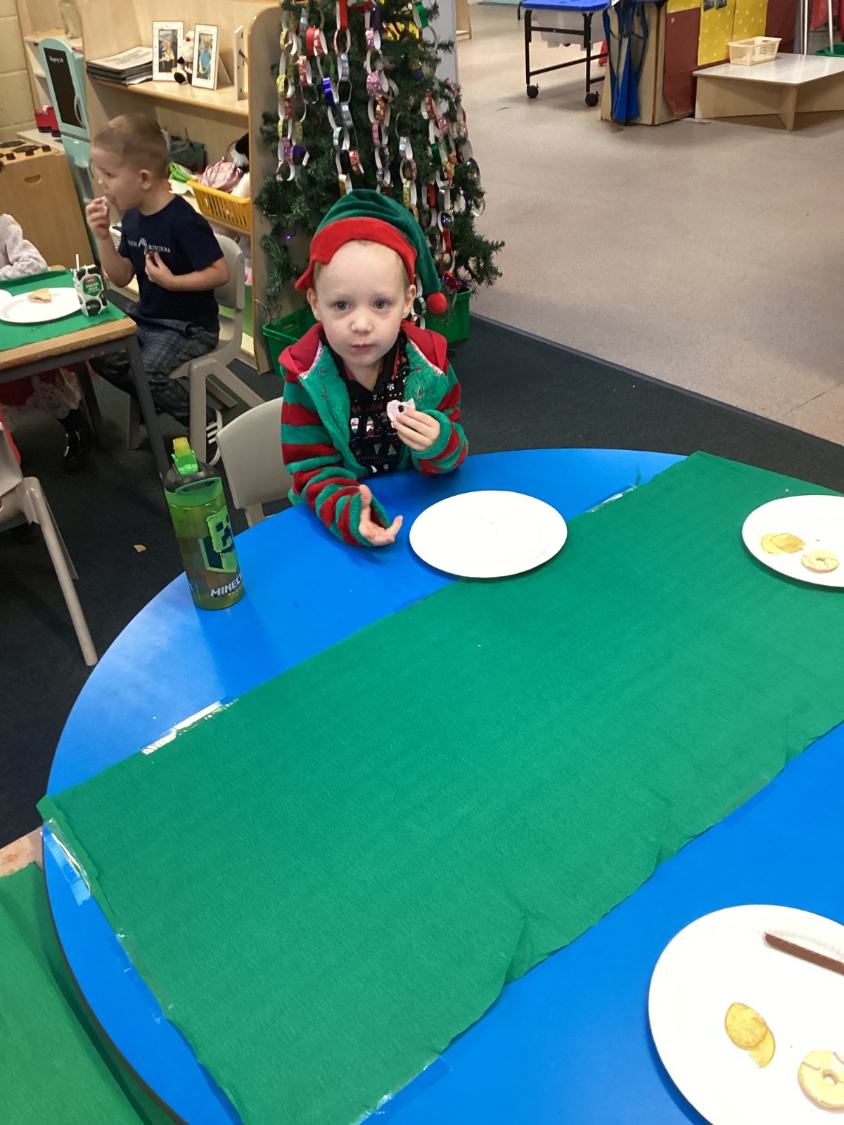 Yesterday was our Nursery Christmas Party and we had a fantastic day! We played pass the parcel, musical bumps and had a disco. We ate some party food all together. The best thing was a surprise visit from Father Christmas who brought us all a present while we were in the hall having fun! He made a bit of a mess in nursery with his snowy footprints, but the teachers didn't mind! What a fun time we had!