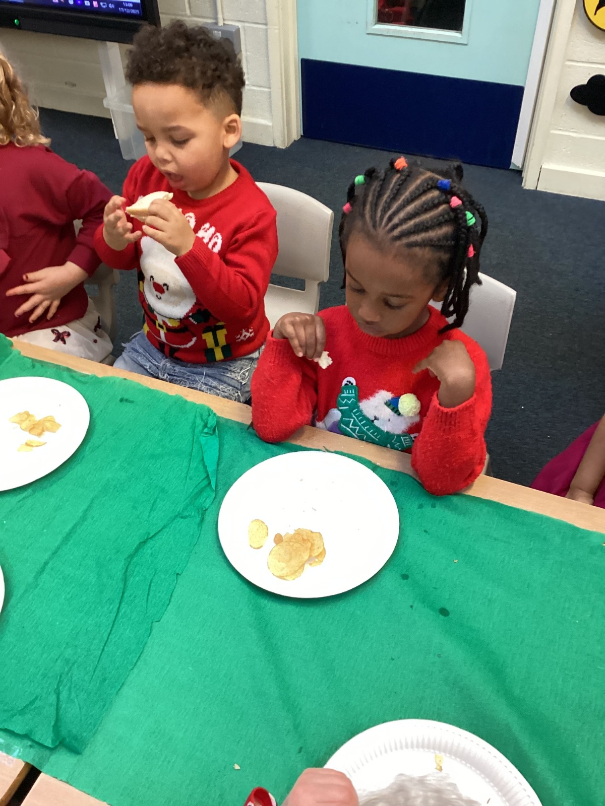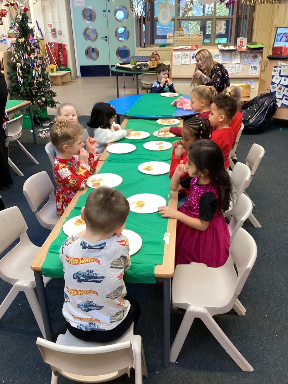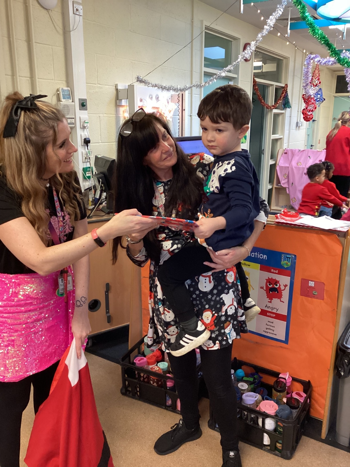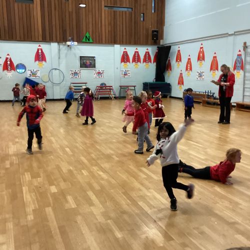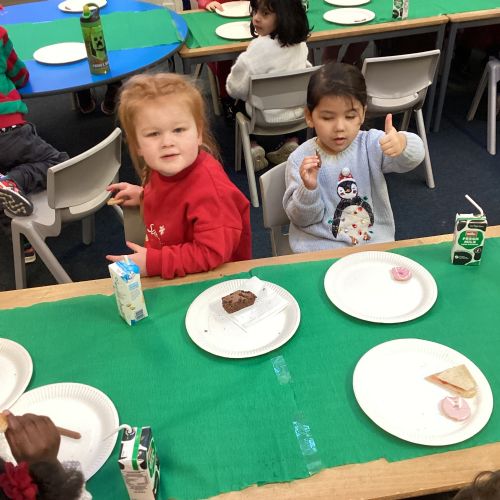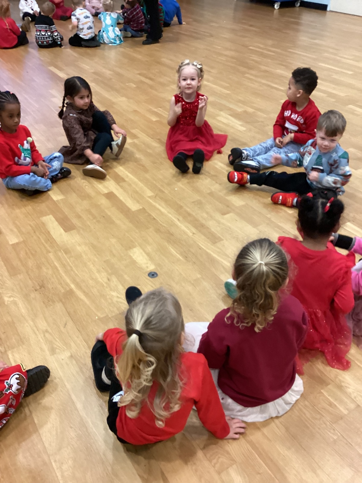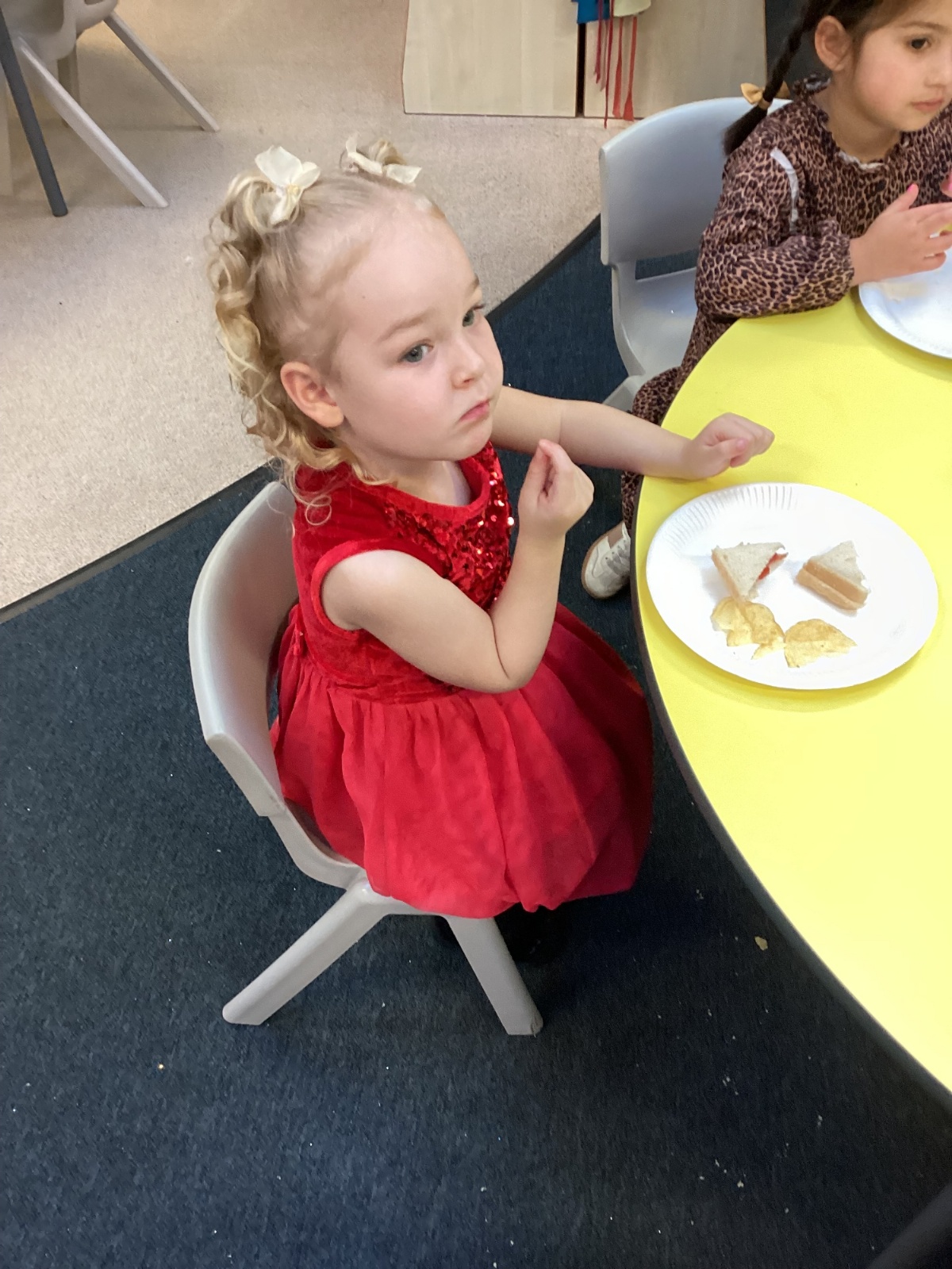 Yesterday was our Nursery Christmas Party and we had a fantastic day! We played pass the parcel, musical bumps and had a disco. We ate some party food all together. The best thing was a surprise visit from Father Christmas who brought us all a present while we were in the hall having fun! He made a bit of a mess in nursery with his snowy footprints, but the teachers didn't mind! What a fun time we had!