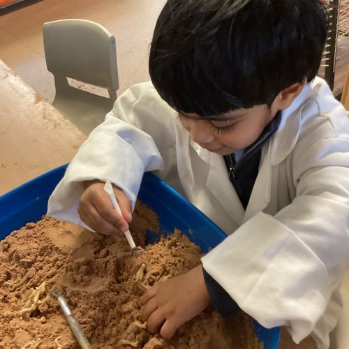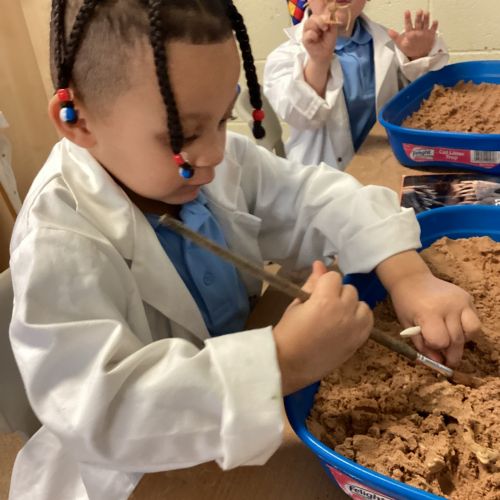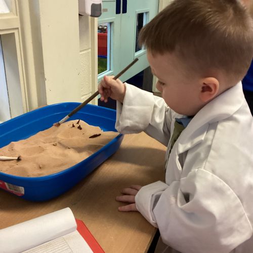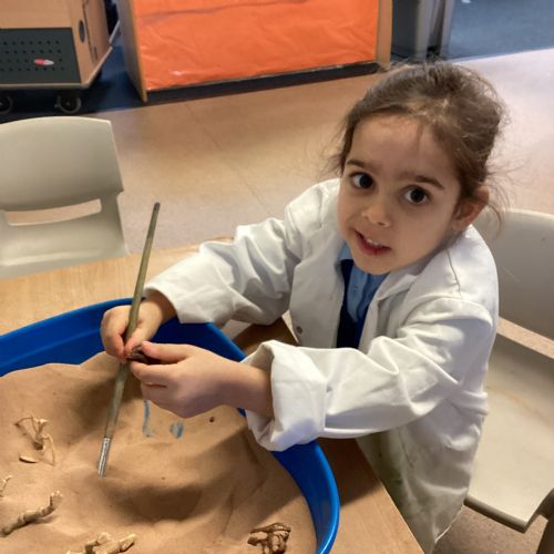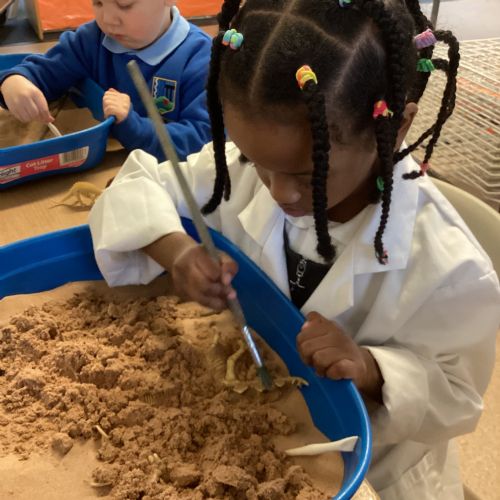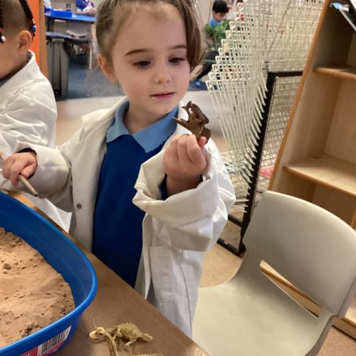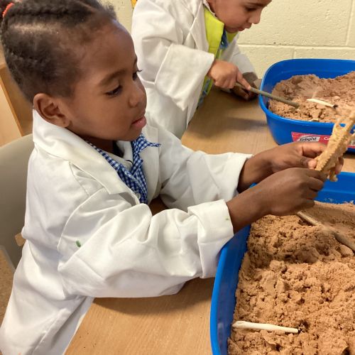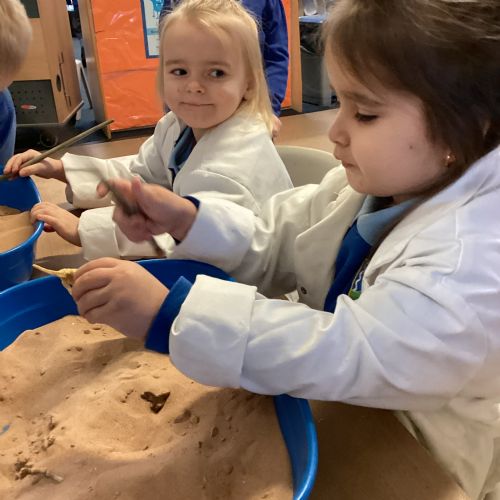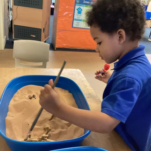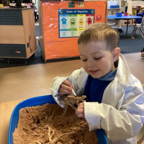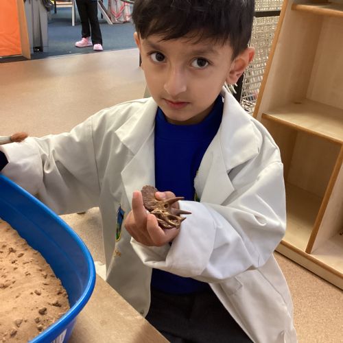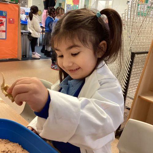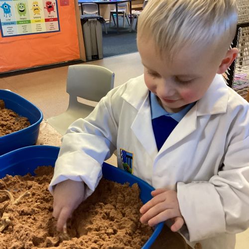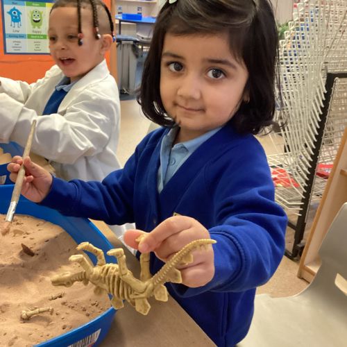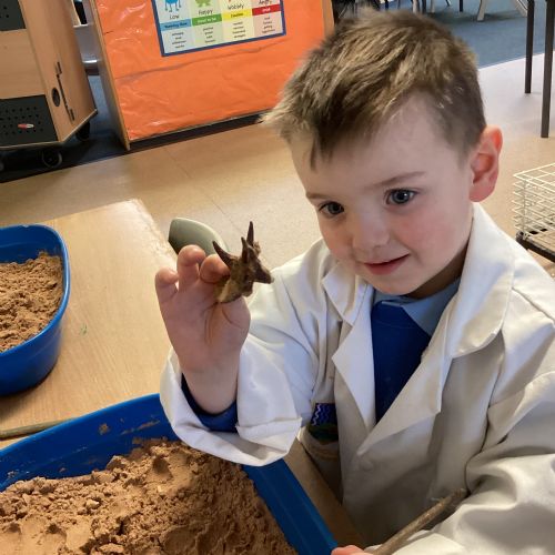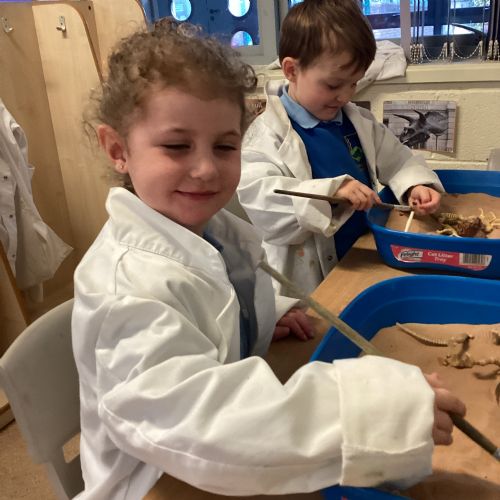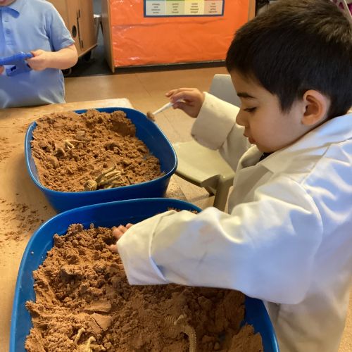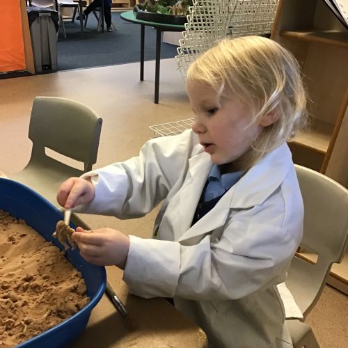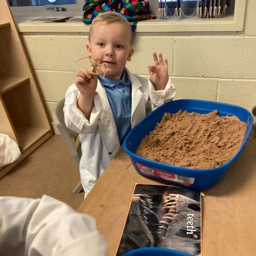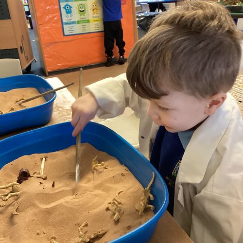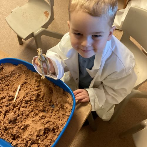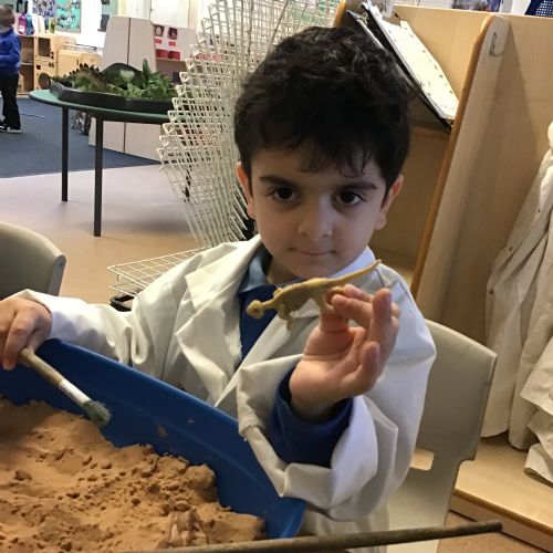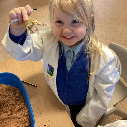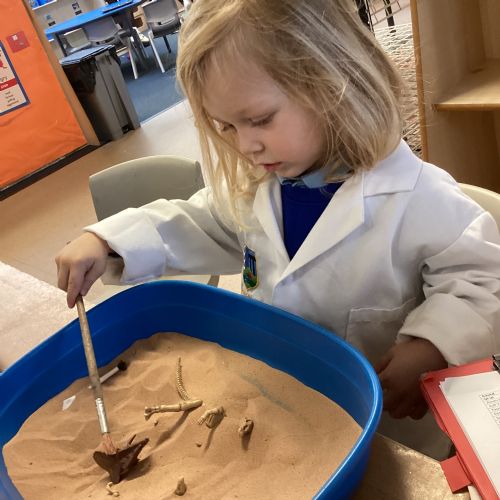 This term in nursery we are learning all about dinosaurs! We have been role playing as palaeontologists, exploring the dino dig, brushing around the sand looking for dinosaur bones!