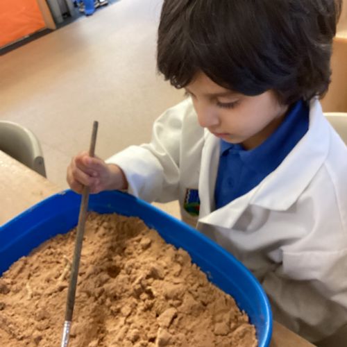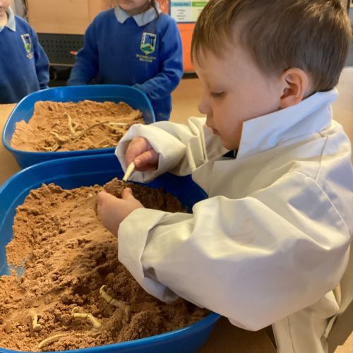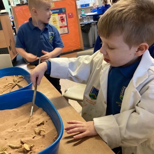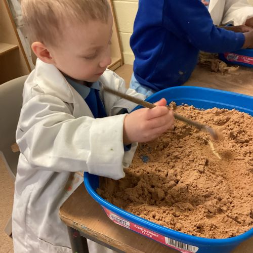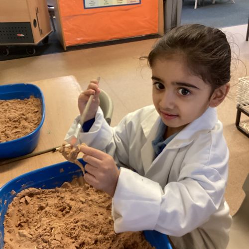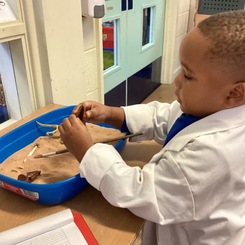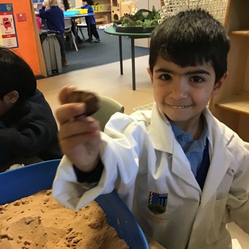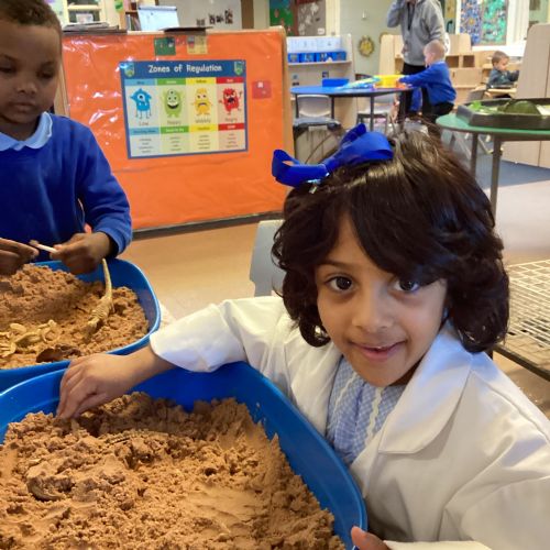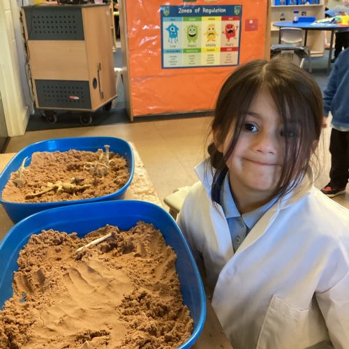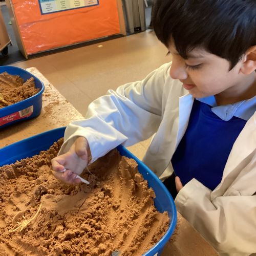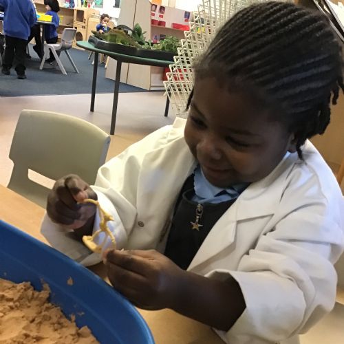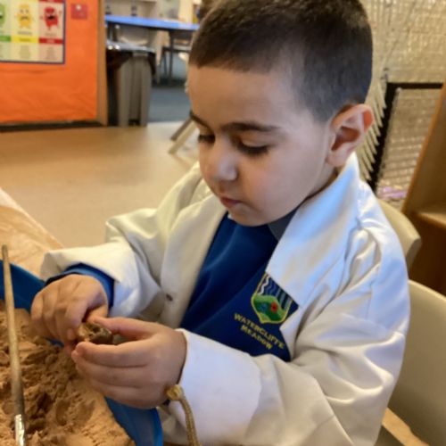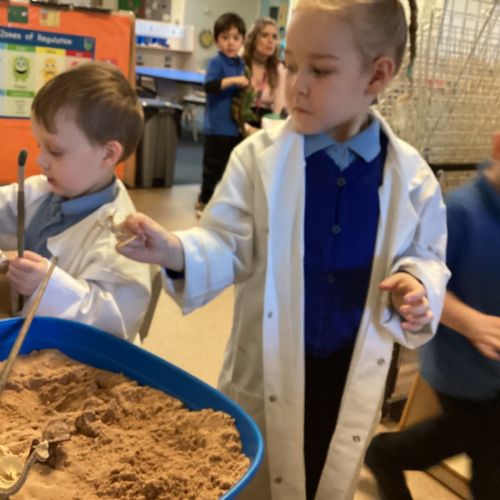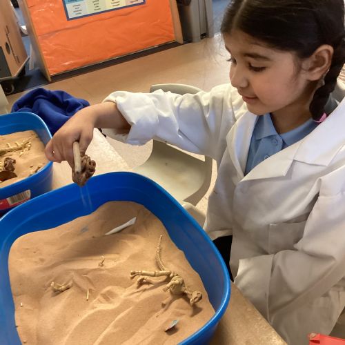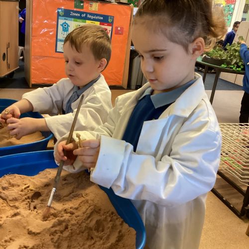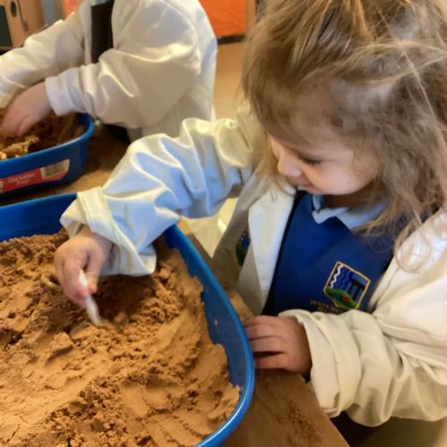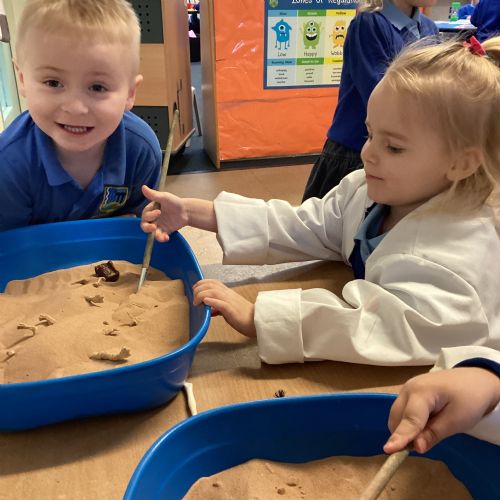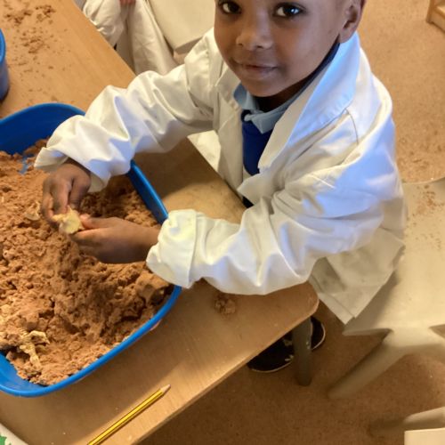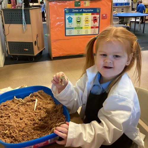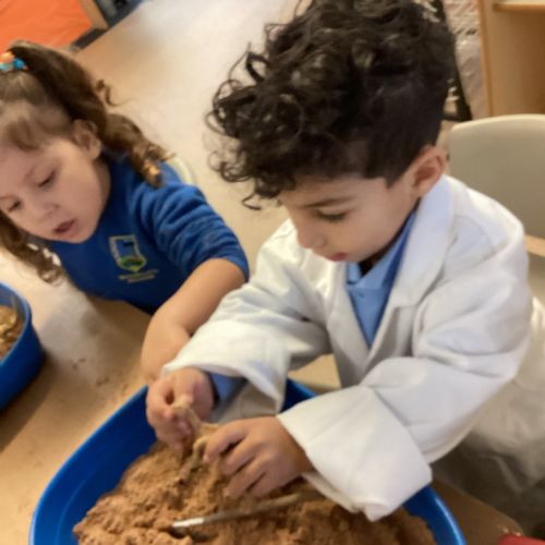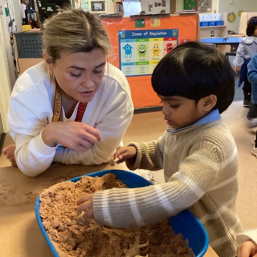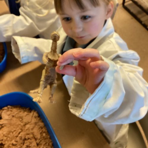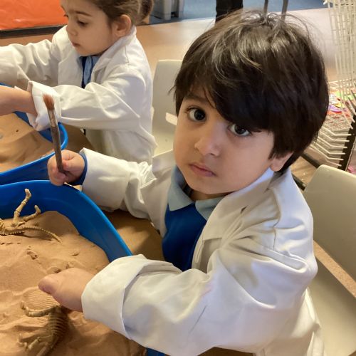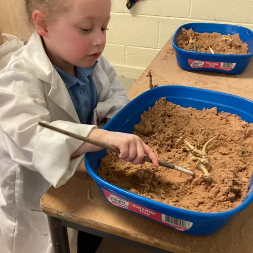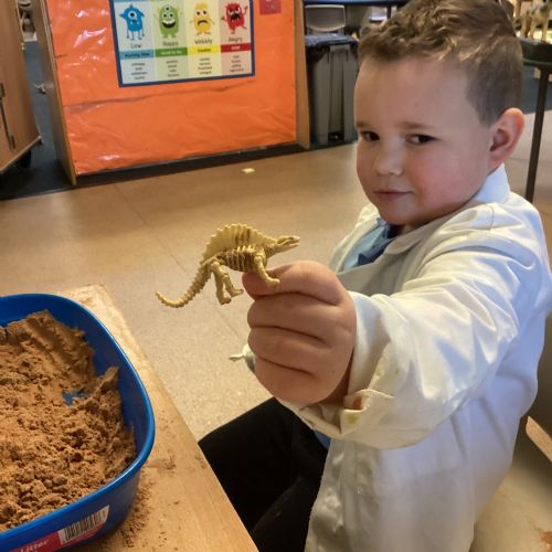 This term in nursery we are learning all about dinosaurs! We have been role playing as palaeontologists, exploring the dino dig, brushing around the sand looking for dinosaur bones!