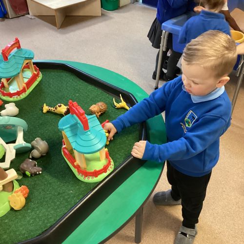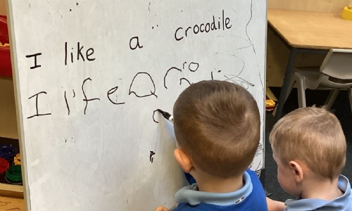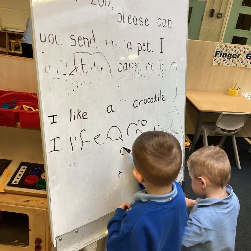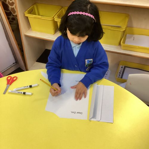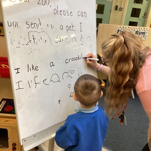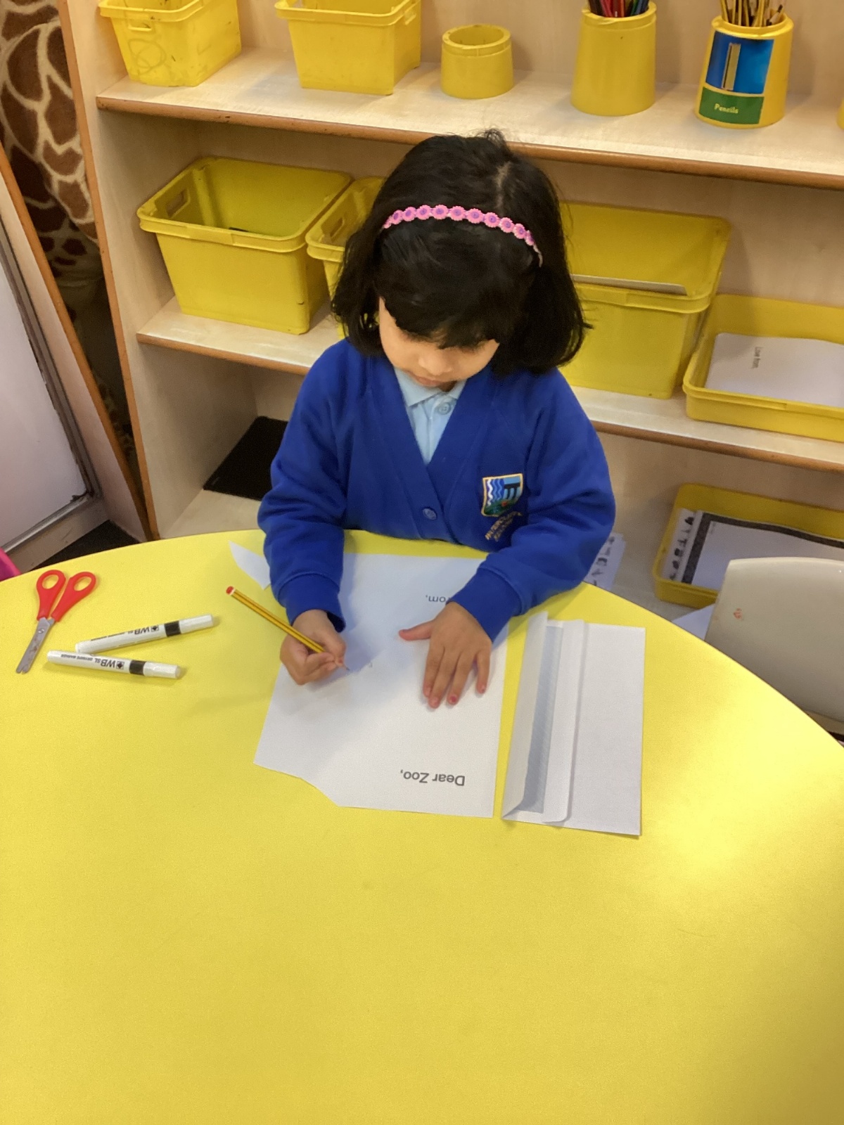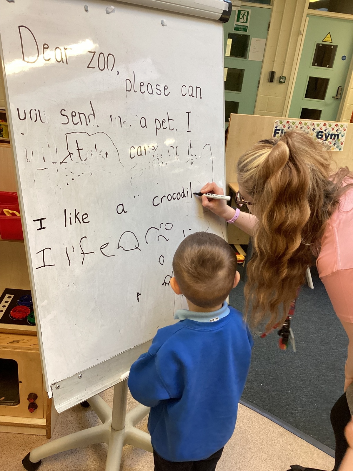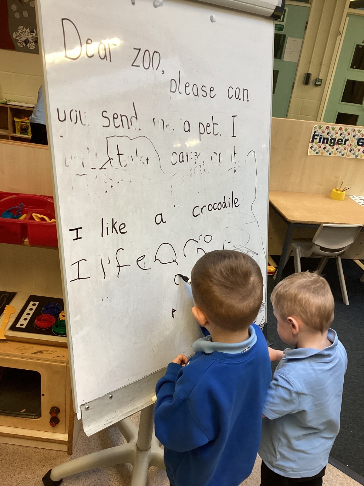 This week we have read the story Dear Zoo and in the provision we have enjoyed building enclosures for animals, playing with the zoo animals in the black tray and writing letters to the zoo. Special shout out to Lennie for his amazing writing on the whiteboard where he copied his sentence I like a crocodile. Miss Houghton was so proud of him!