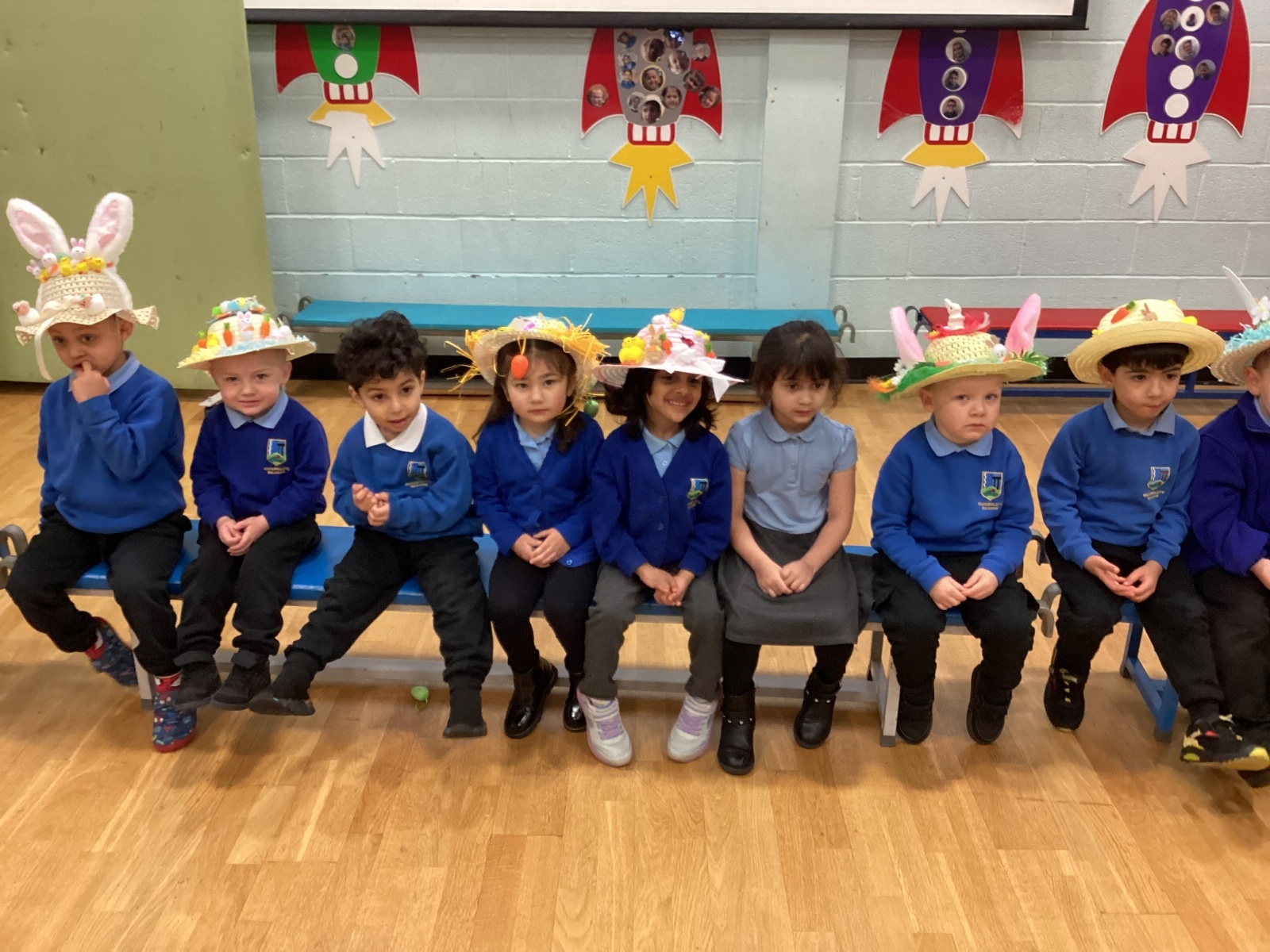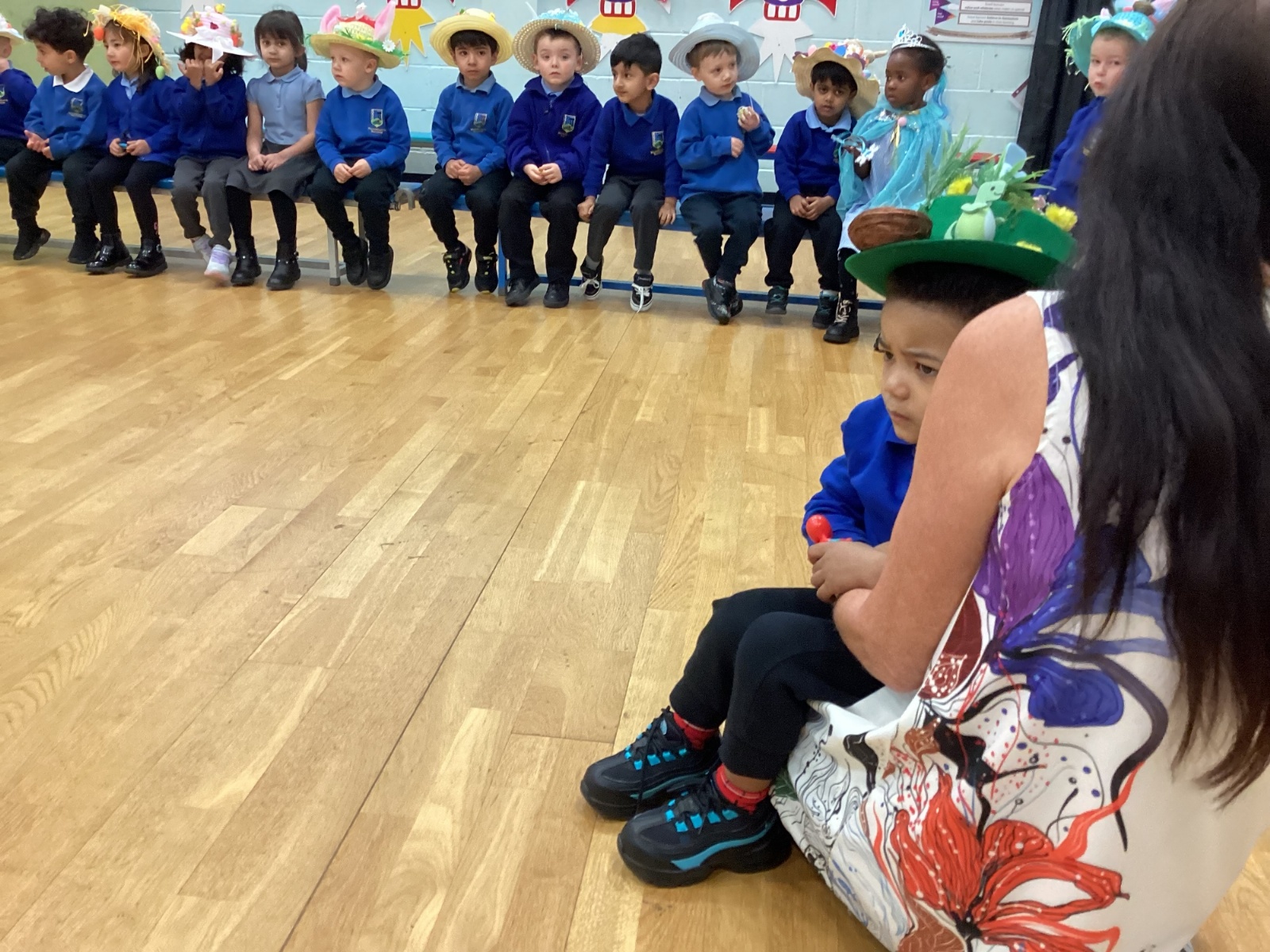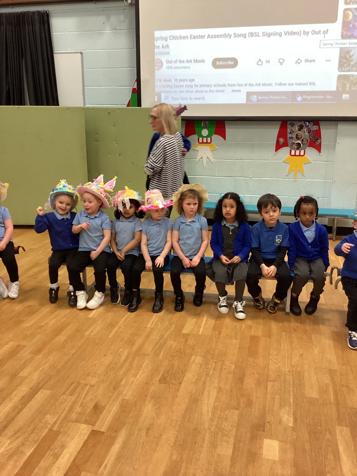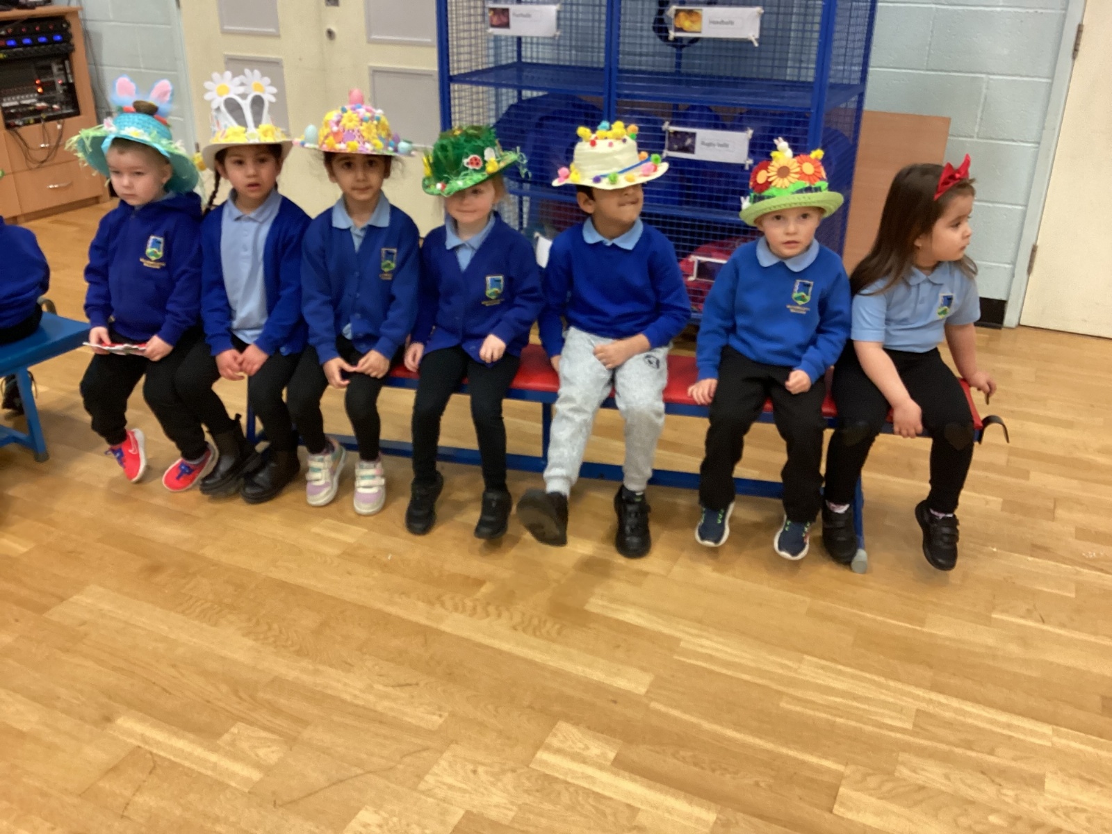 Today was our Easter Bonnet parade. Lots of us made amazing bonnets at home which our teachers were very impressed with! We sang the Spring Chicken song for grown-ups and paraded around the hall wearing our bonnets. We were amazing!