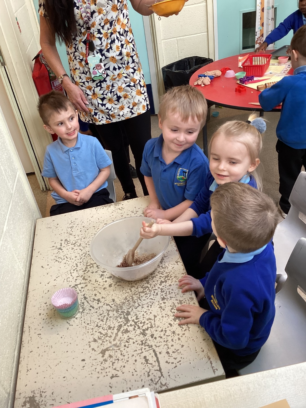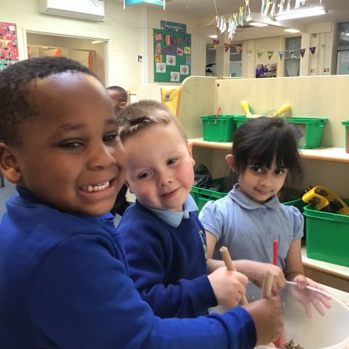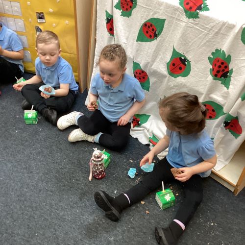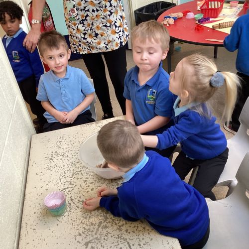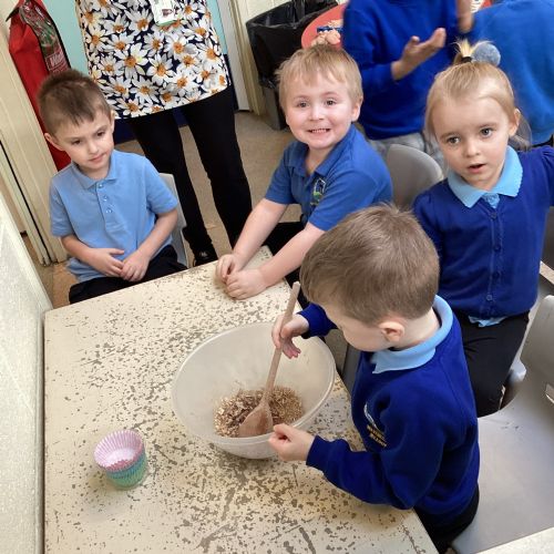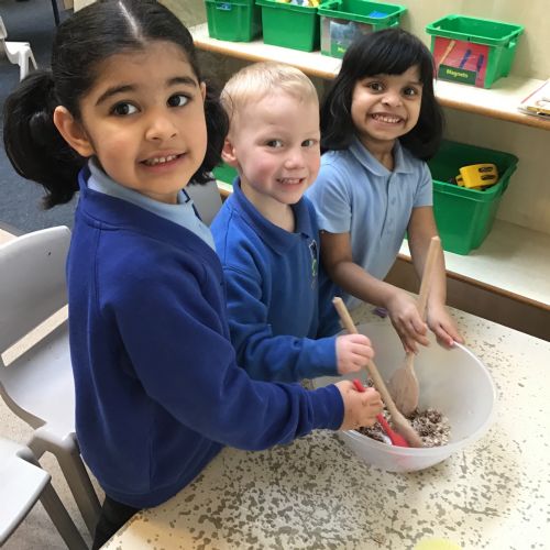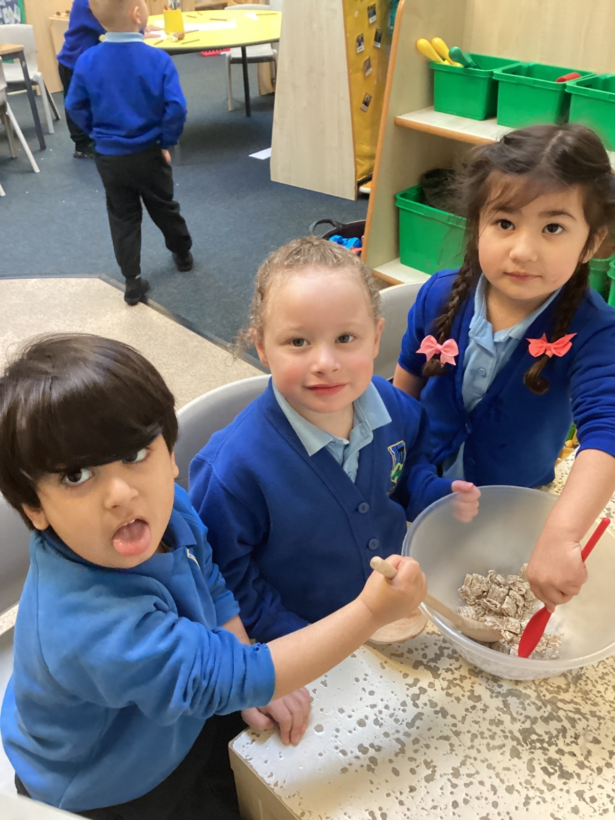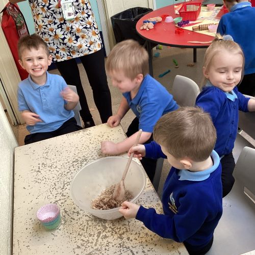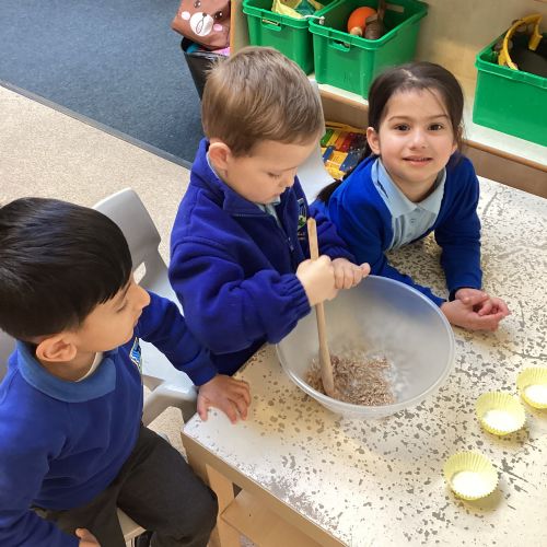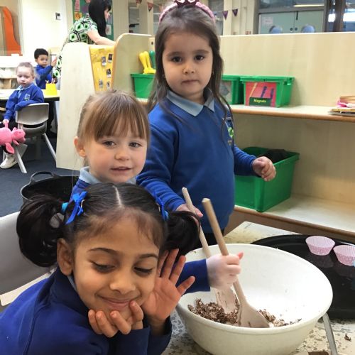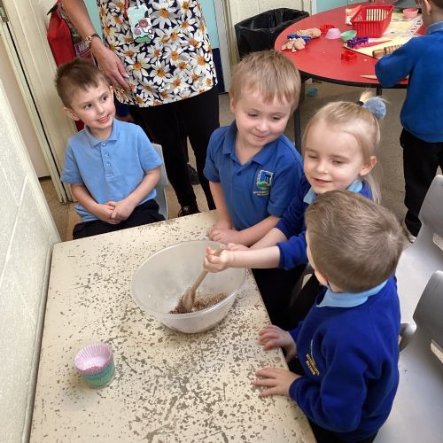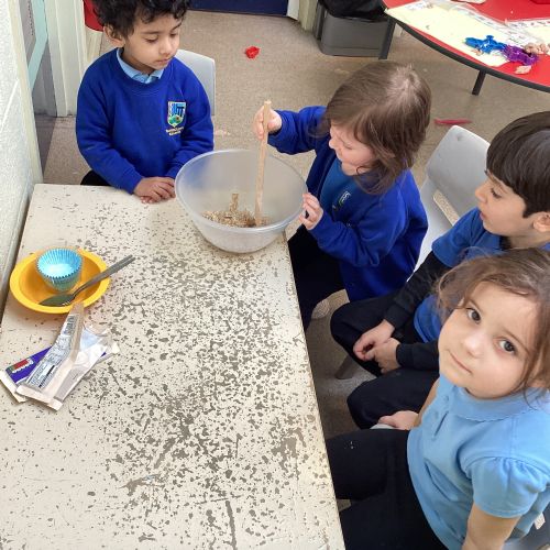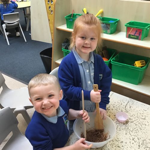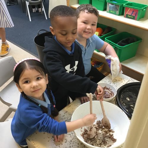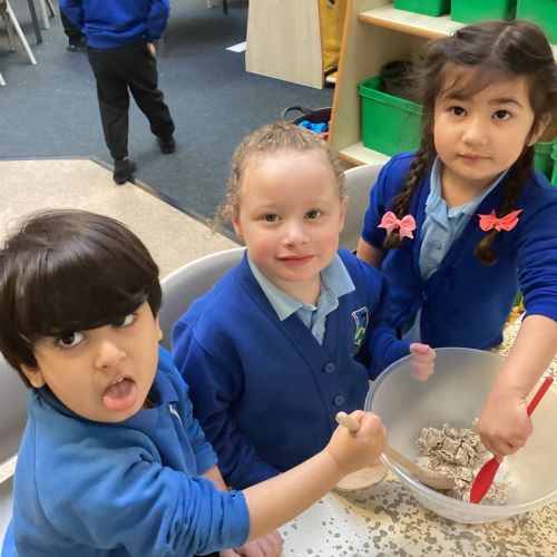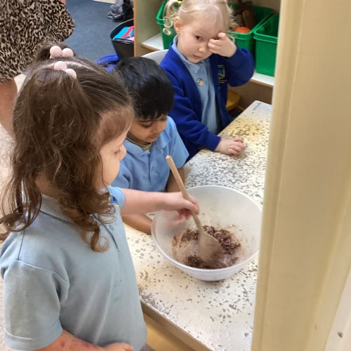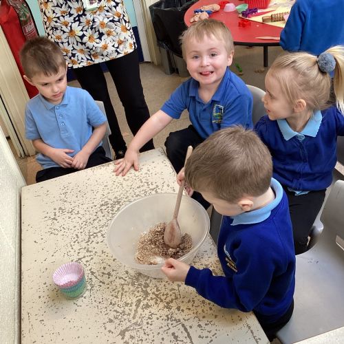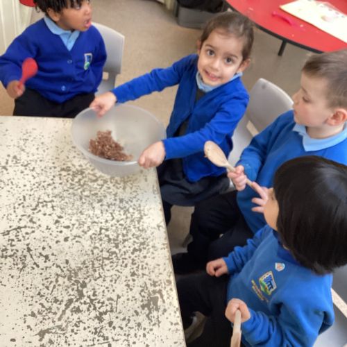 We have been making and eating delicious chocolate nests for Easter in Nursery. The children did such a good job working together to crunch and squish up the shredded cereal, melt the chocolate and stir together the mixture.