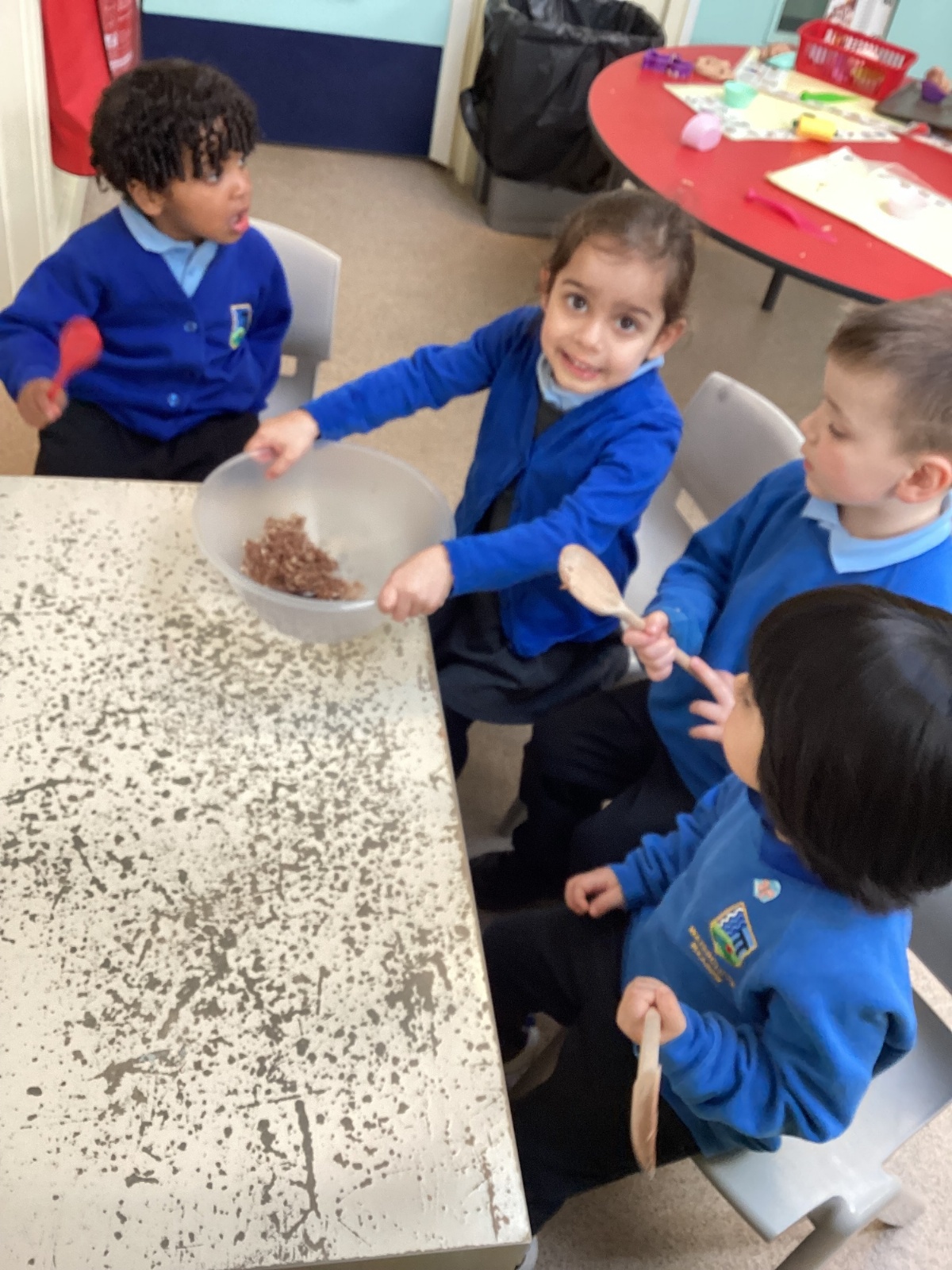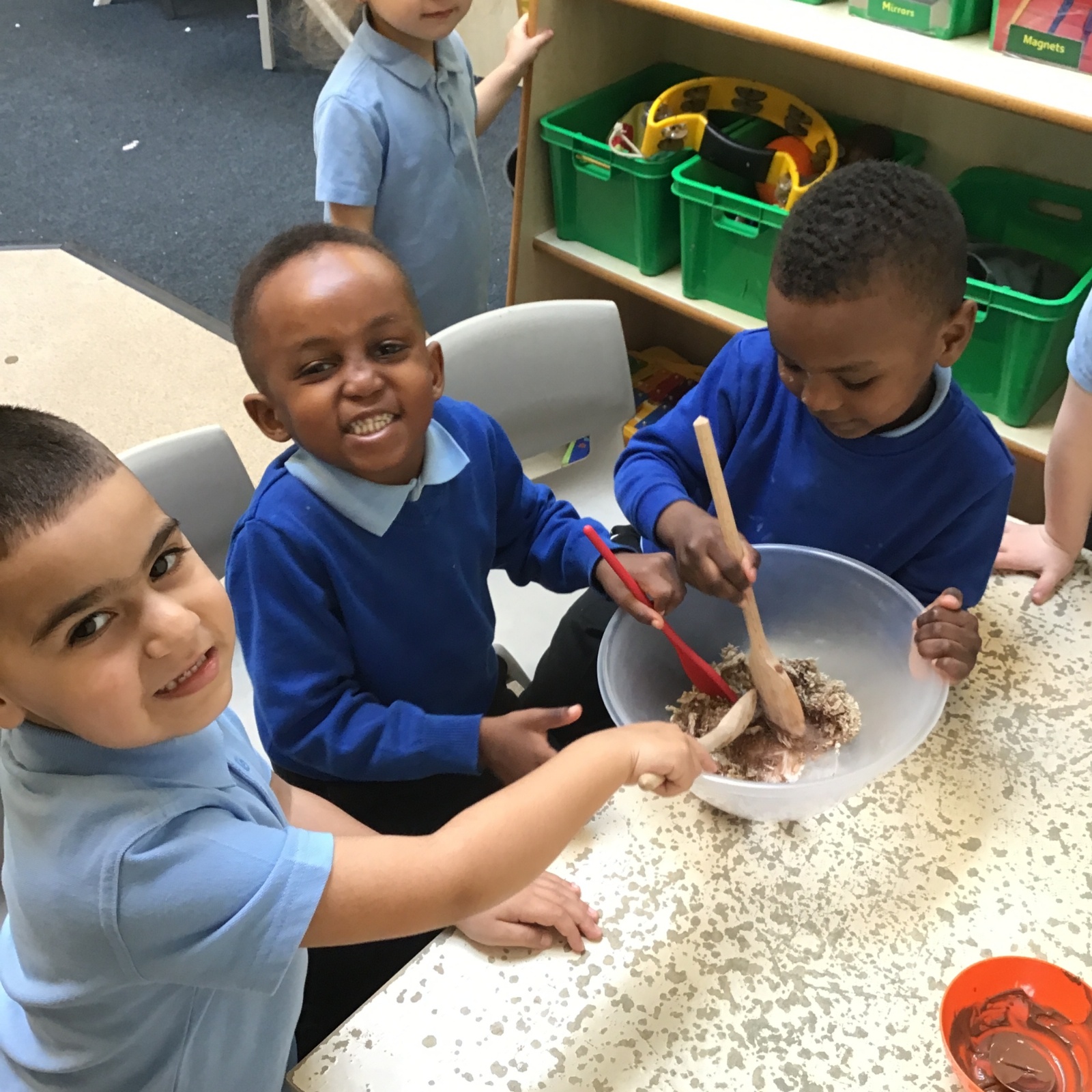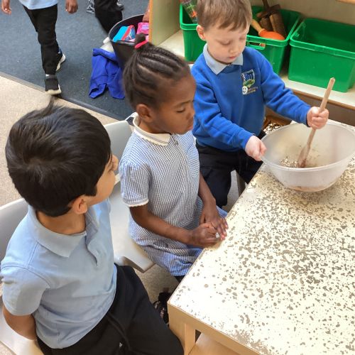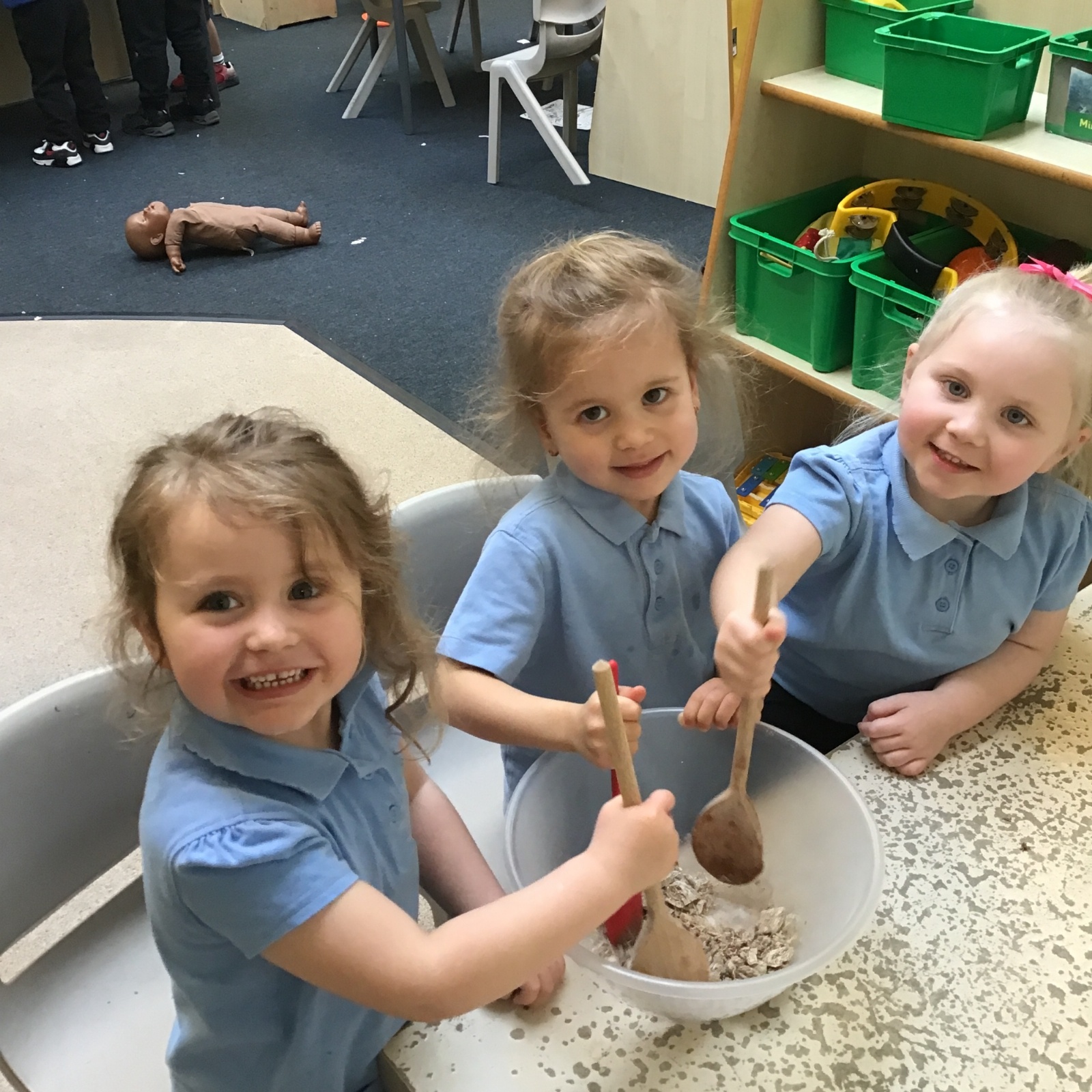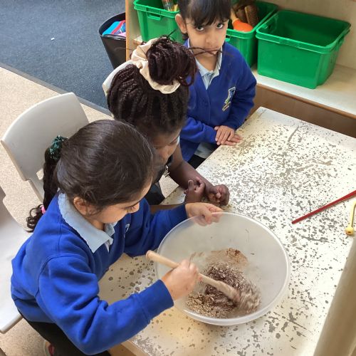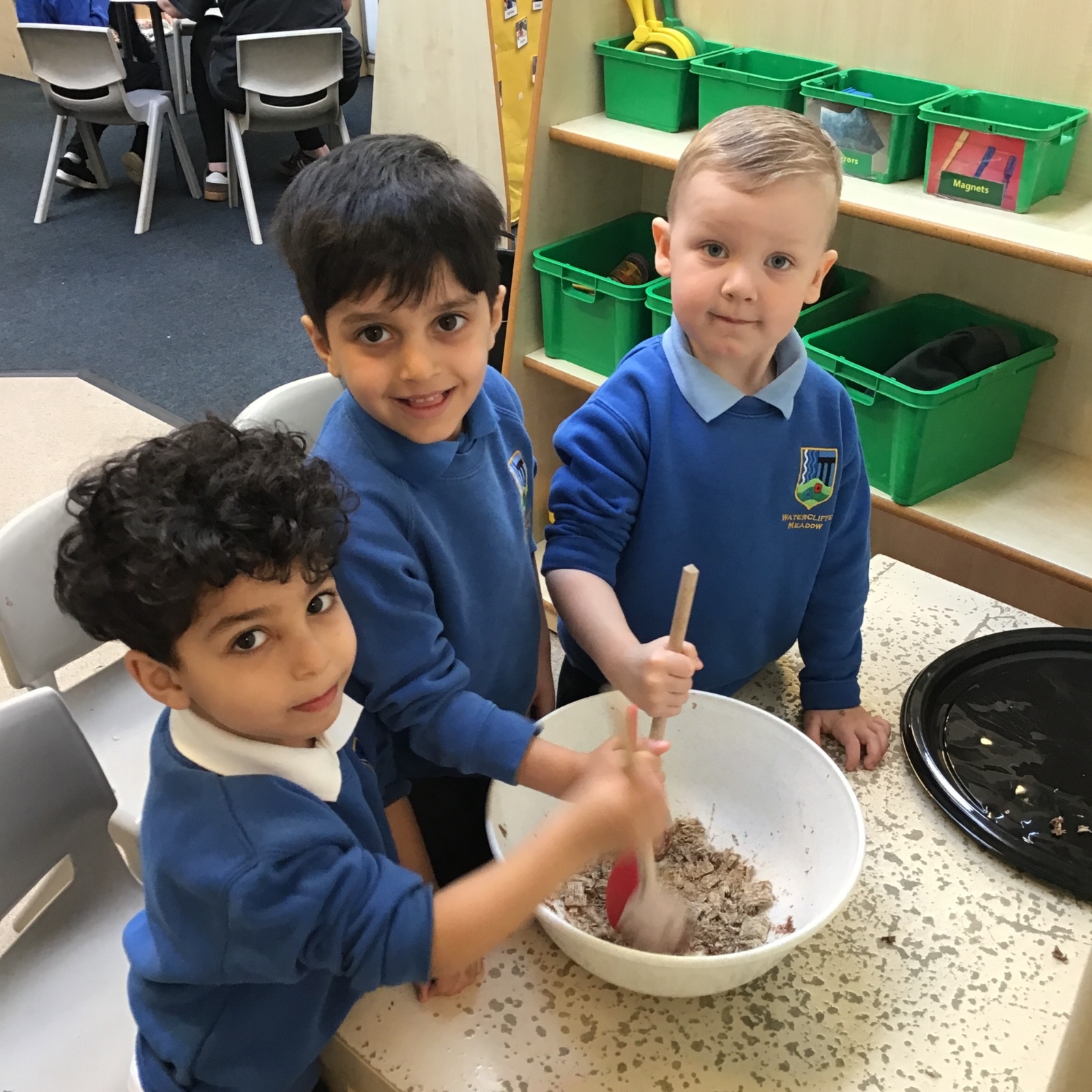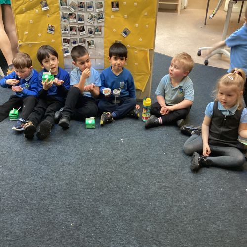 We have been making and eating delicious chocolate nests for Easter in Nursery. The children did such a good job working together to crunch and squish up the shredded cereal, melt the chocolate and stir together the mixture.