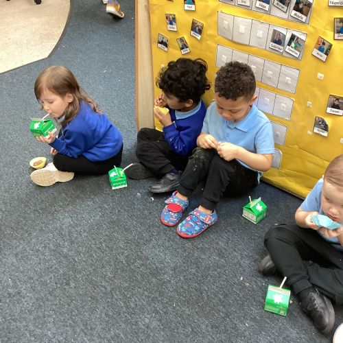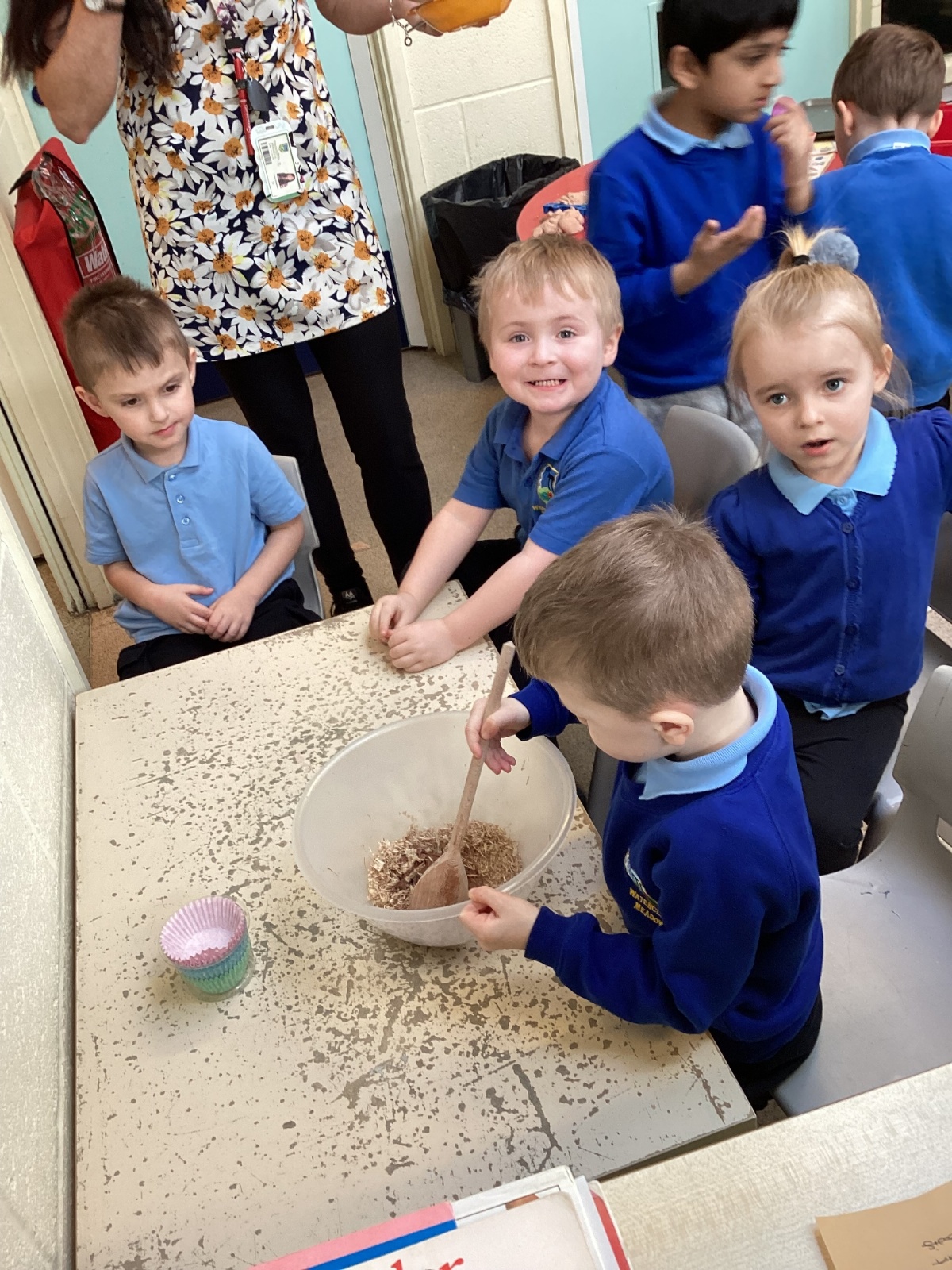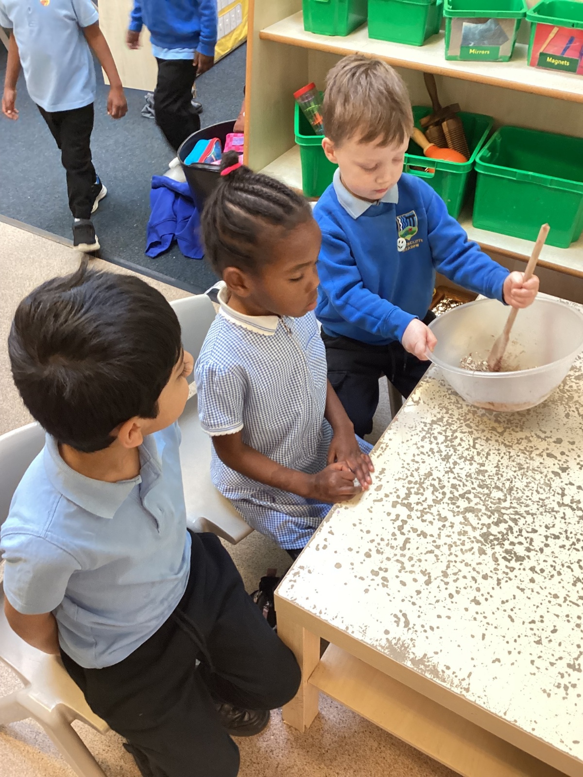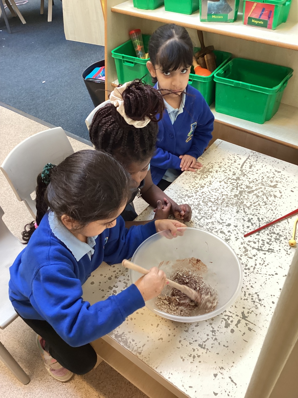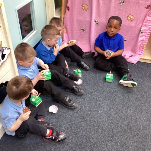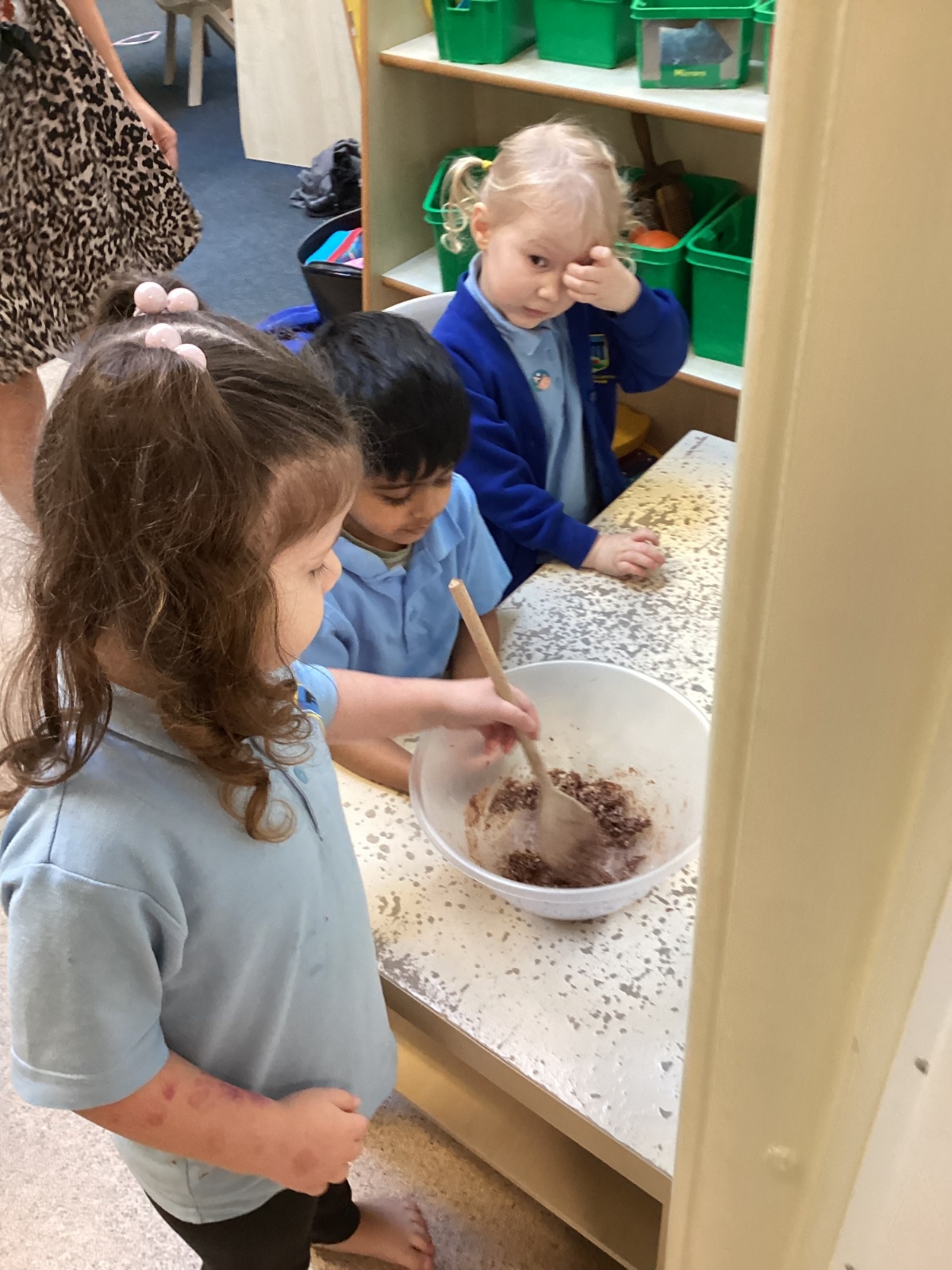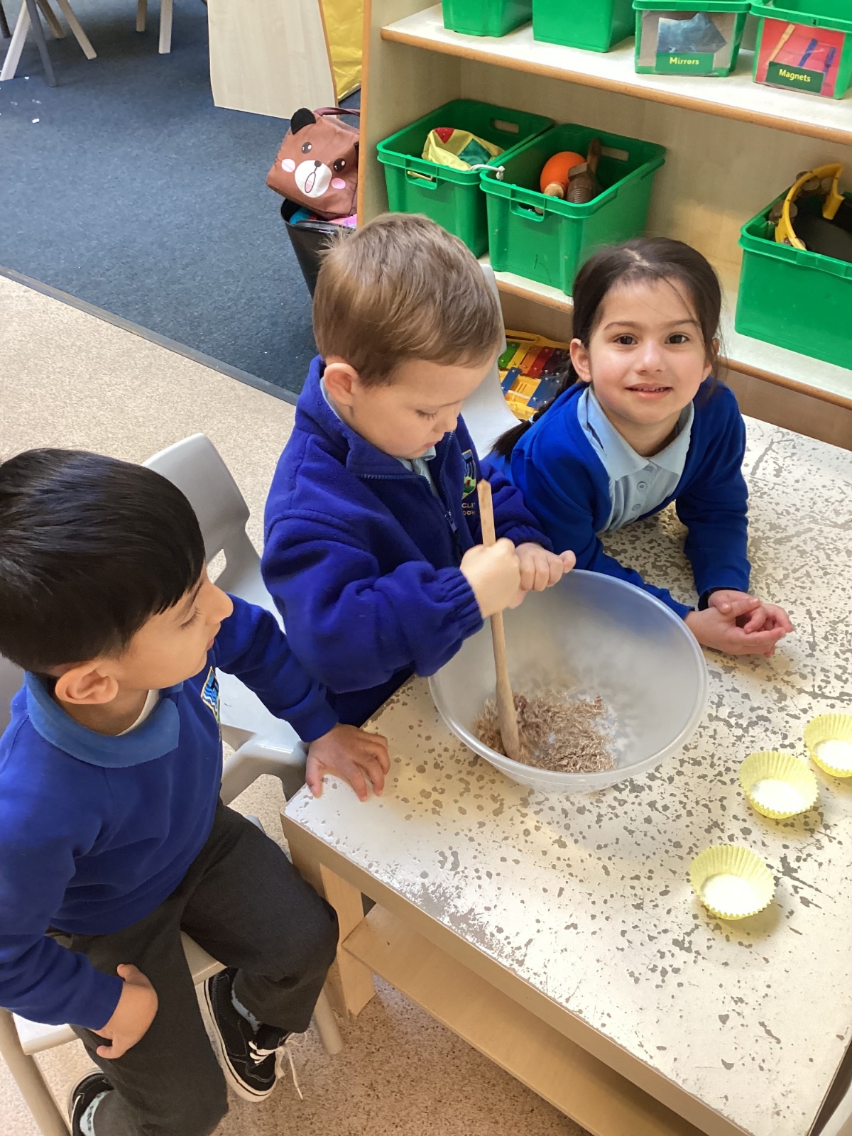 We have been making and eating delicious chocolate nests for Easter in Nursery. The children did such a good job working together to crunch and squish up the shredded cereal, melt the chocolate and stir together the mixture.