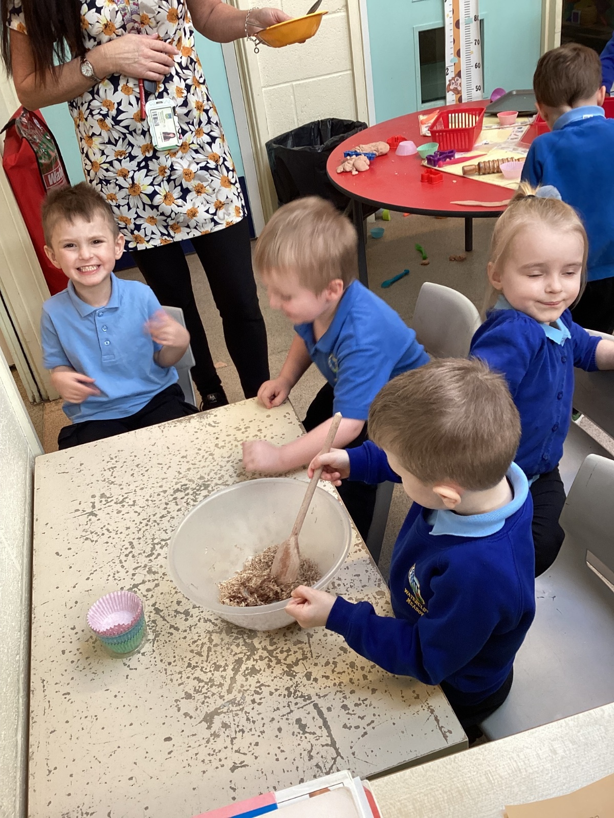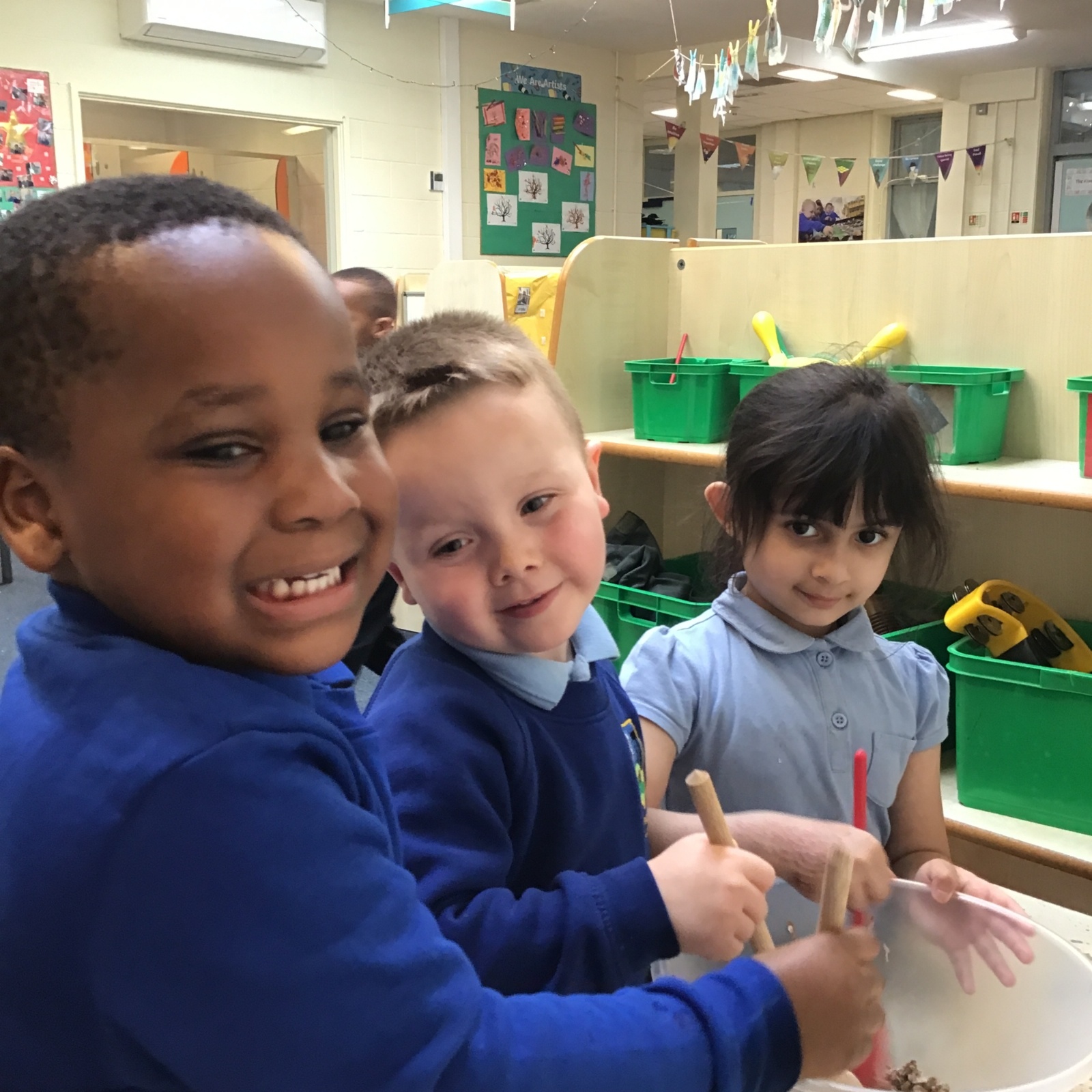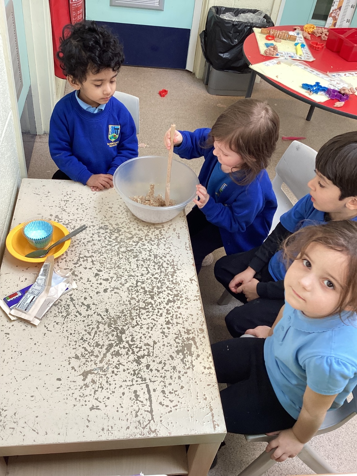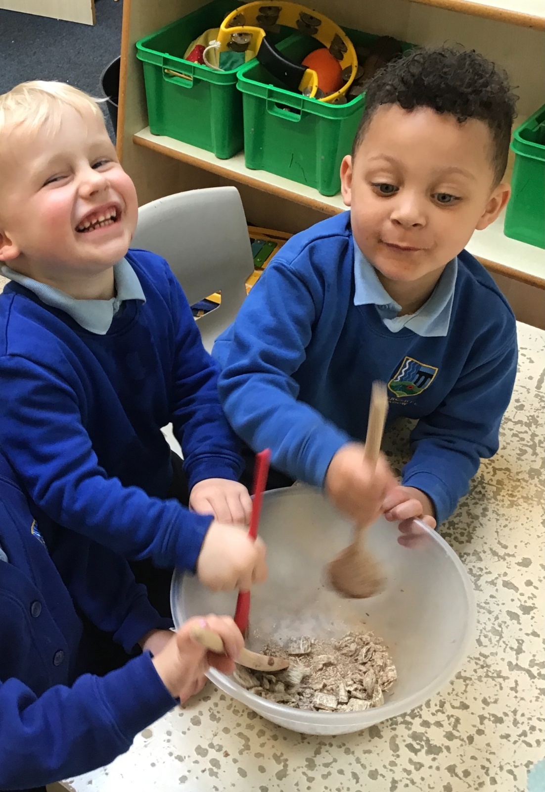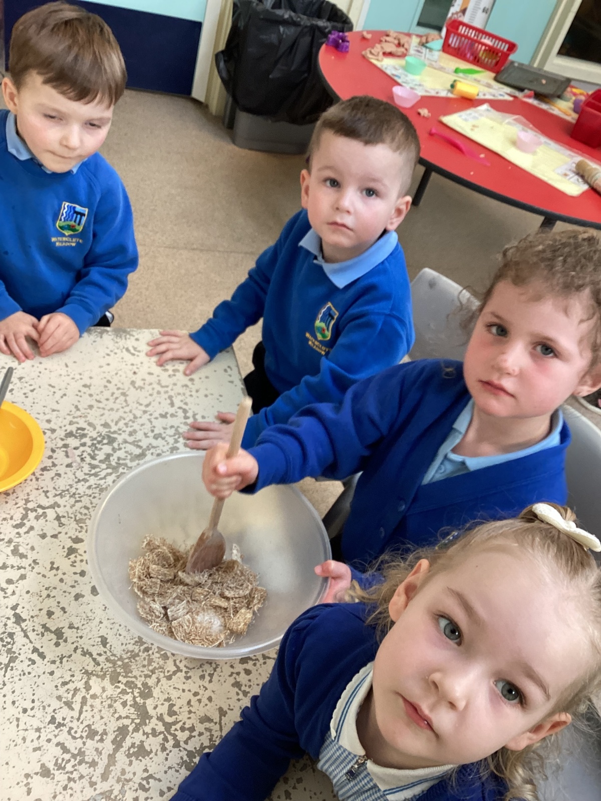 We have been making and eating delicious chocolate nests for Easter in Nursery. The children did such a good job working together to crunch and squish up the shredded cereal, melt the chocolate and stir together the mixture.