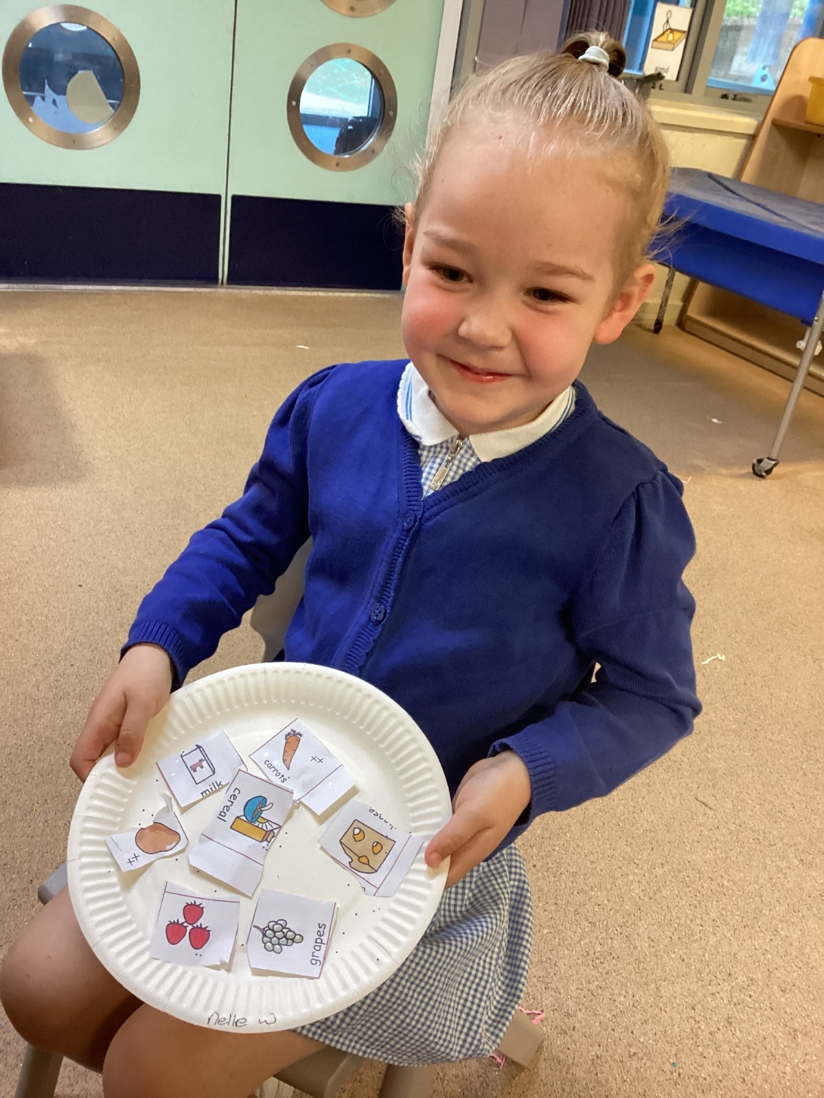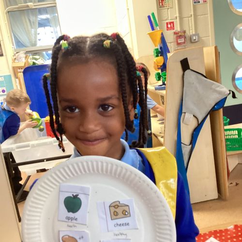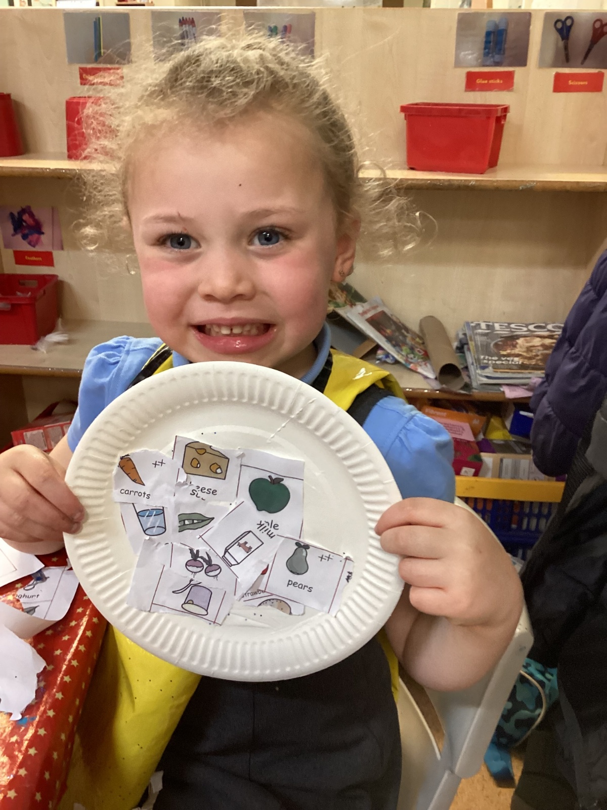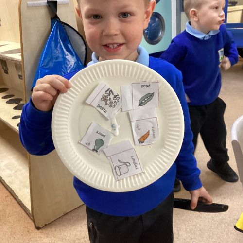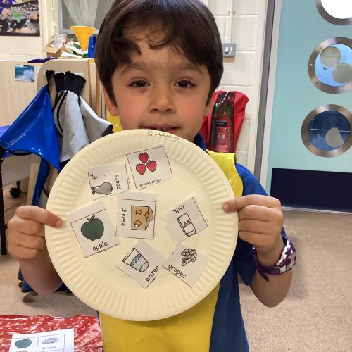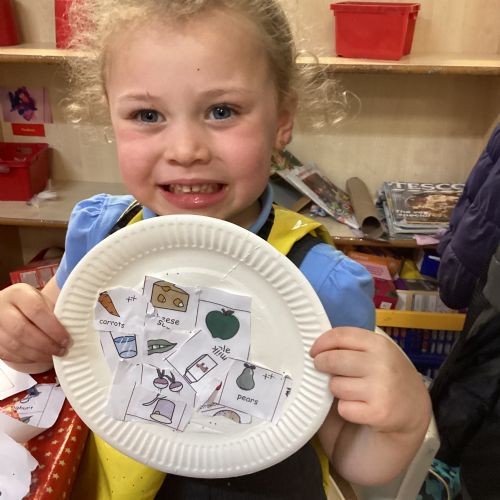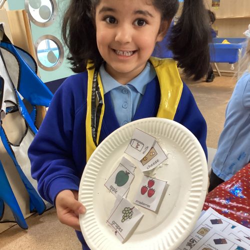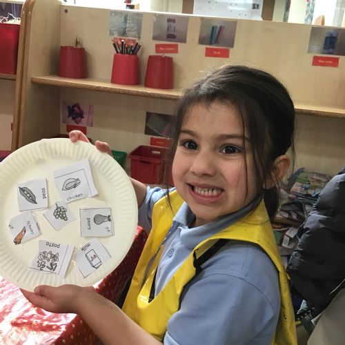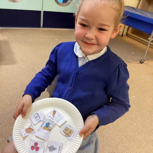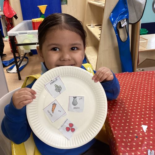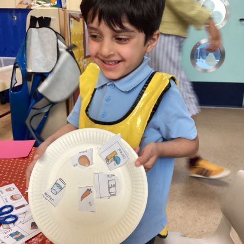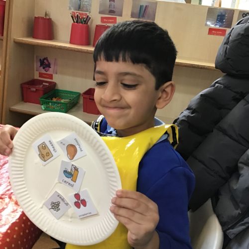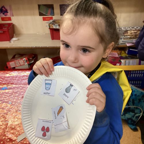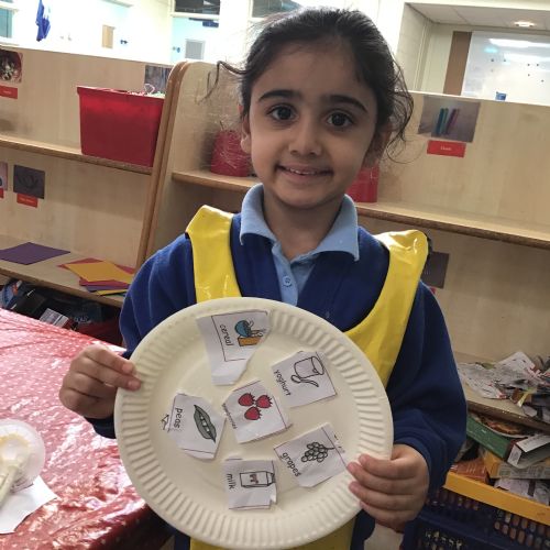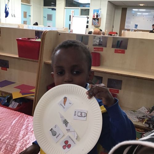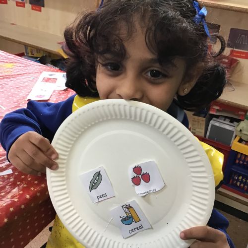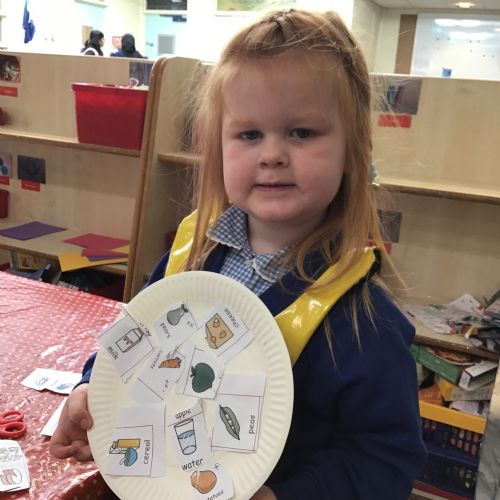 We have been practising our fine motor skills and food knowledge skills this week. We have been selecting healthy foods and cutting them out to stick onto our plates this week.