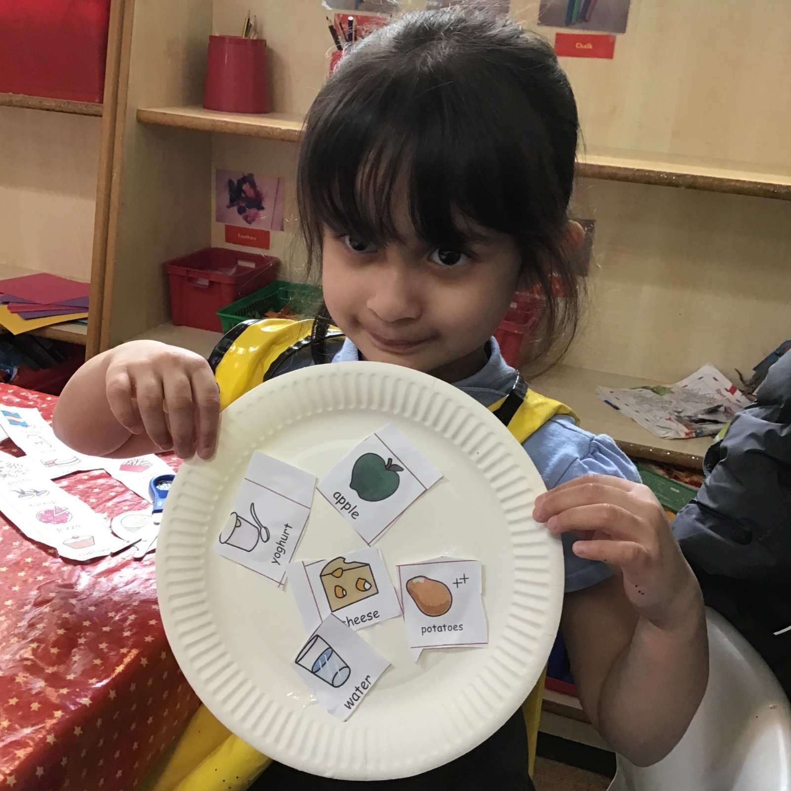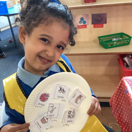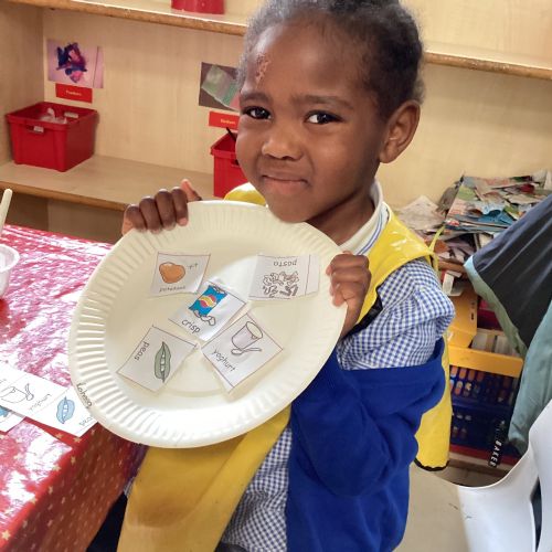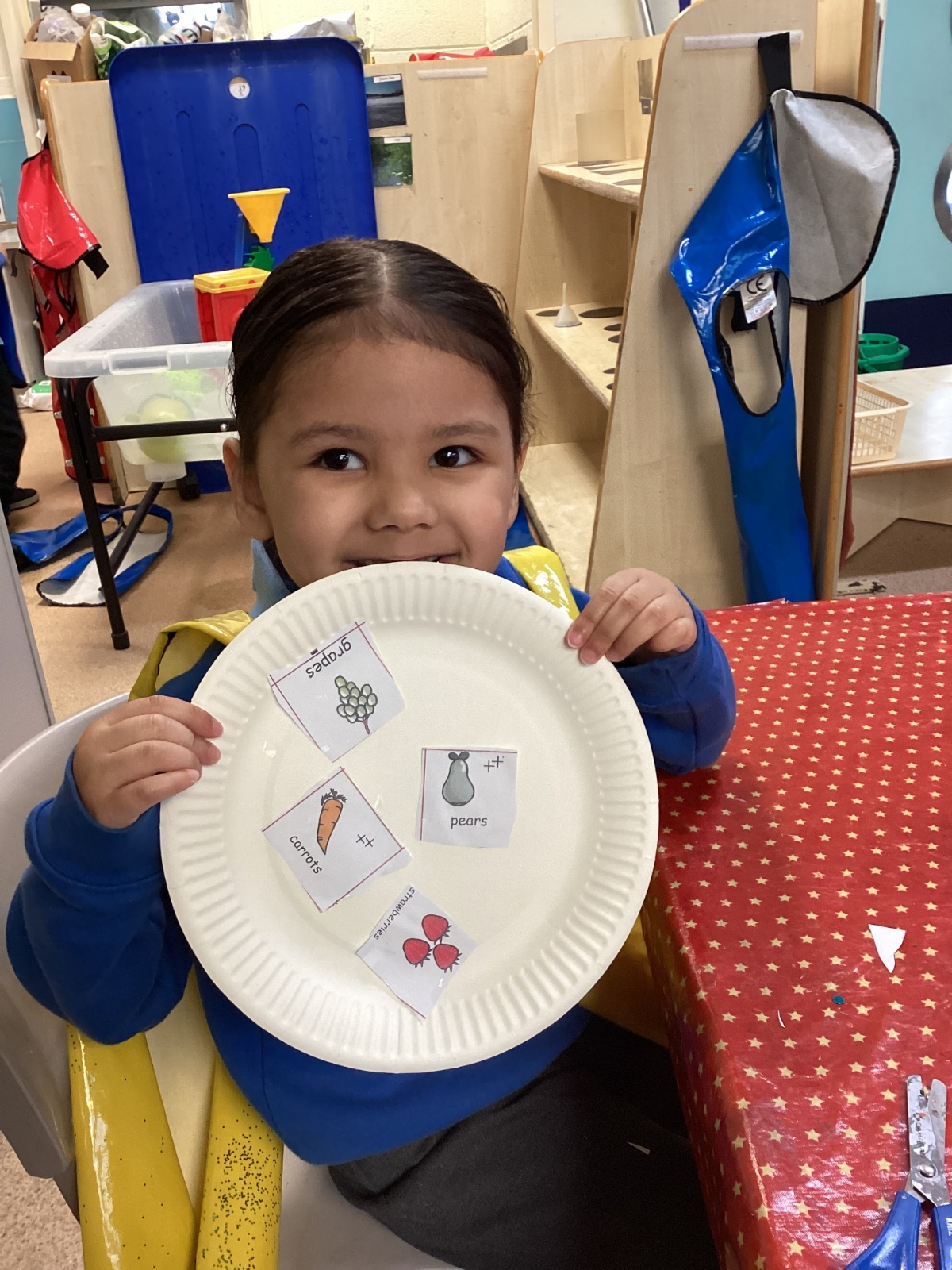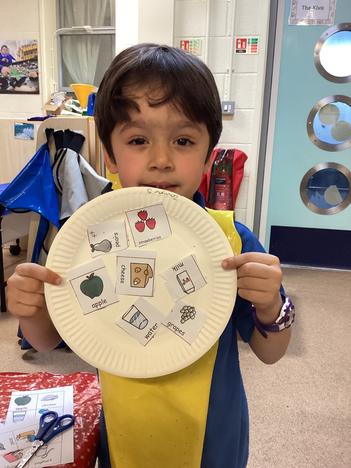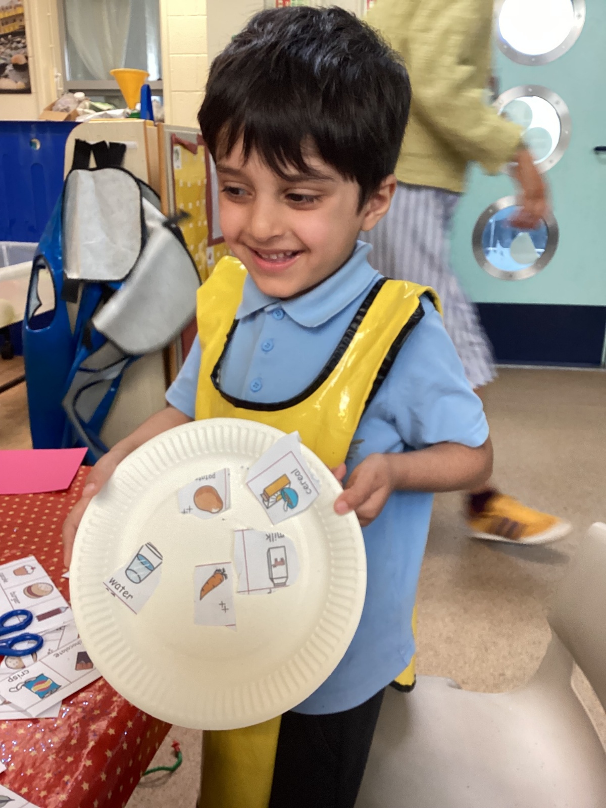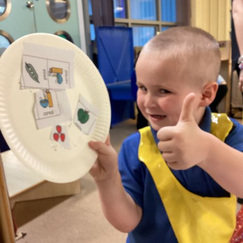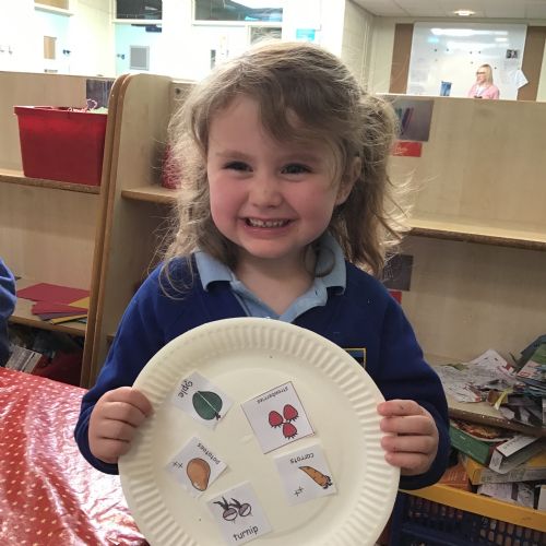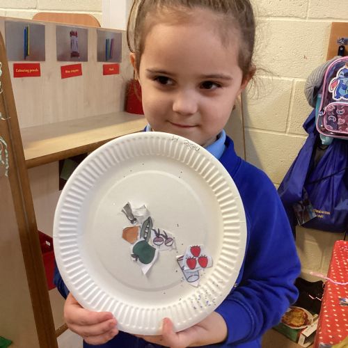 We have been practising our fine motor skills and food knowledge skills this week. We have been selecting healthy foods and cutting them out to stick onto our plates this week.