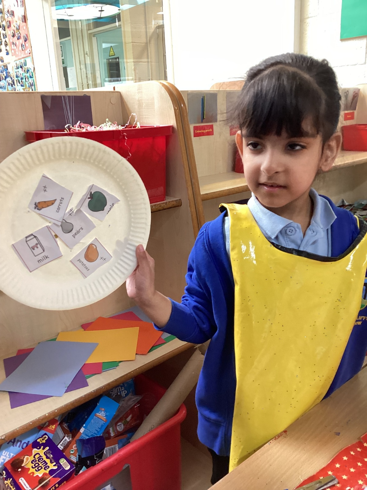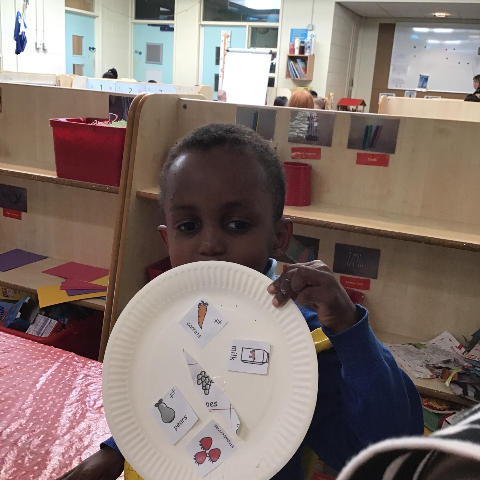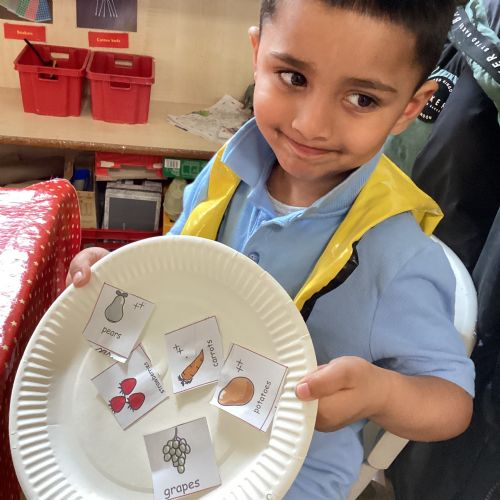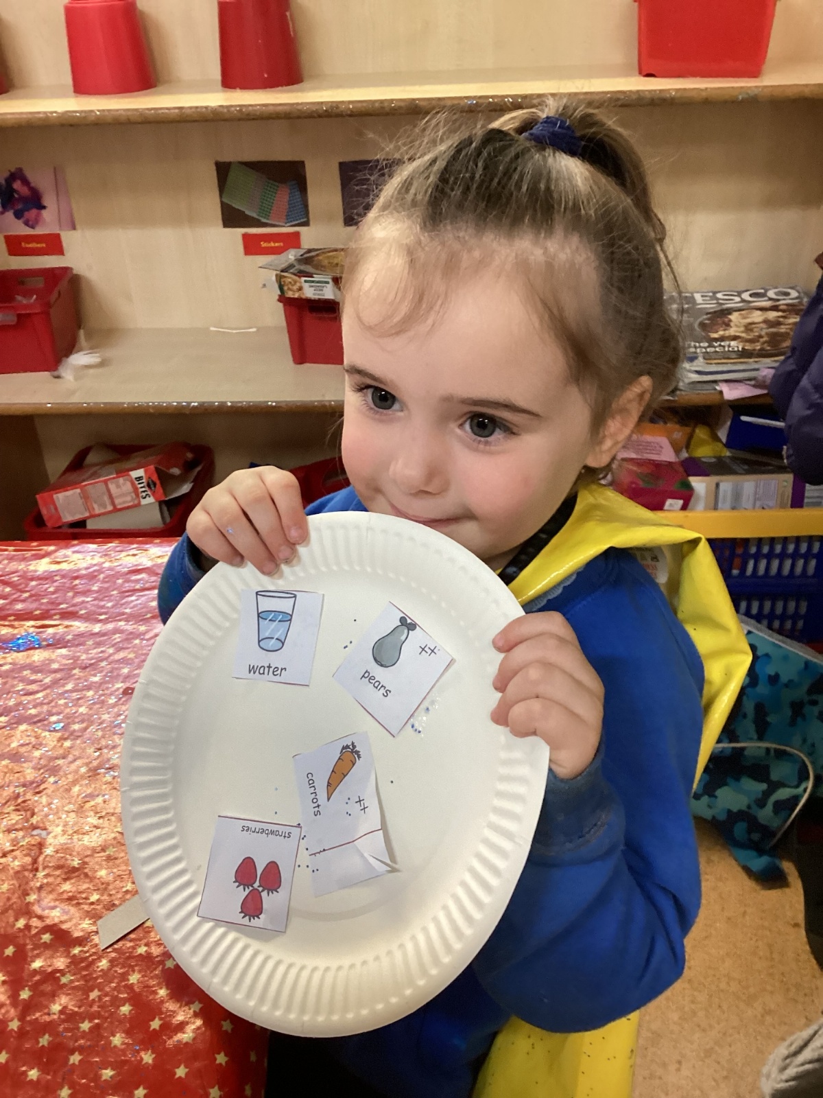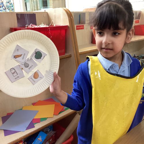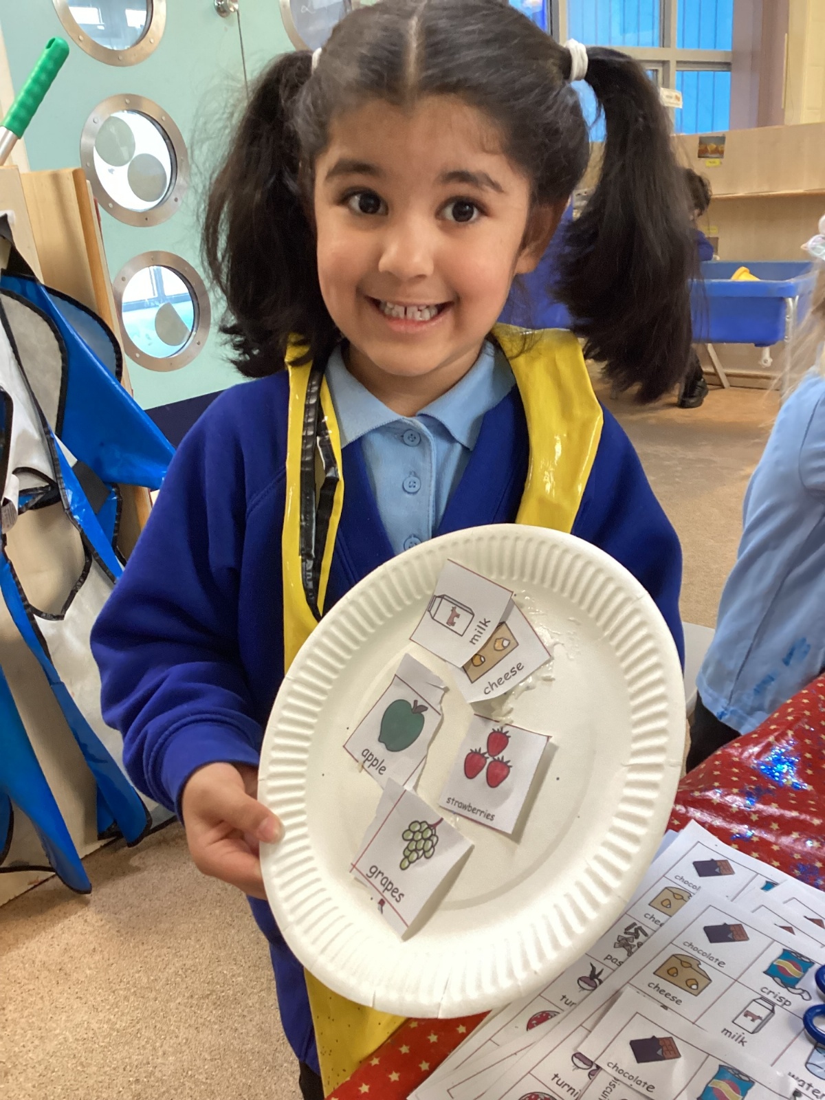 We have been practising our fine motor skills and food knowledge skills this week. We have been selecting healthy foods and cutting them out to stick onto our plates this week.