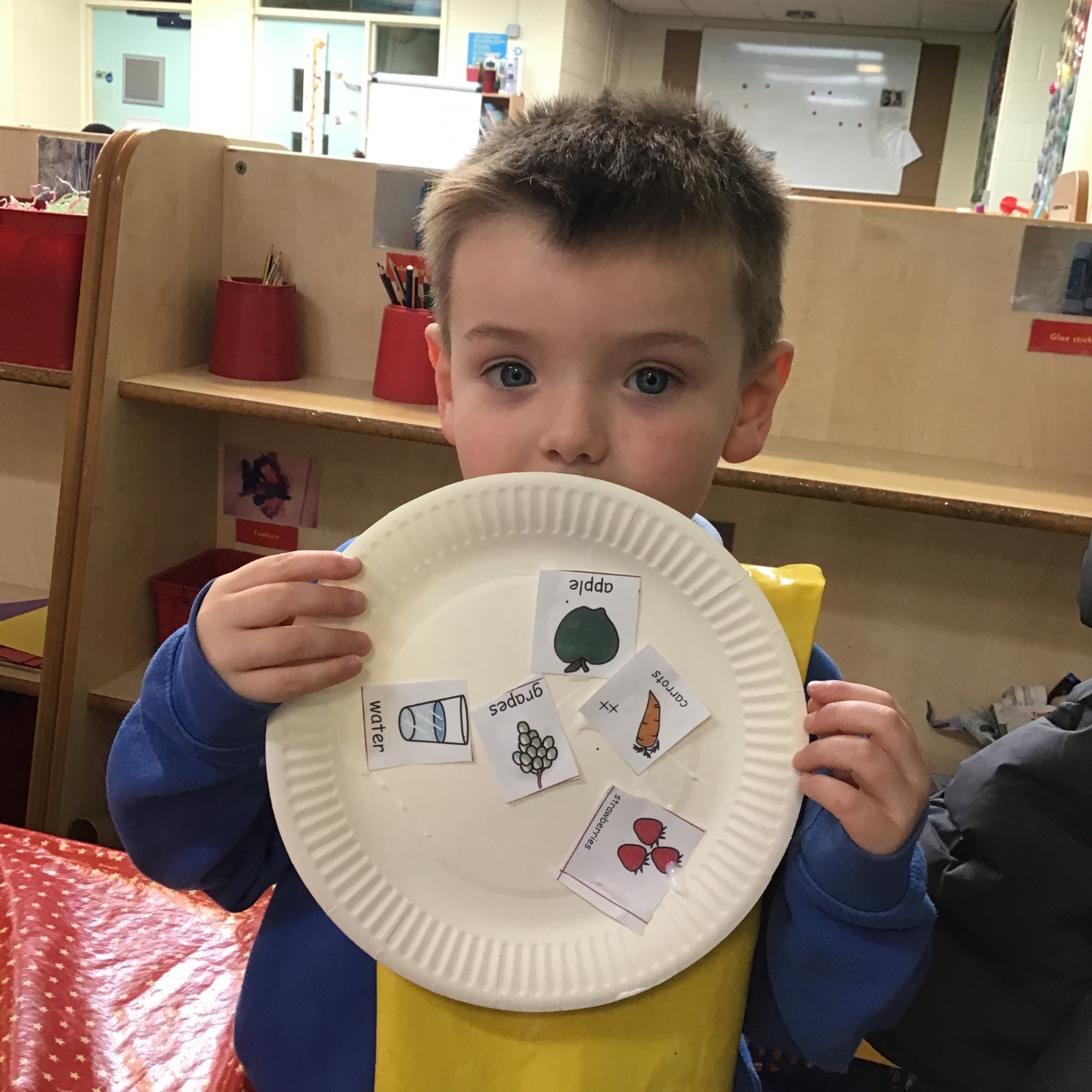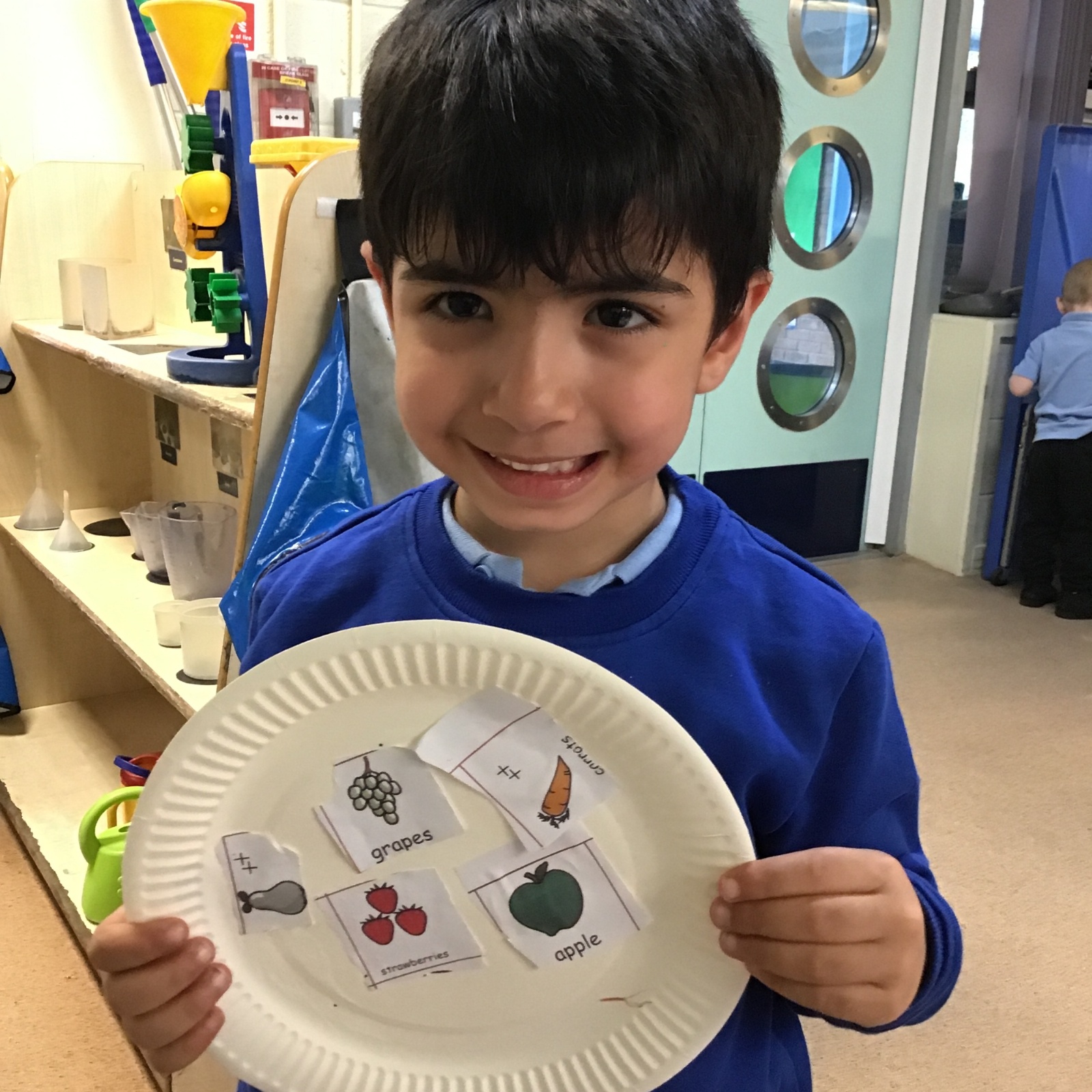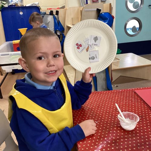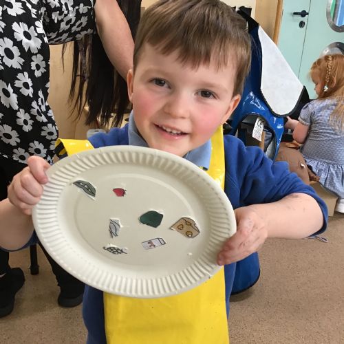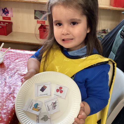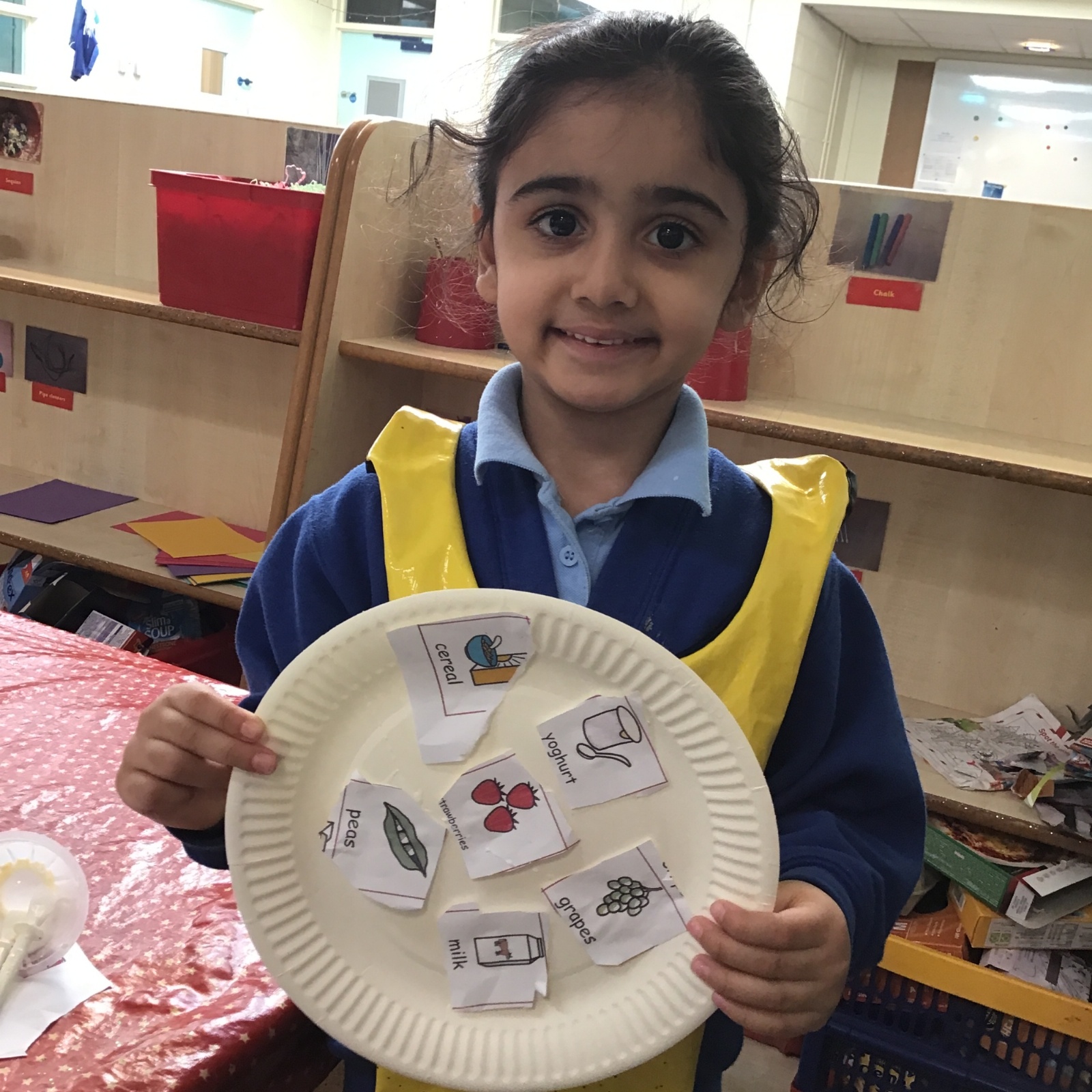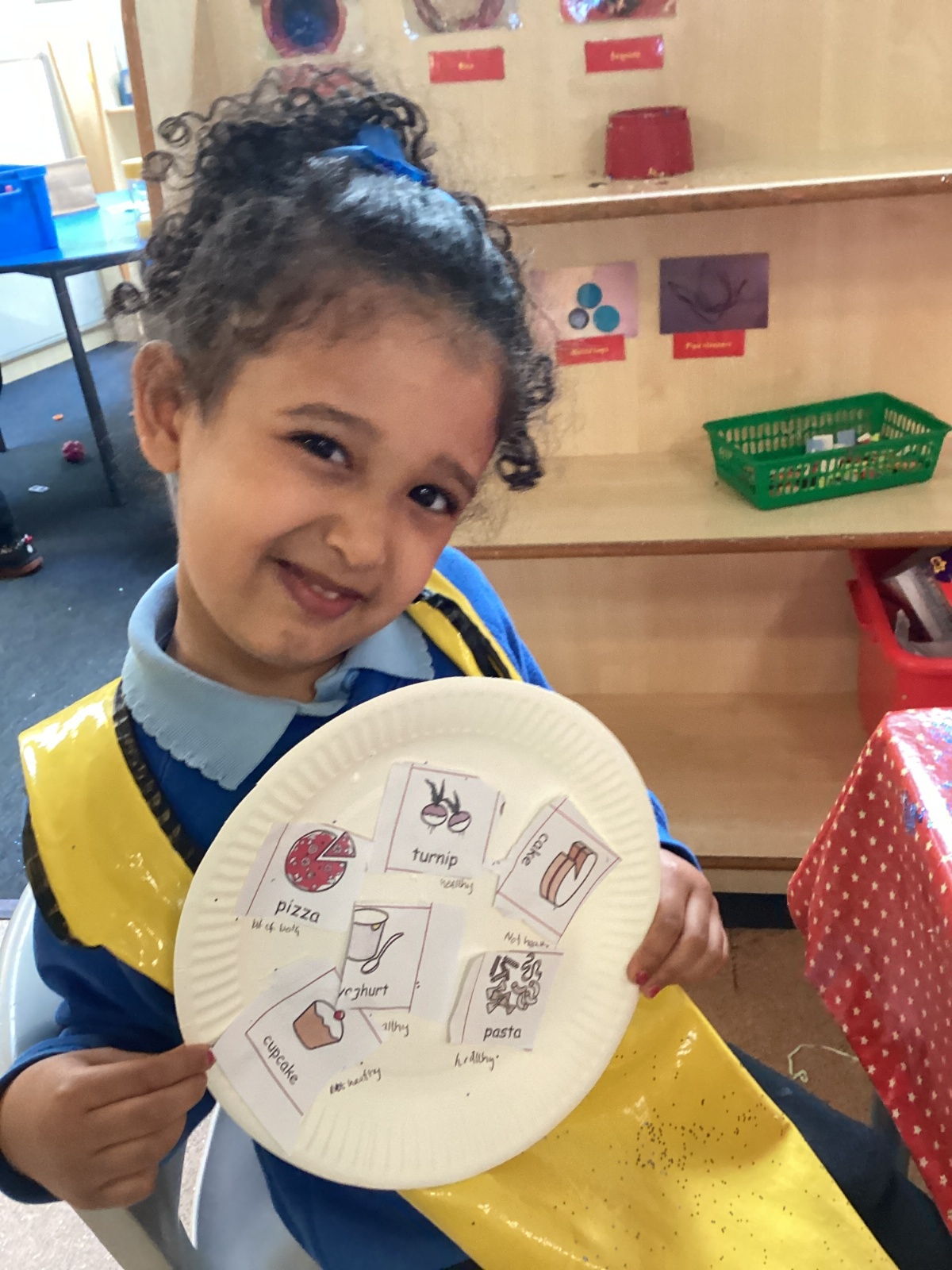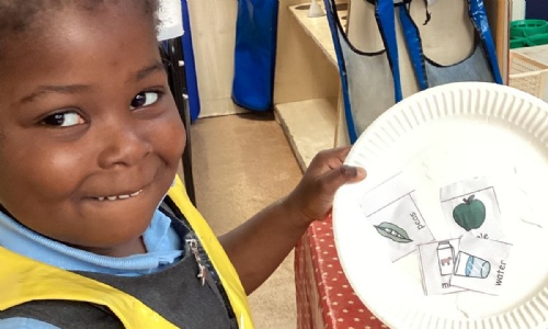 We have been practising our fine motor skills and food knowledge skills this week. We have been selecting healthy foods and cutting them out to stick onto our plates this week.