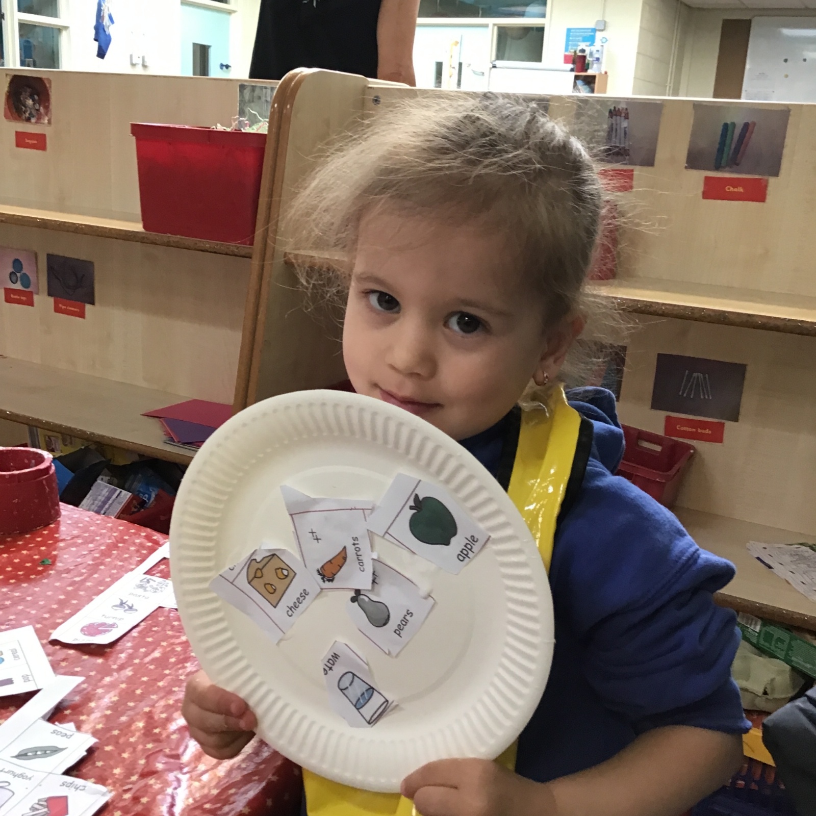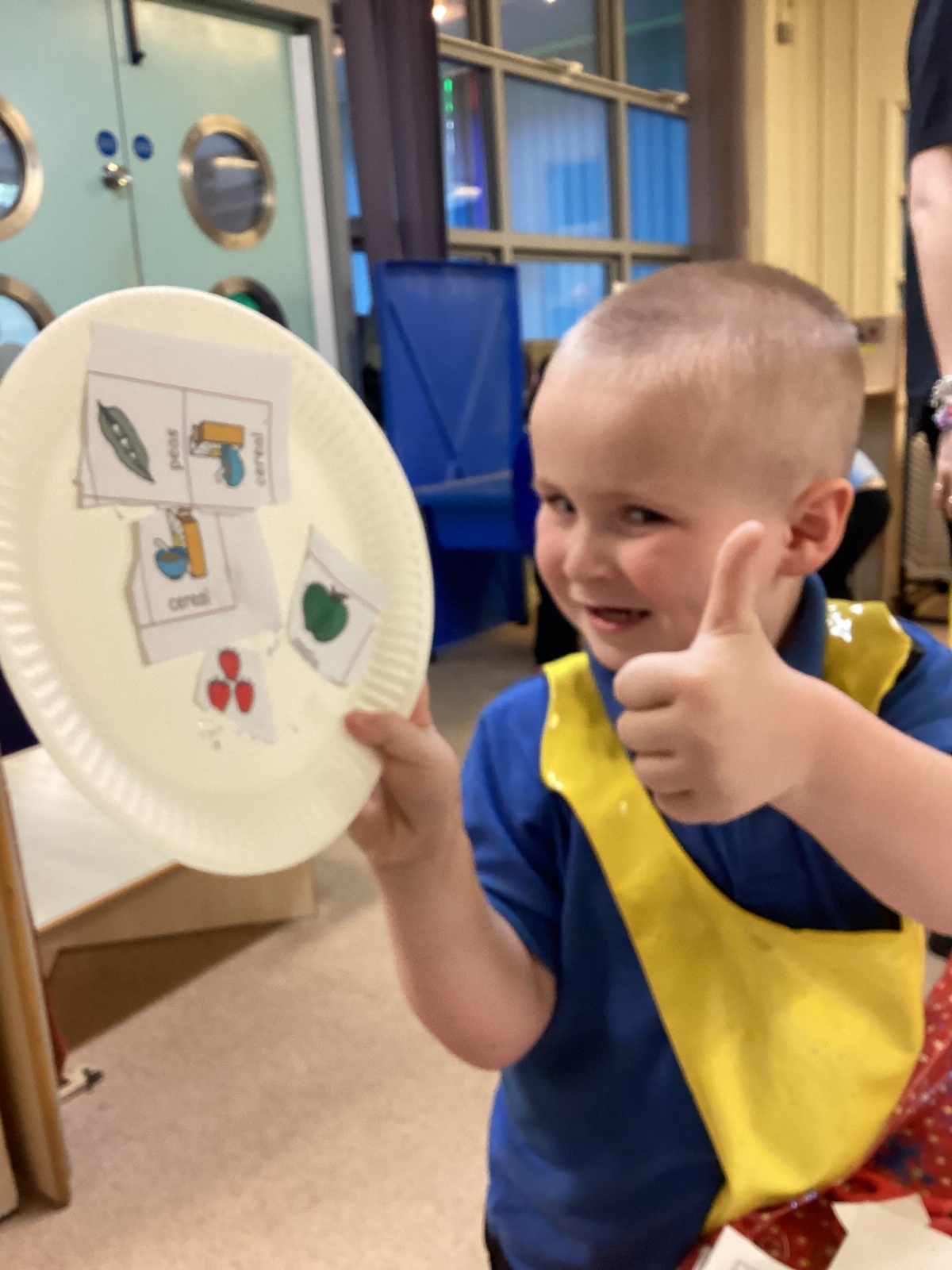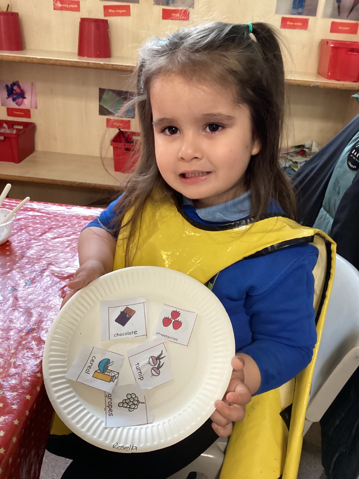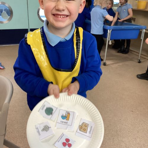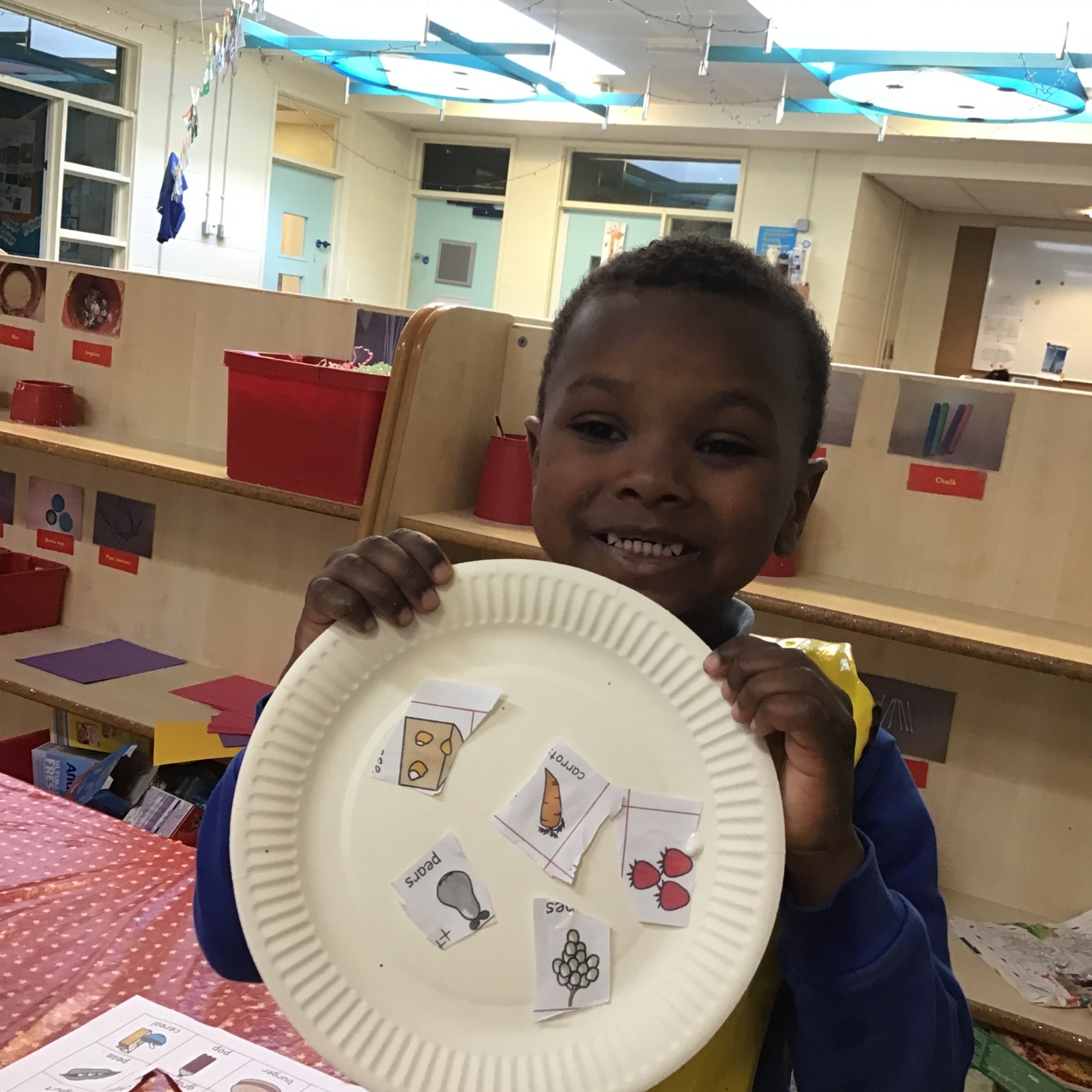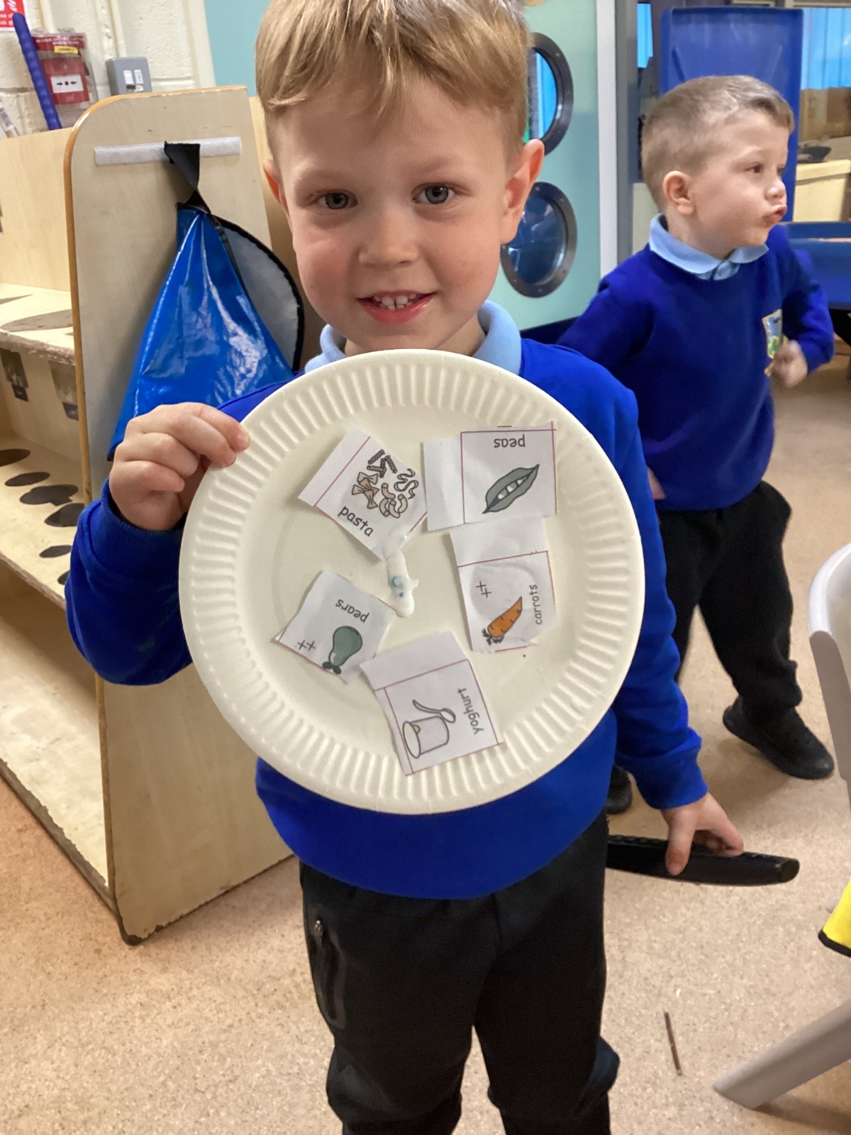 We have been practising our fine motor skills and food knowledge skills this week. We have been selecting healthy foods and cutting them out to stick onto our plates this week.