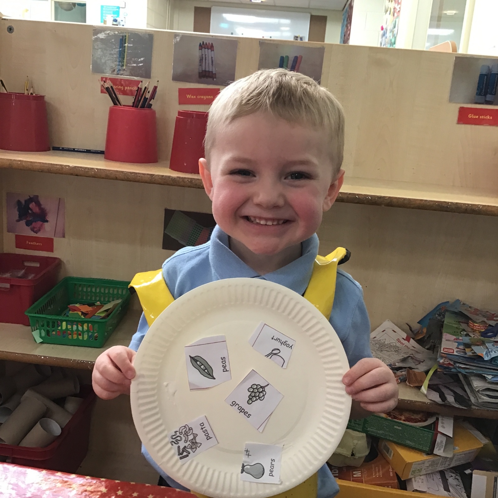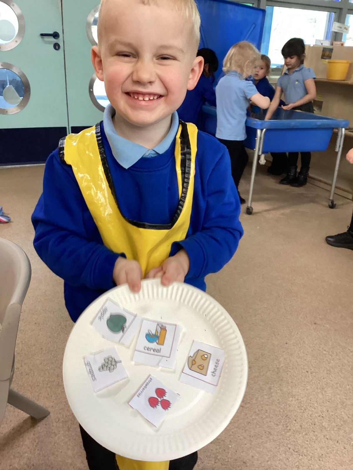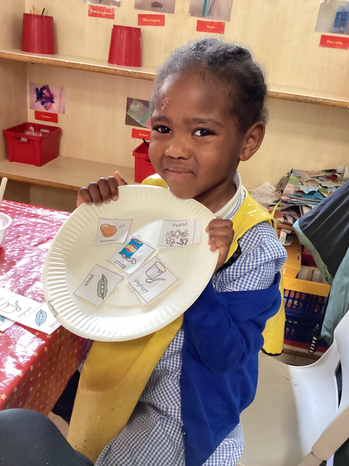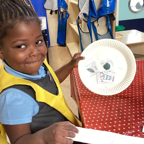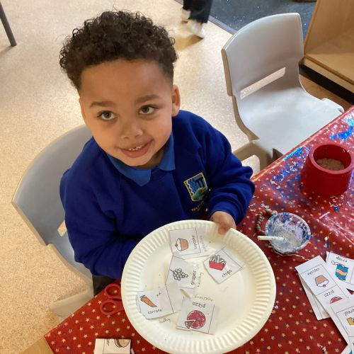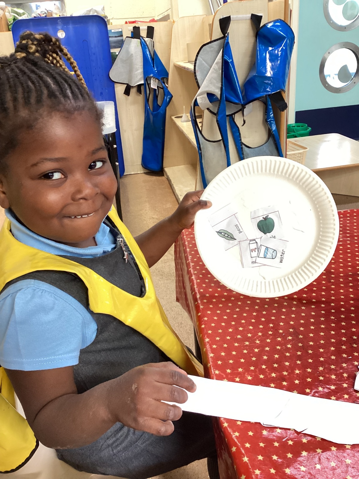 We have been practising our fine motor skills and food knowledge skills this week. We have been selecting healthy foods and cutting them out to stick onto our plates this week.