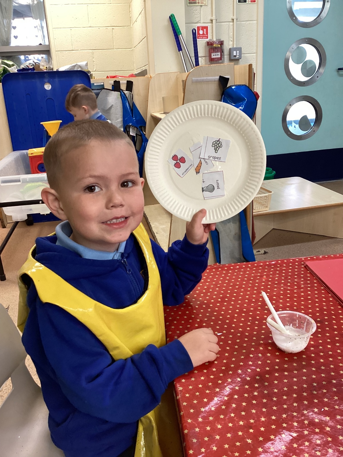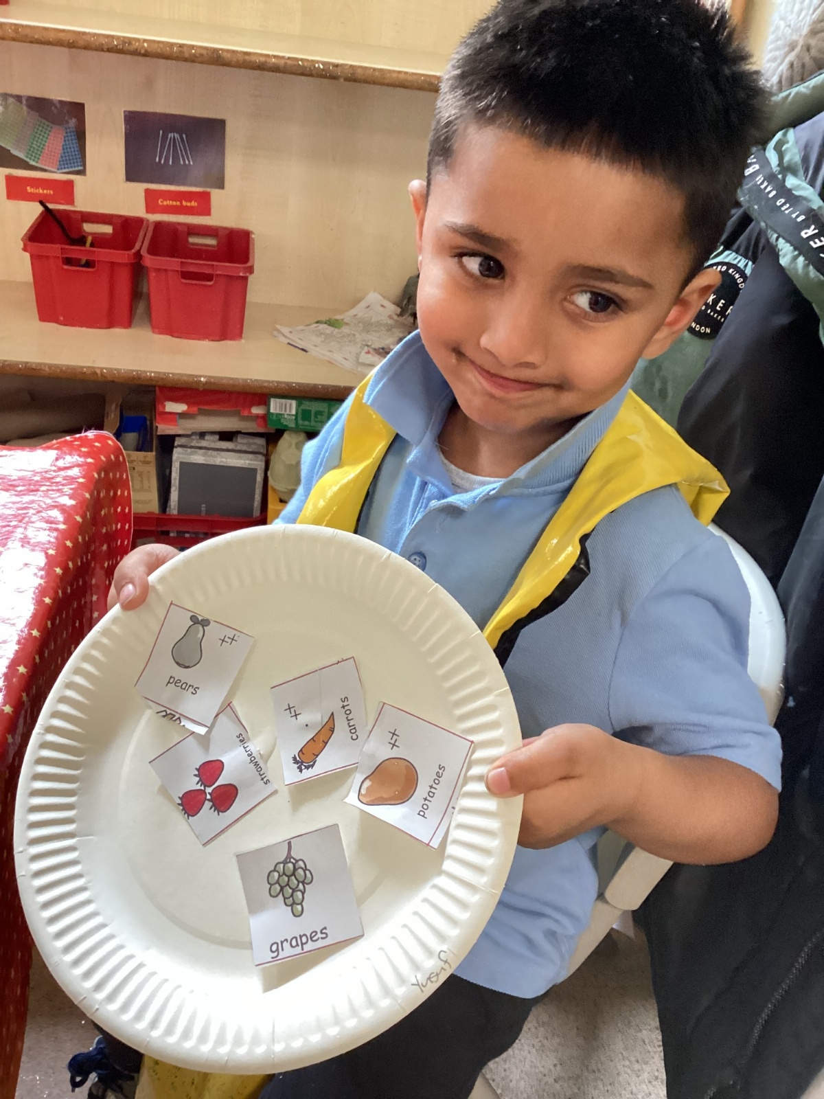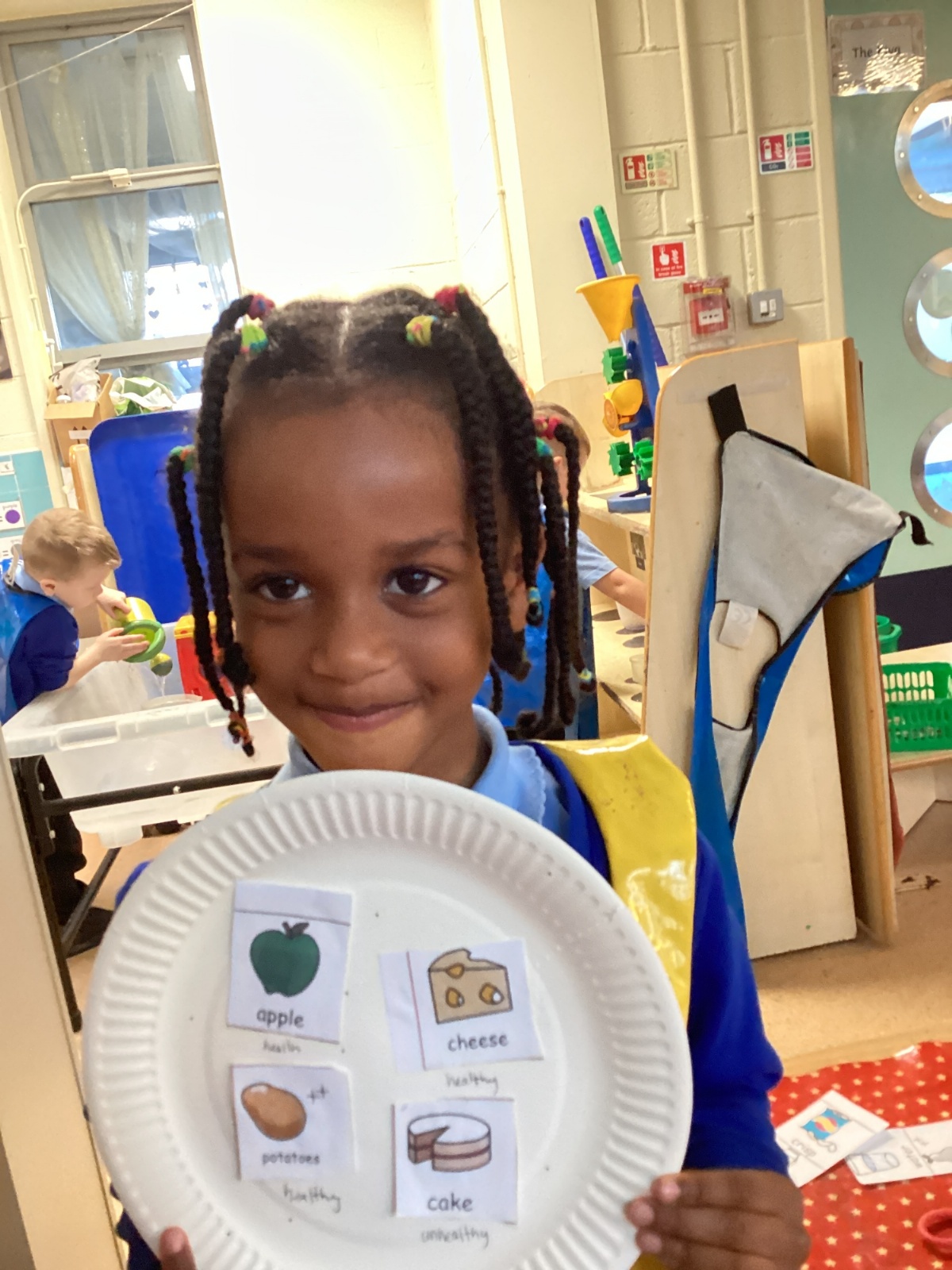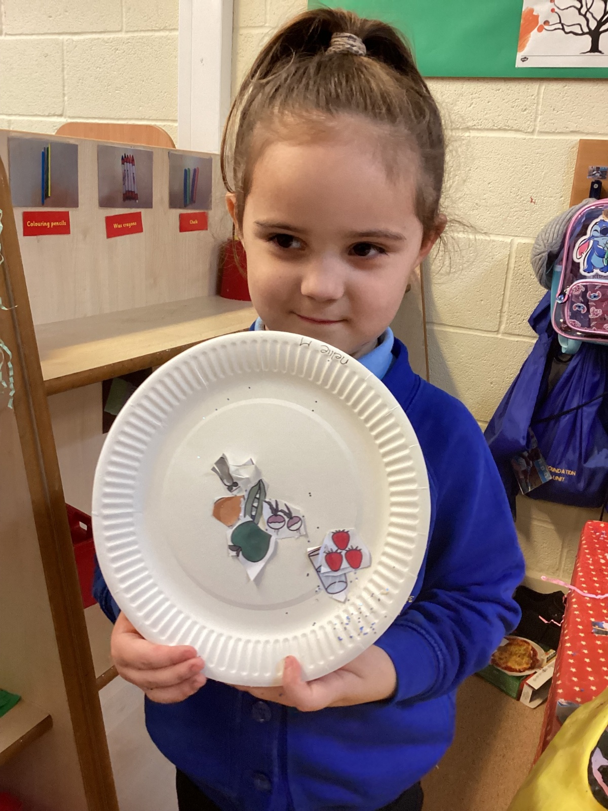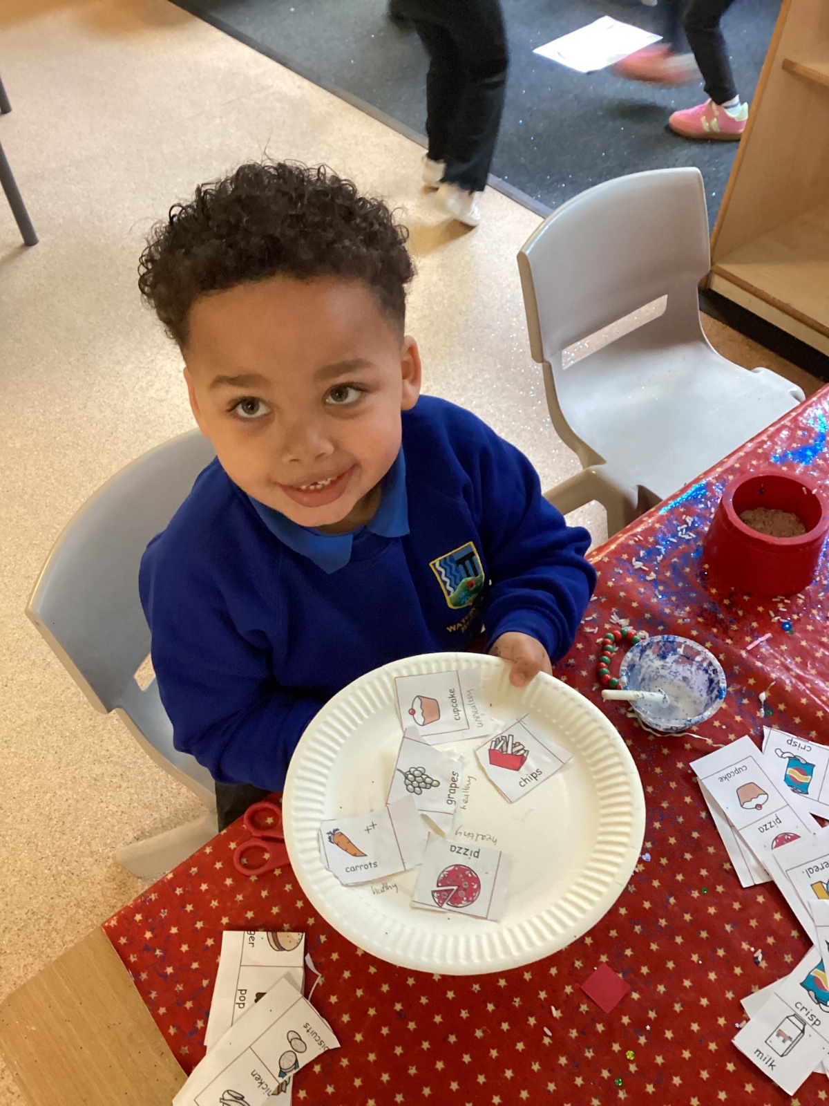 We have been practising our fine motor skills and food knowledge skills this week. We have been selecting healthy foods and cutting them out to stick onto our plates this week.