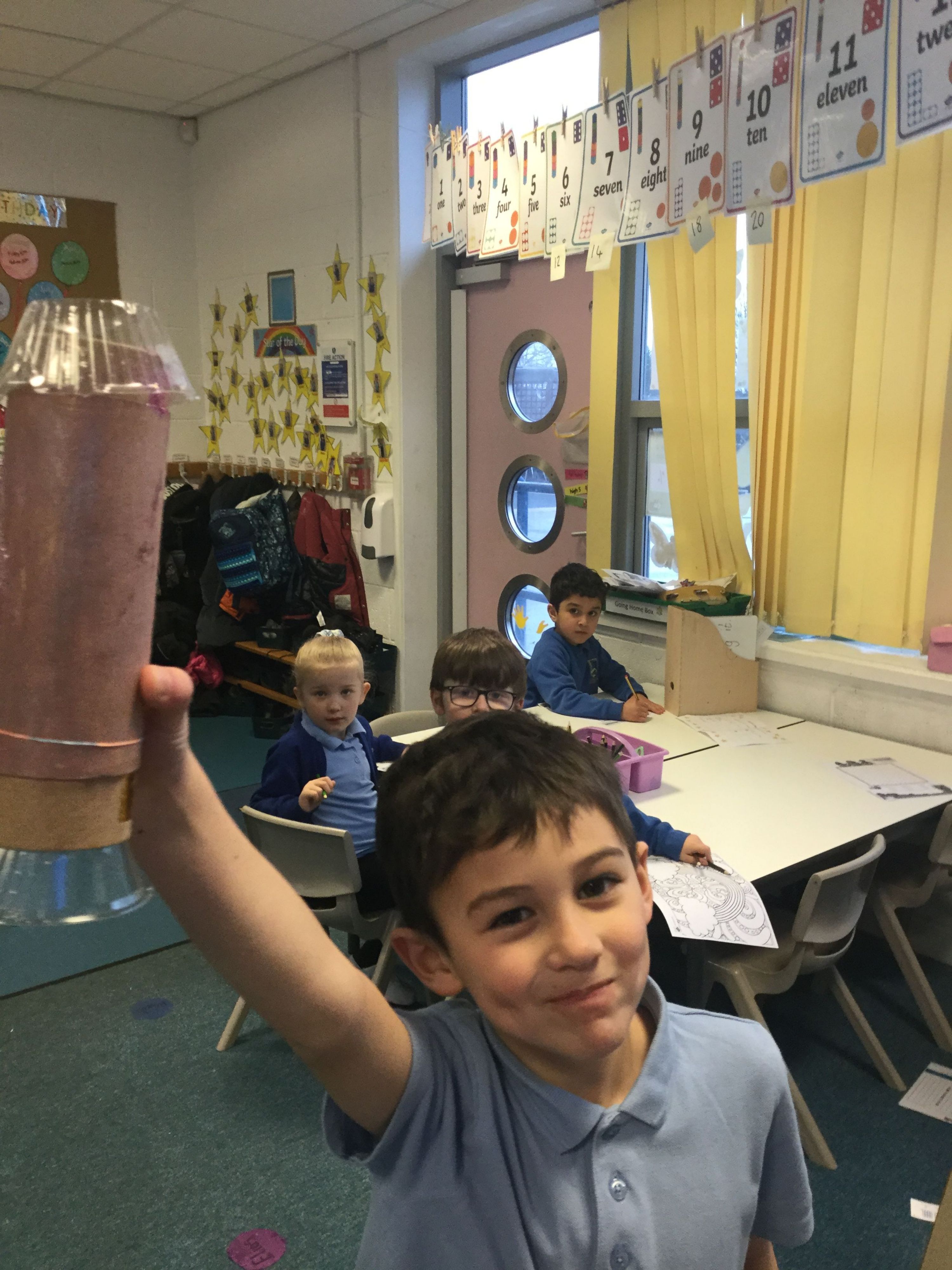 Quinn has been measuring and made a fantastic rocket out of recycled material.